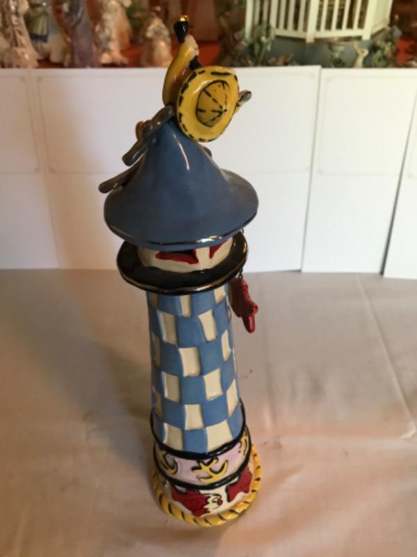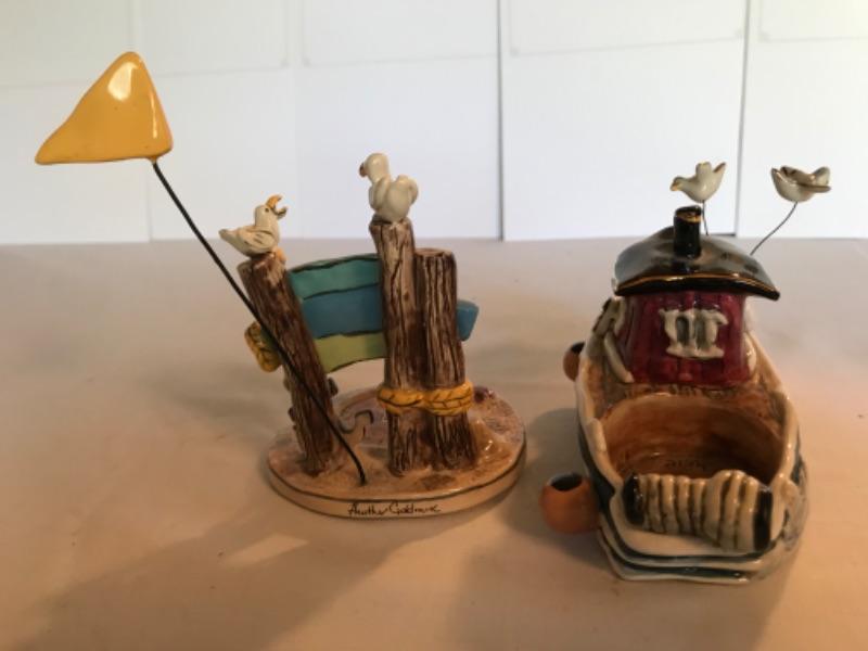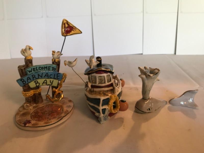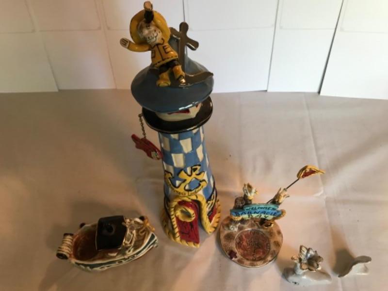 Welcome to Barnacle Bay tea light holder, Seahorse Shores Lighthouse, missing base, measures 7-1/4” tall. Dreamer Sailboat tea light holder, Sea Turtle, Seahorse and Crab tops open to hold a tea light candle. All pieces are signed Heather Goldminc