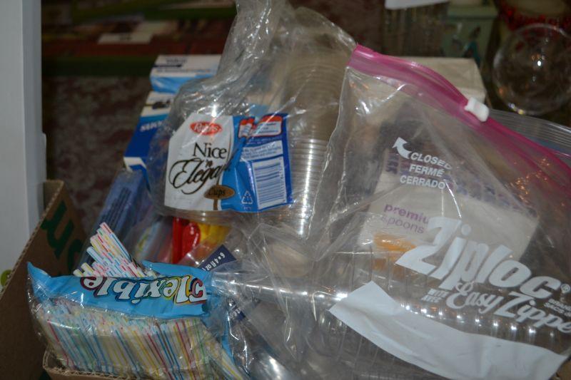 BOX OF DISPOSABLE CUPS, STRAWS, ETC