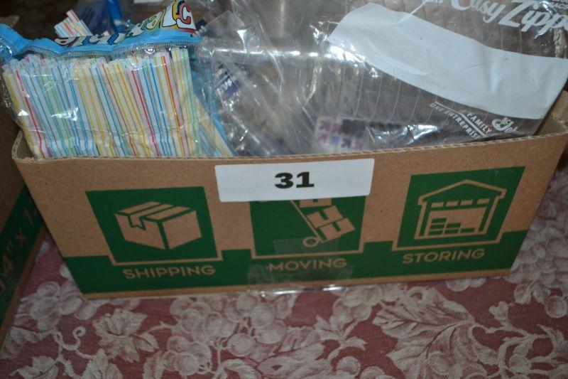 LOT 31 BOX OF DISPOSABLE CUPS, STRAWS, ETC