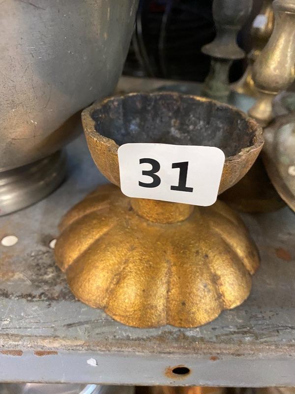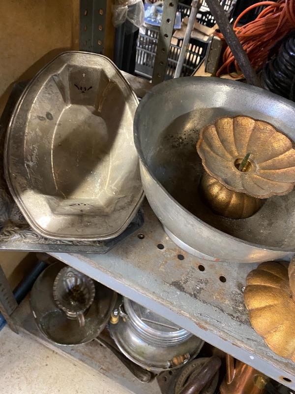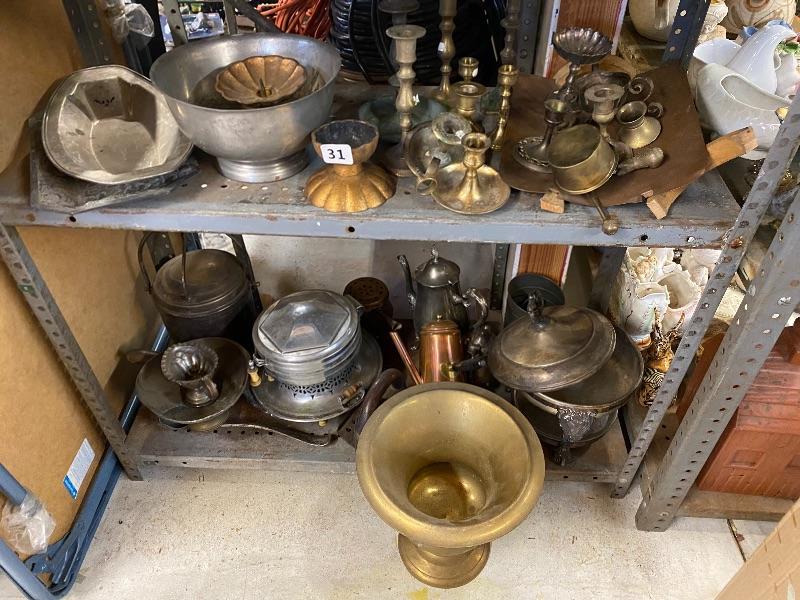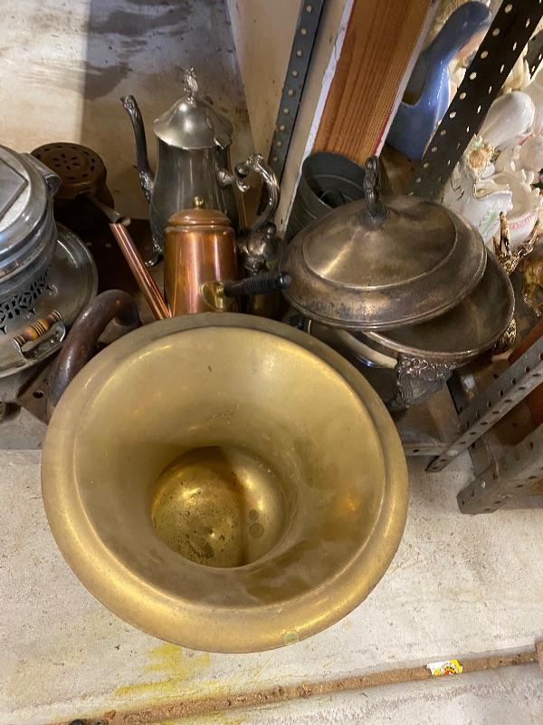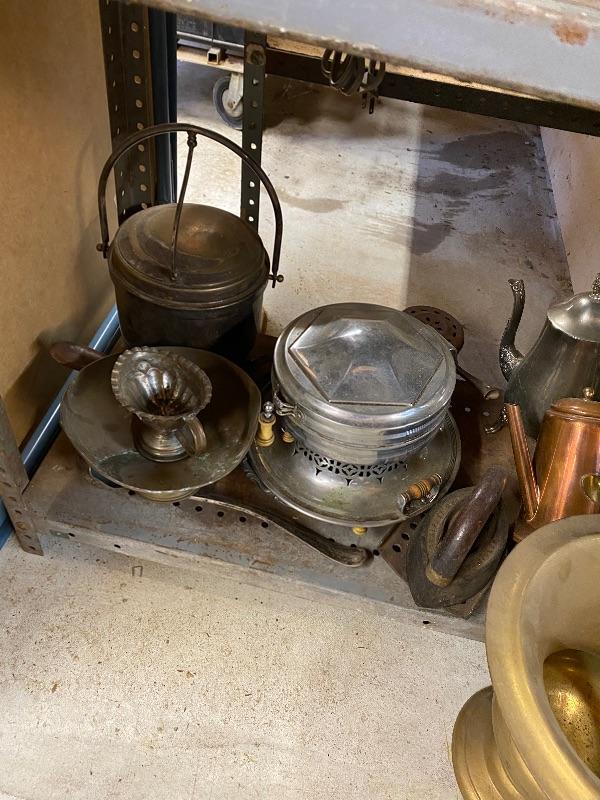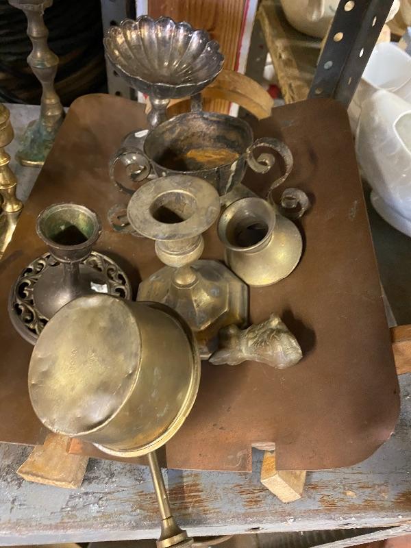 Spittoon, brass/metal candlesticks, assorted tin/brass/silver plated bowls, candy dishes, teapots. and decor.