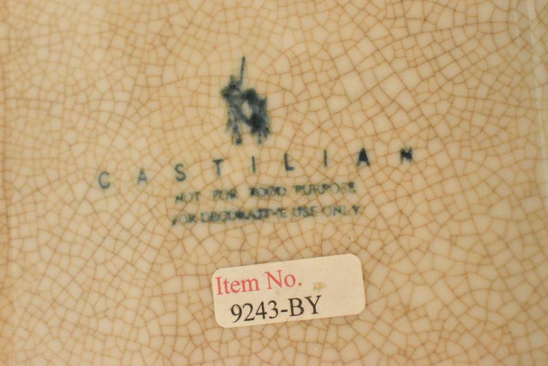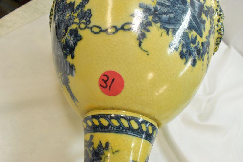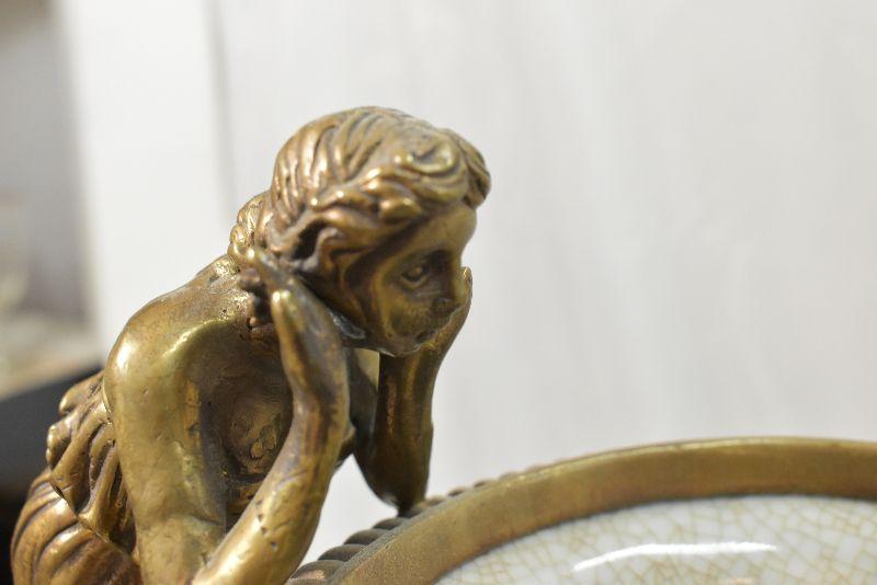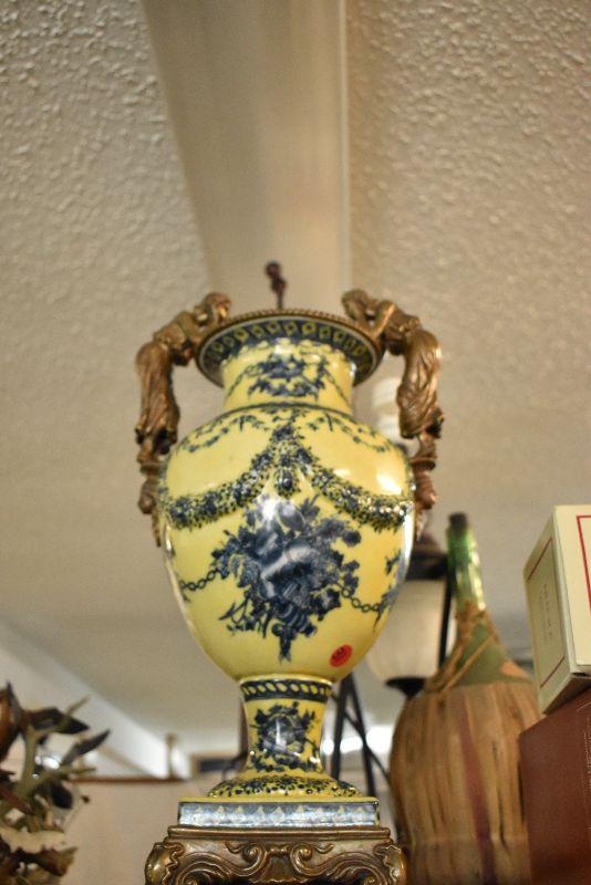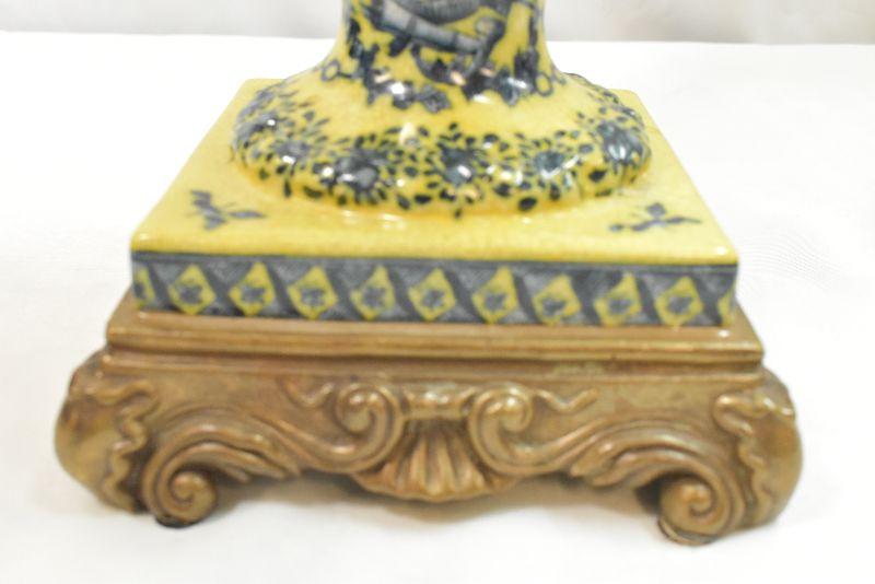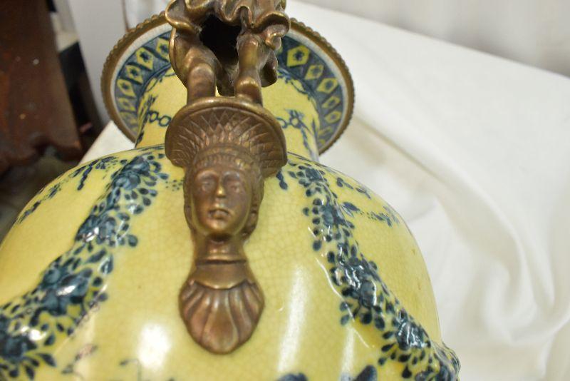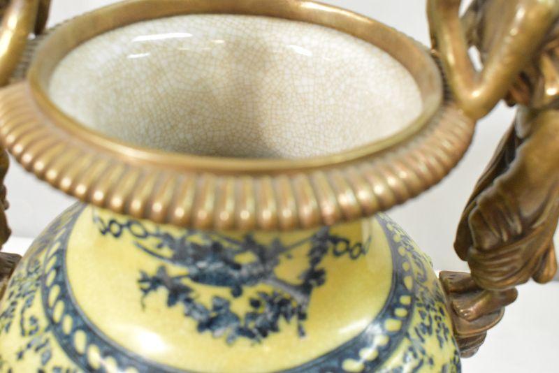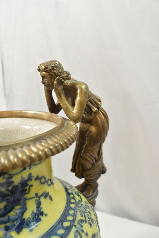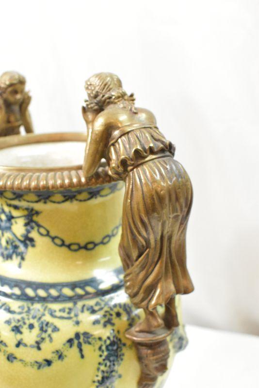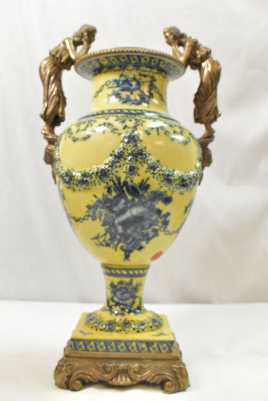 Castilian Urn in yellow and blue with a bronze base and rim. The handles are two young ladies, also in bronze, peering into the urn. They are standing on a bronze head of a woman. Very elegant, no chips.