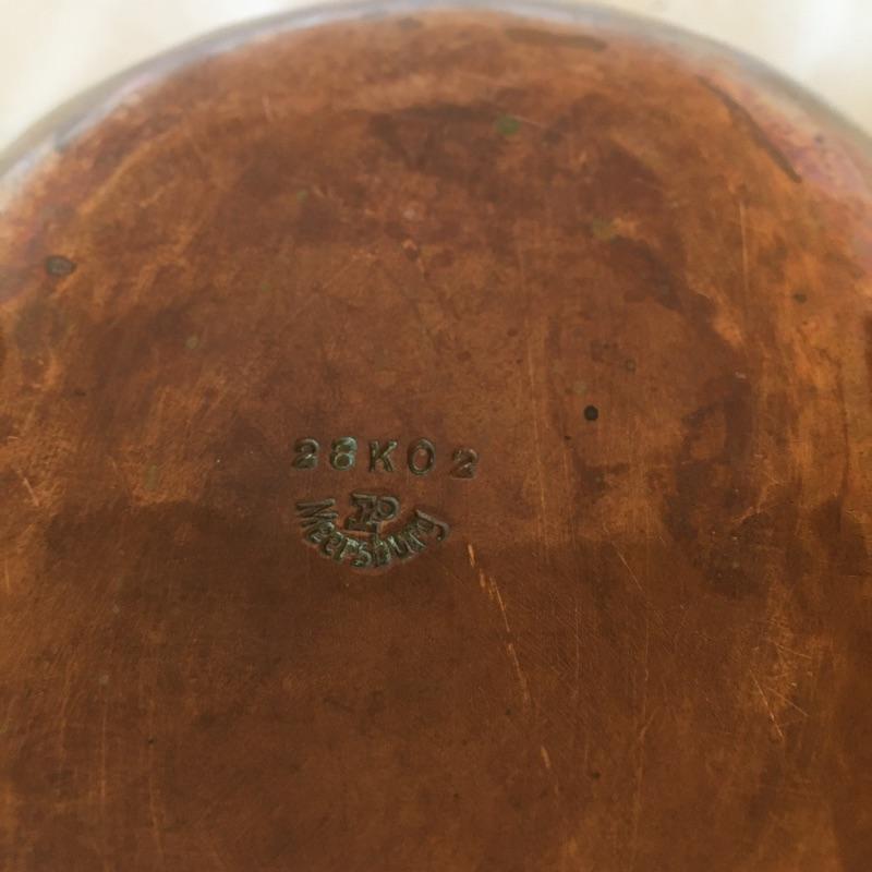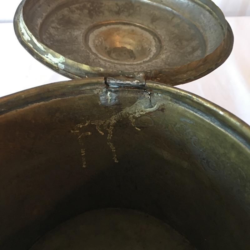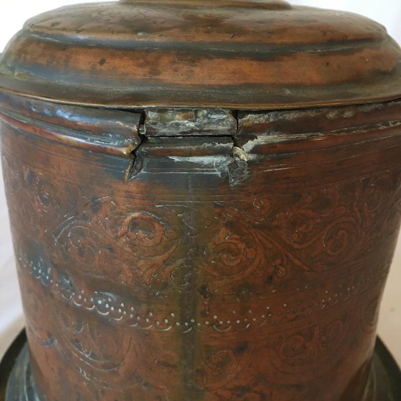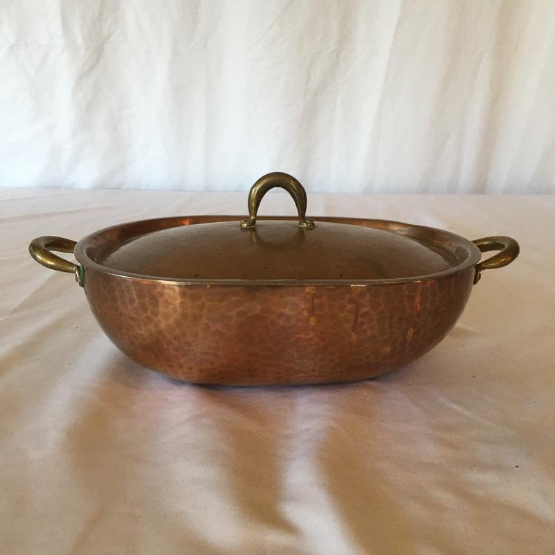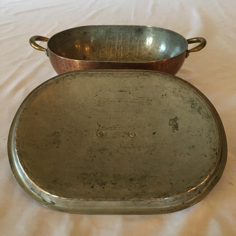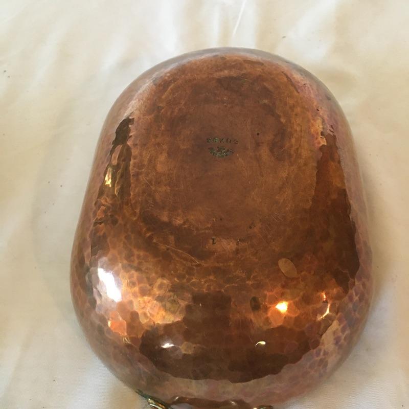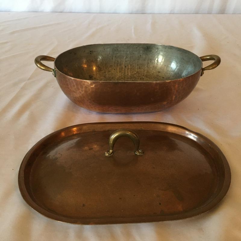 This antique duo includes a Meersburg hammered copper serving dish with lid, brass handles. This piece has the Meersburg mark impressed. Karl Raichle Meersburg studied at the Bauhaus before starting the Forge Karl Raichle in Meersburg in the 30s. Lot also includes a copper canister with hinged lid. Both pieces are in good condition and have that lovely aged copper patina. The canister has a little wear at the hinge, see pictures.