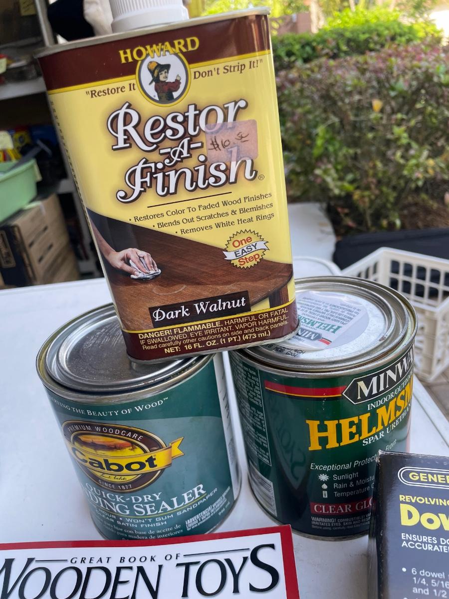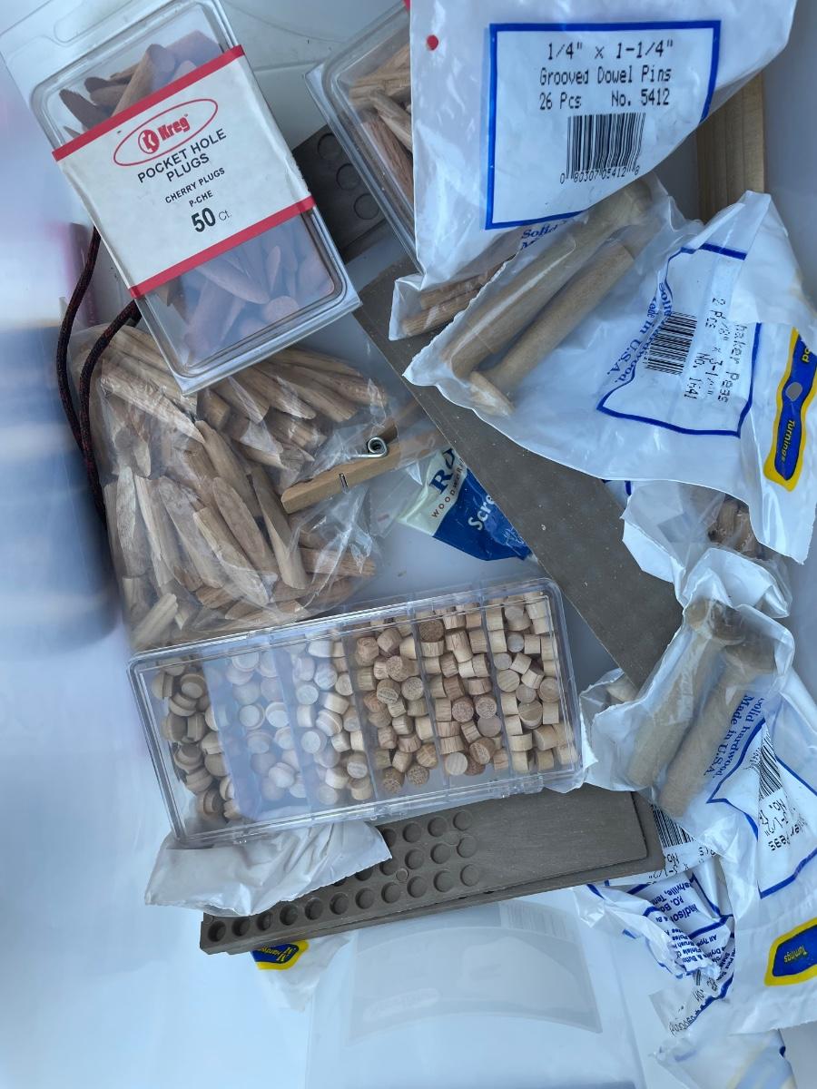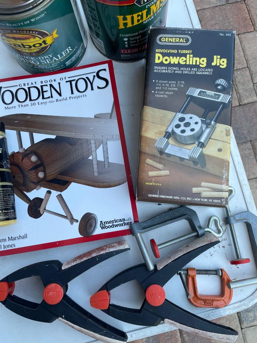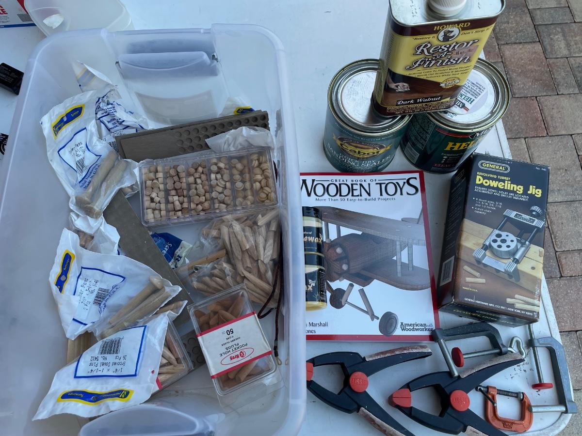 Assortment of dowels, plugs and pins, assorted clamps, General brand revolving turret doweling jig, a book on wooden toy making and wood finishing varnish, etc