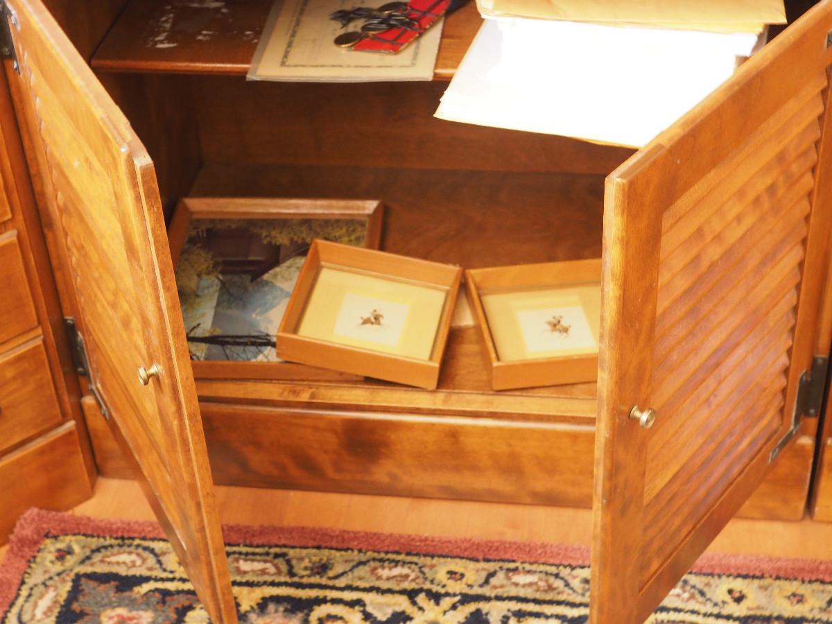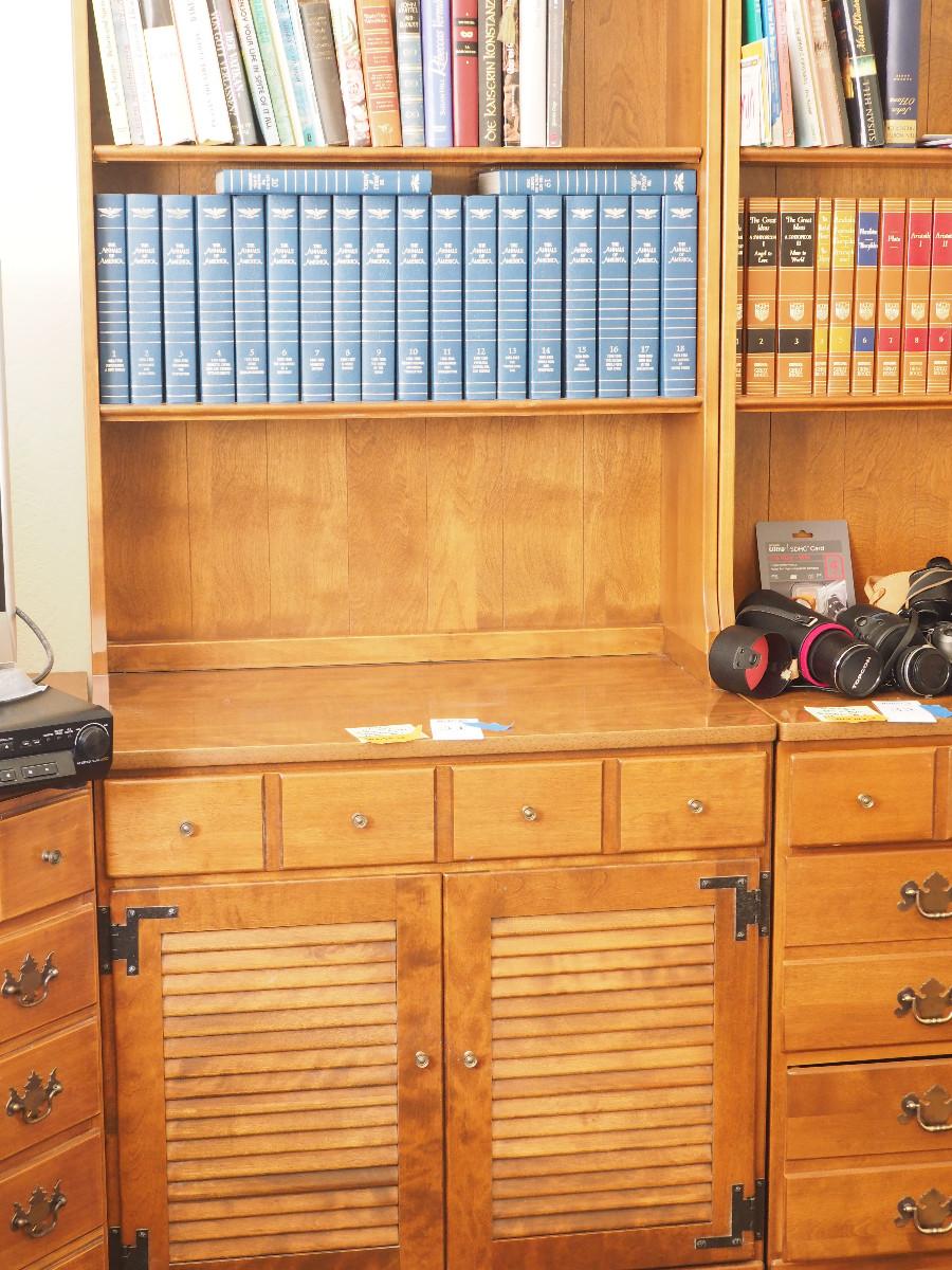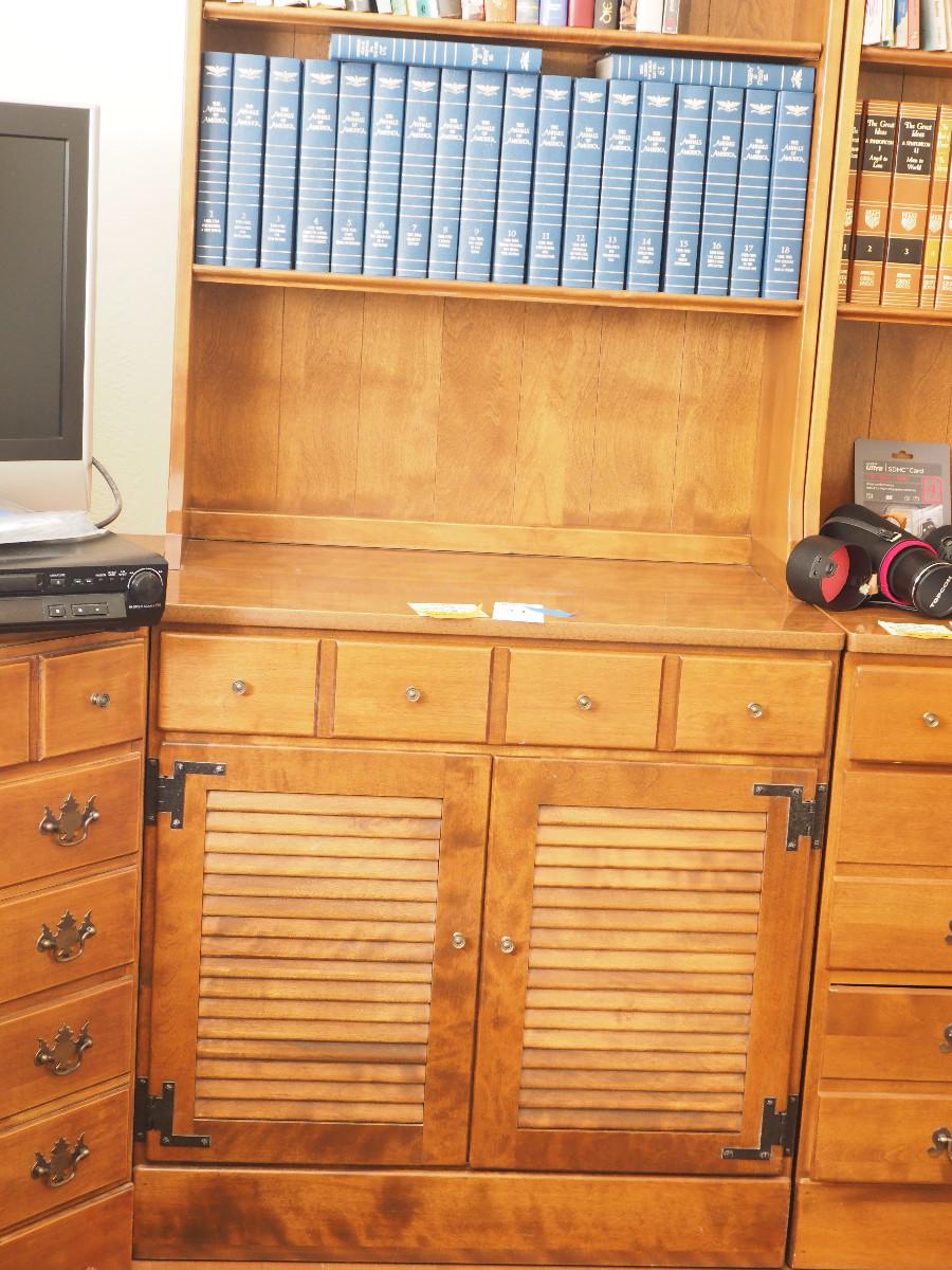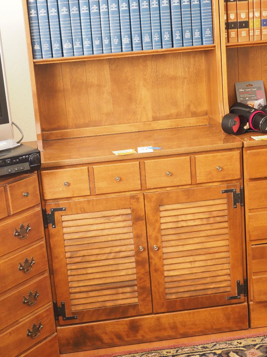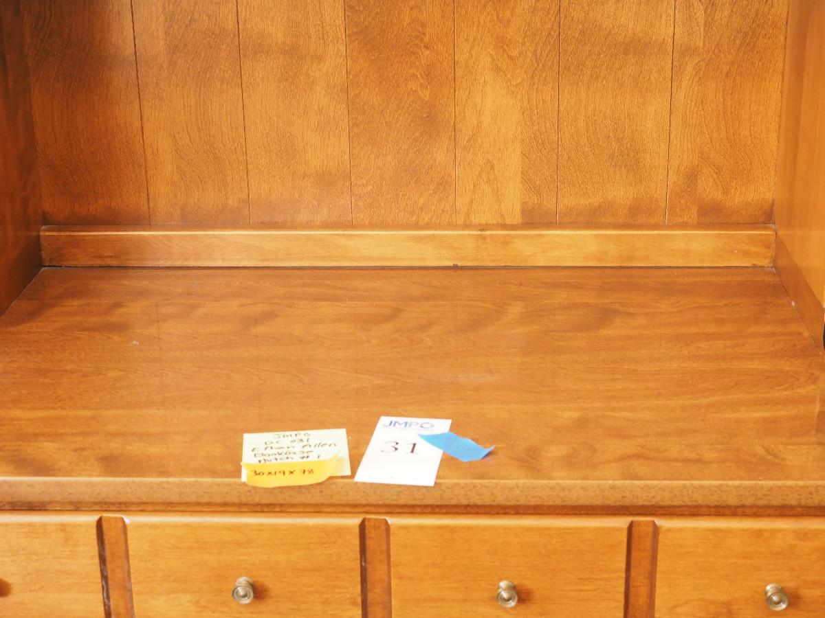 Lot 31 Ethan Allen bookcase hutch contents not included. :30 X 19 X 78" Single drawer Louvered door cabinet.