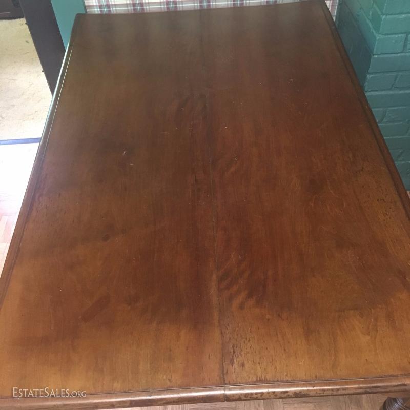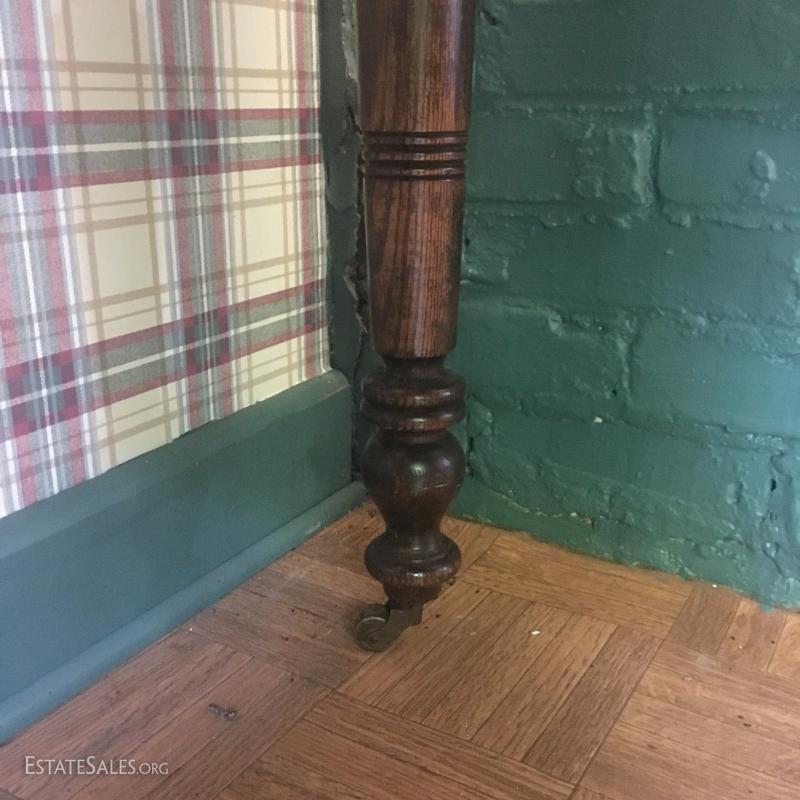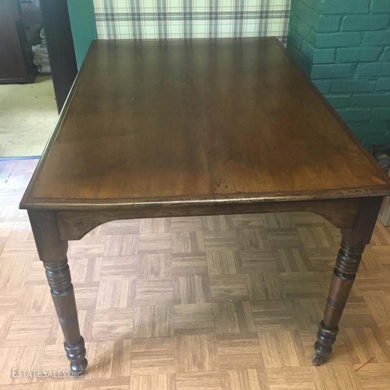 Rectangular Farmhouse style walnut table with turned legs on casters. Measures 57"l x 37"w x 29.5" h