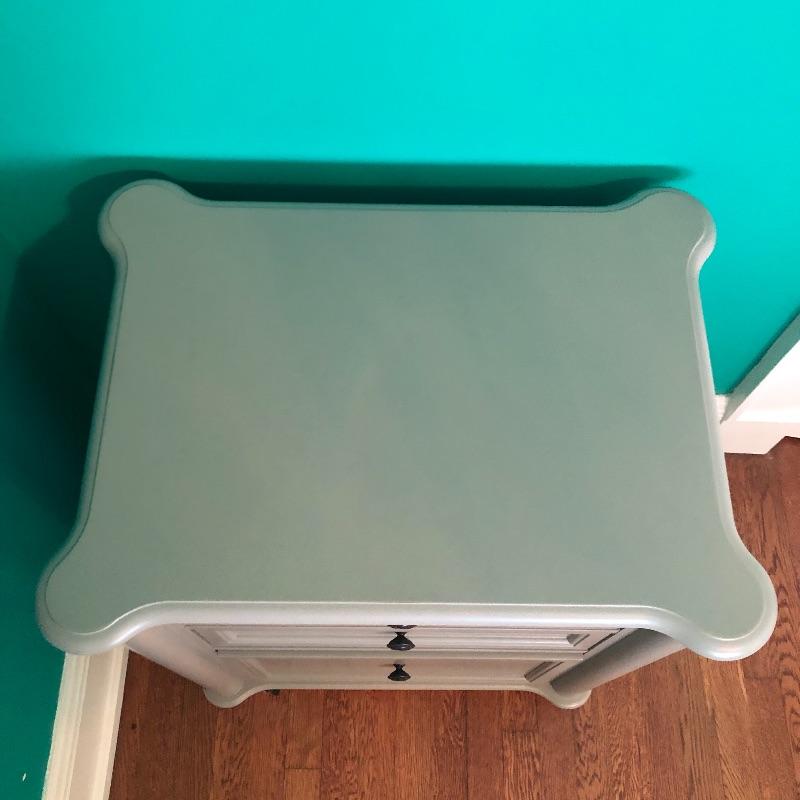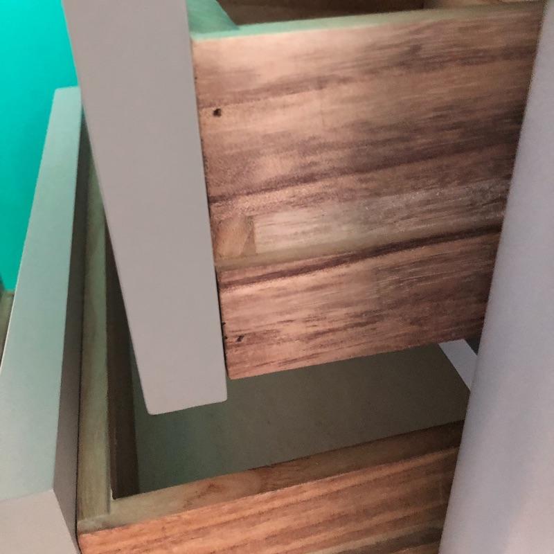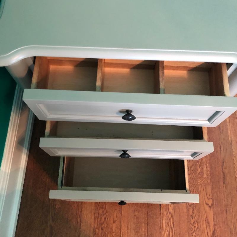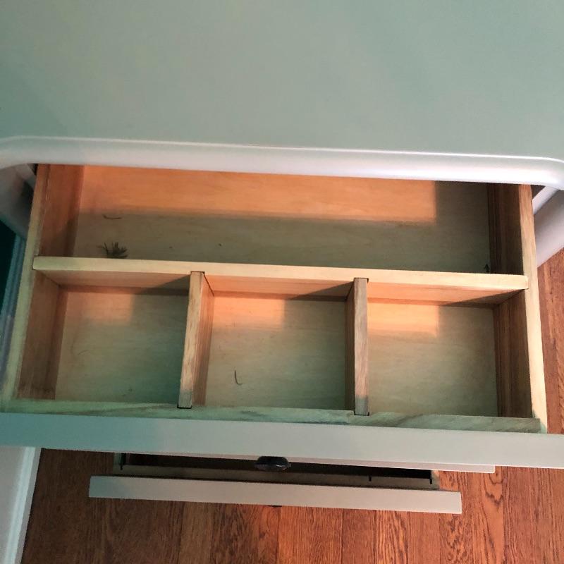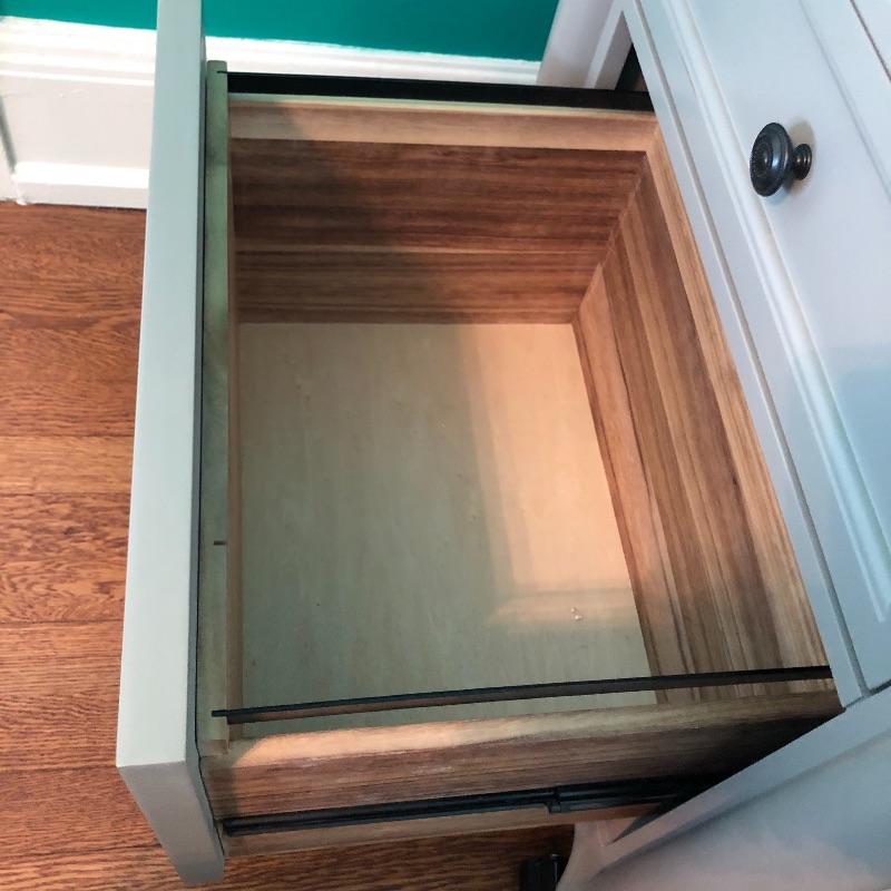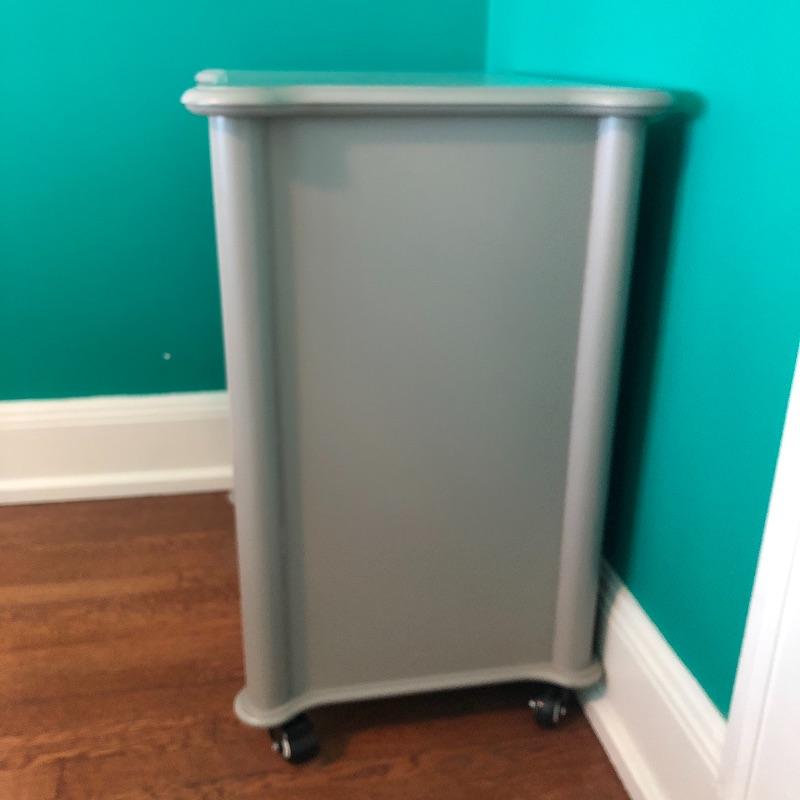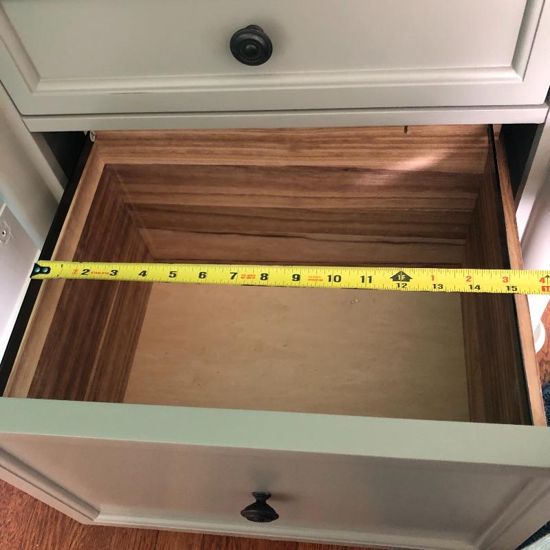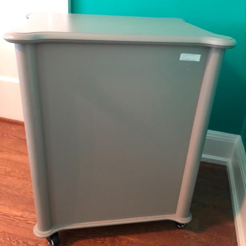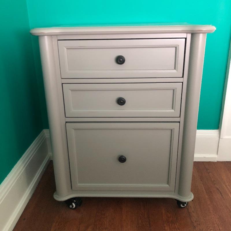 This filing cabinet has two drawers on top and the filing drawer on bottom. Cabinet is on casters for ease of movement. Cabinet measures 19” x 24.5” x 30.5” and is made of MDF. Item is up two flights of stairs.