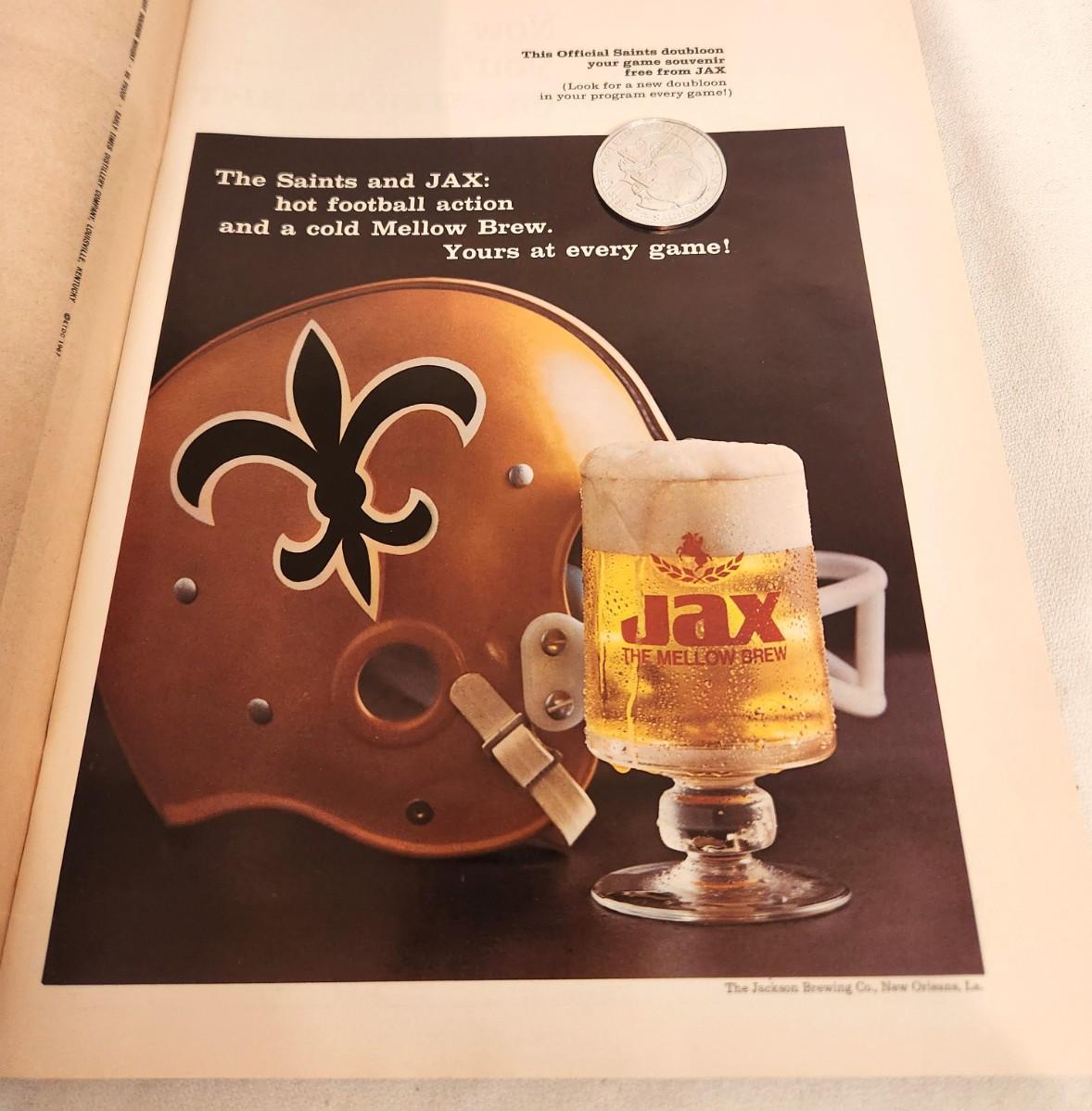 Excellent condition - even contains the original JAX Beer Doubloon - Saint vs. Cowboys - 12 Nov 1967. Saints were playing in Tulane Stadium.