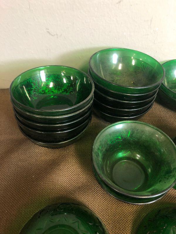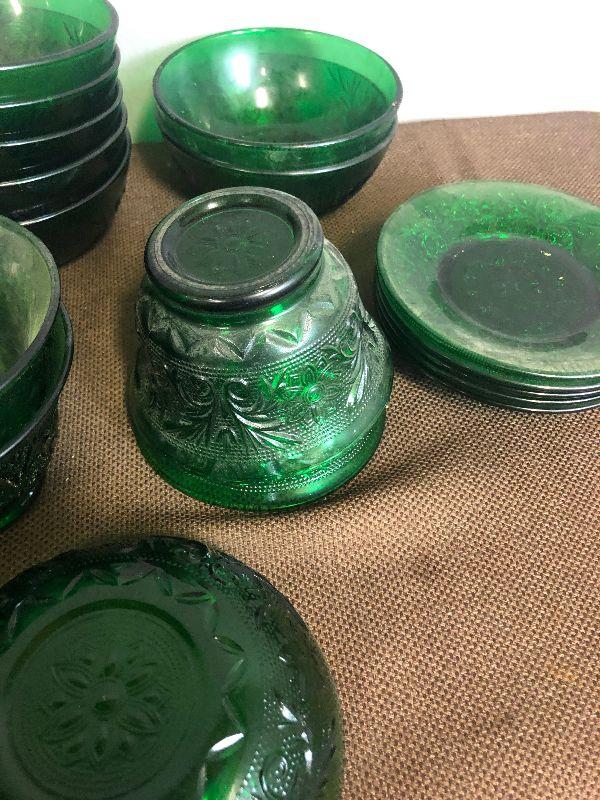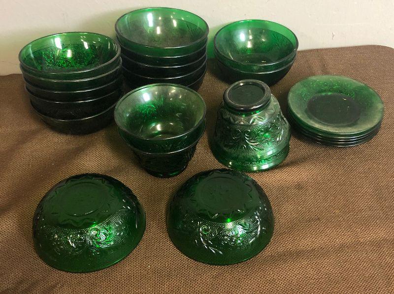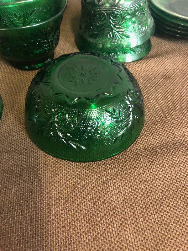 Lot# 31 Forest Green Sandwich Glass Bowls, cups, saucers