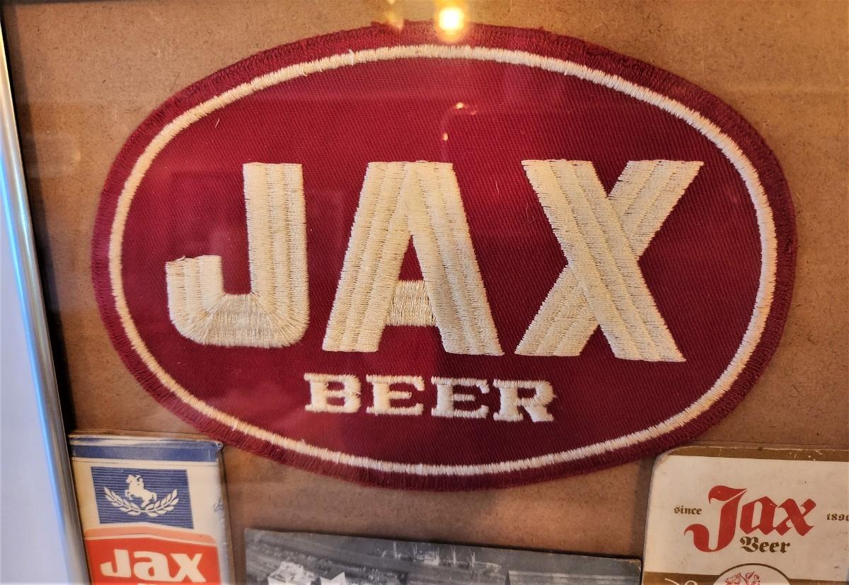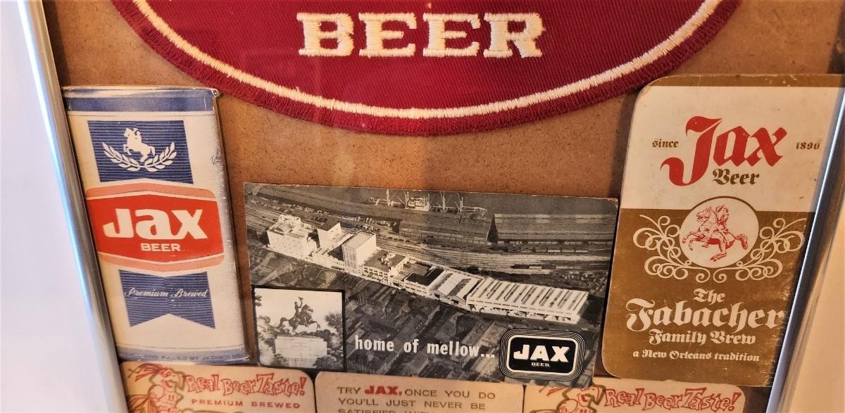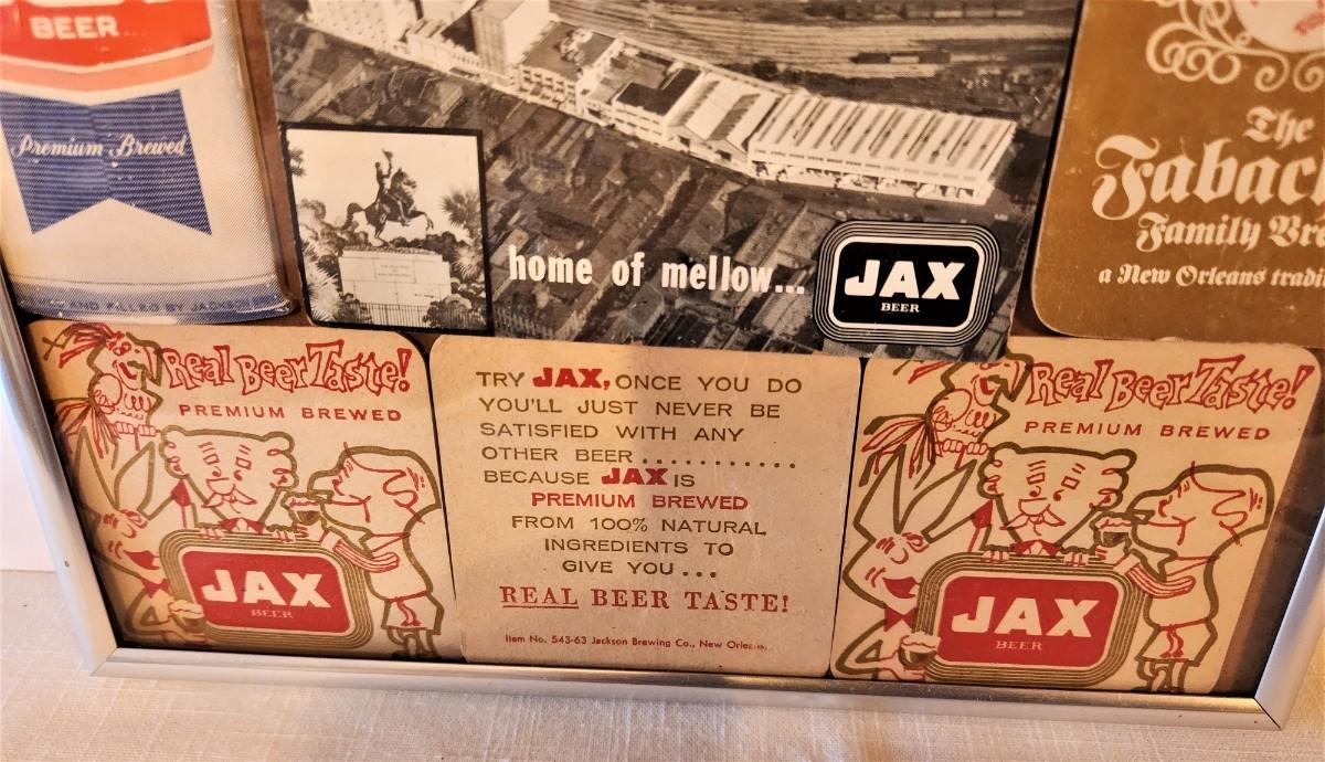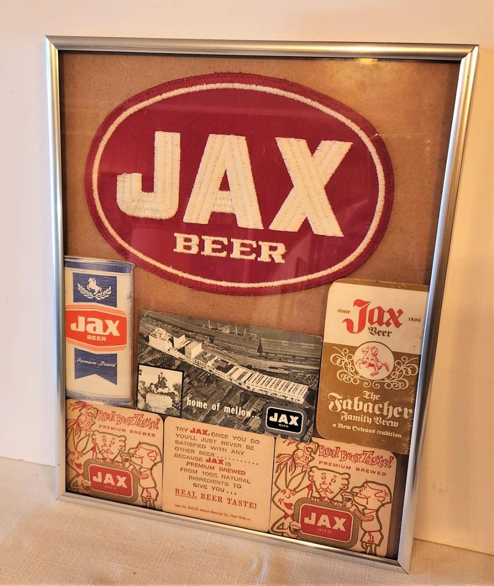 Framed JAX Beer memorabilia - cool old photo postcard of Jax plant, uniform patch, 2 Jax notepads, 3 bar coasters. Frame measures 11" wide, 14" tall.