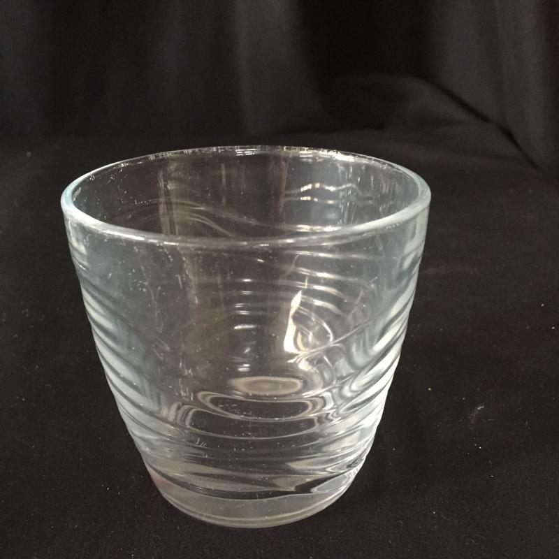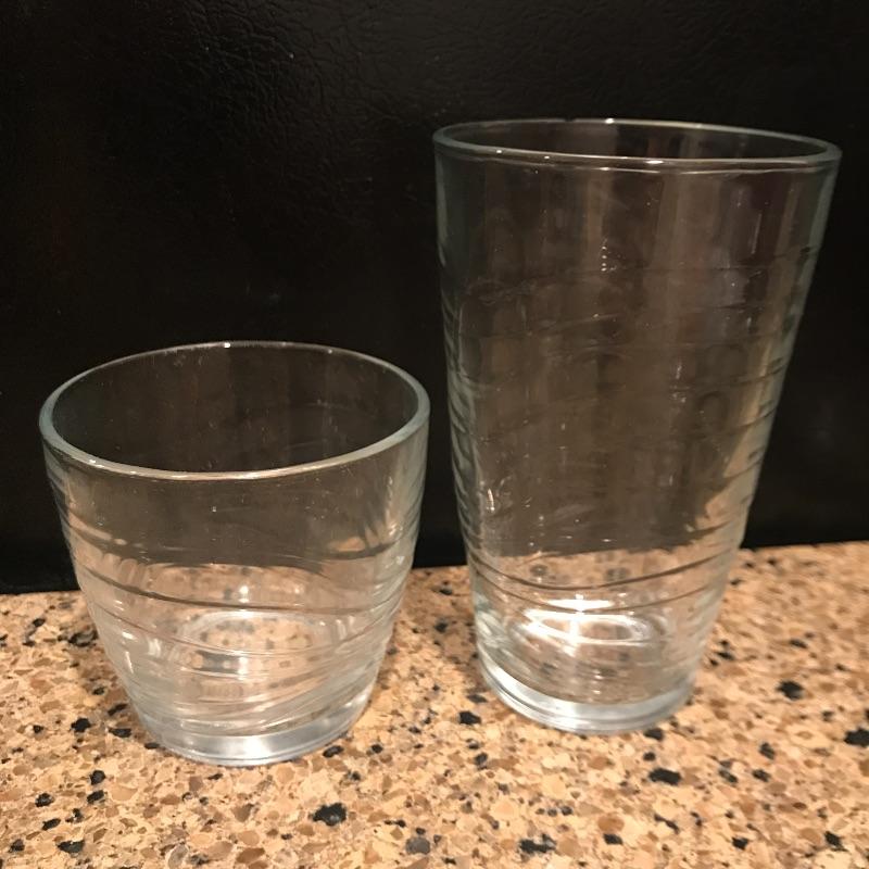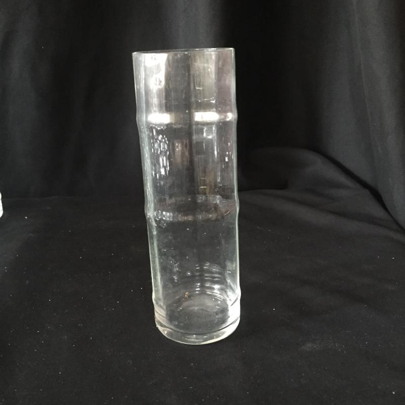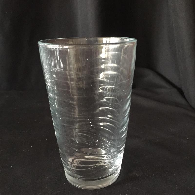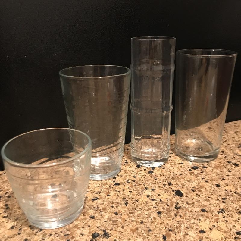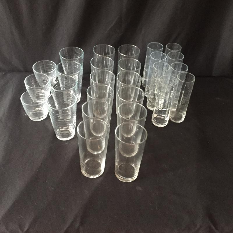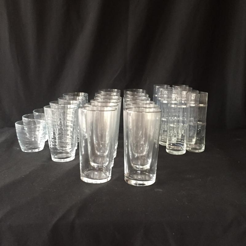 Selection of glassware includes 12 twenty ounce glasses. 8 tall skinny glasses that are shaped like bamboo and 7(4 large and 3 small) wave like design tumblers with the cursive L for Libby Glassware.