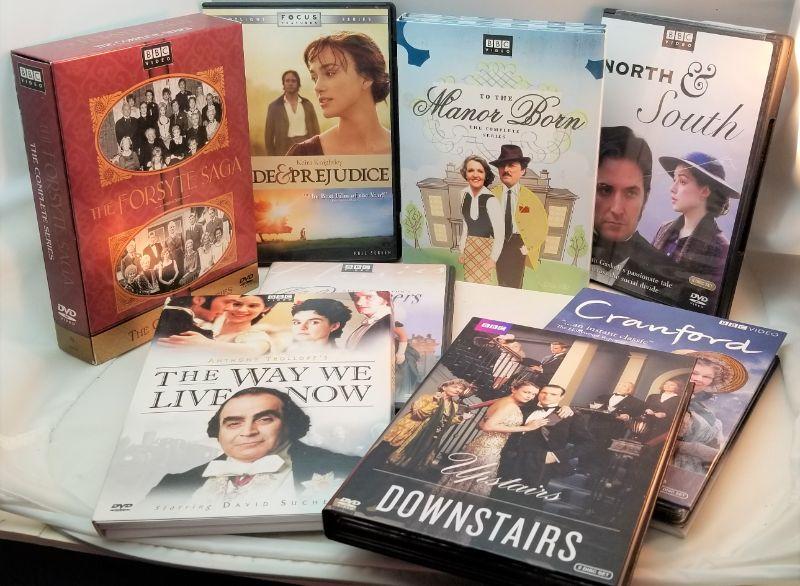 From my personal collection - you get all you see here - if you love British costume dramas like I do, I can tell you there is hours of enjoyment here. Here's what's included: Pride & Prejudice, The Way We live Now (full miniseries), The Buccaneers (miniseries adaptation of the great novel by Edith Wharton); Upstairs, Downstairs (the remake); Cranford (the entire miniseries with Judi Dench); The Forsythe Saga - the entire series - hours of viewing); North & South (entire miniseries); and To the Manor Born (takes place in contemporary times but a great British comedy that pits Old Money against New Money). Complete and in good condition. I've enjoyed them and it's time to pass them on. These were all purchased new, but I'm selling them with no reserve.