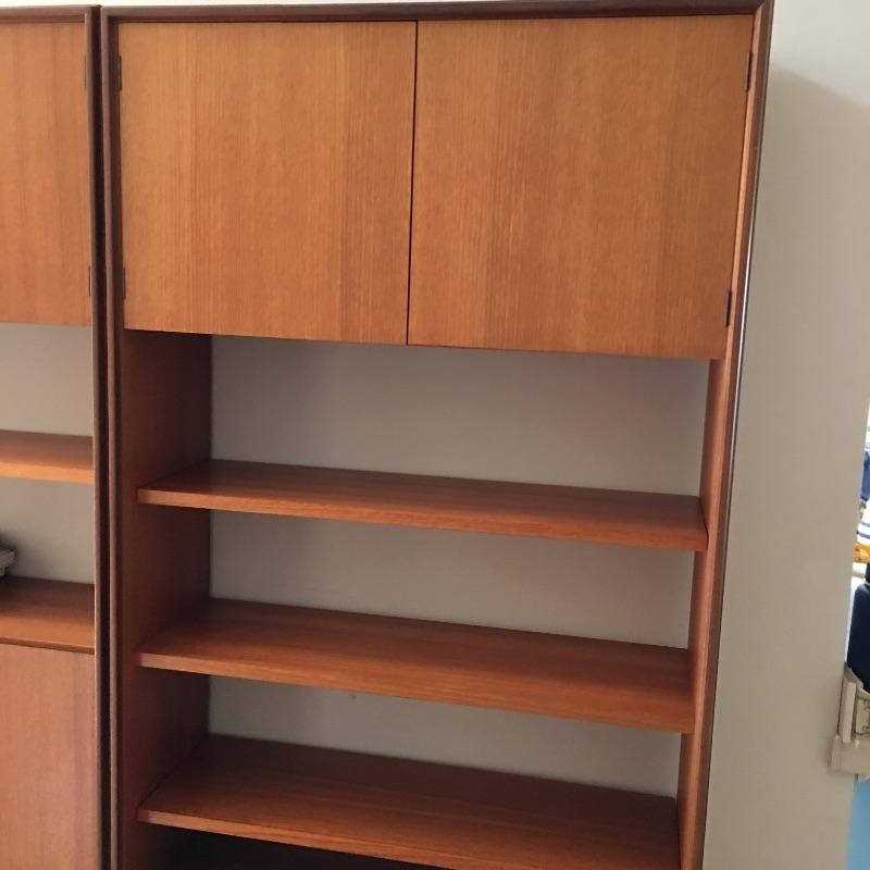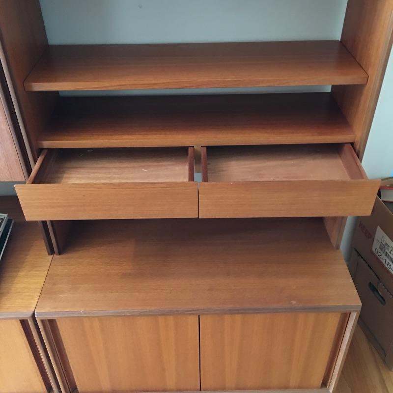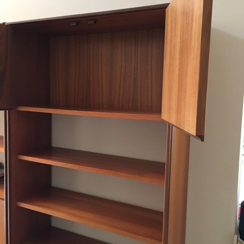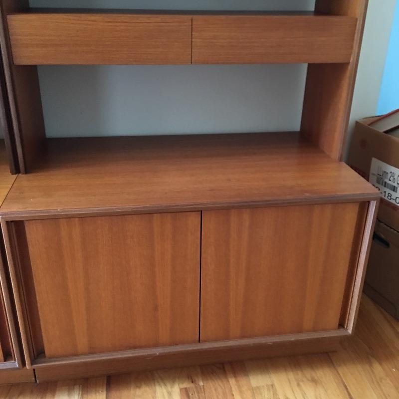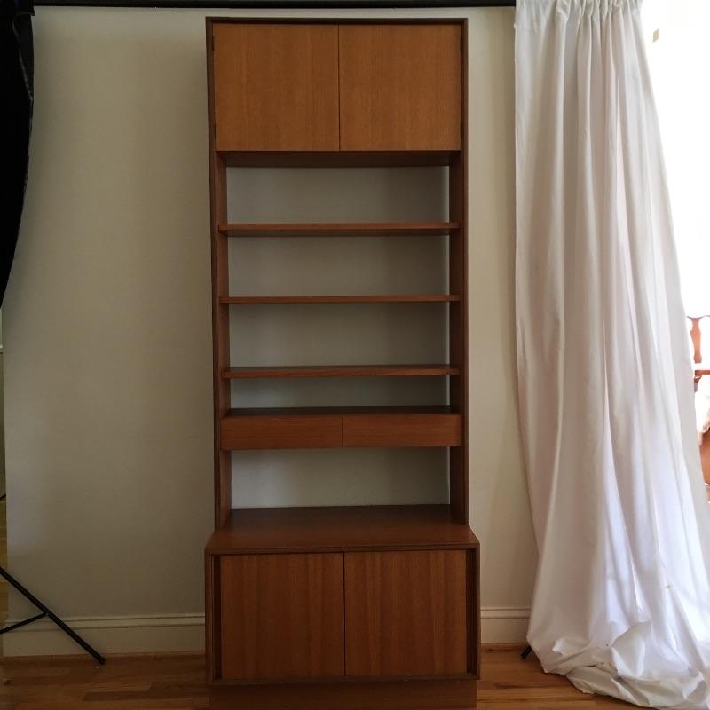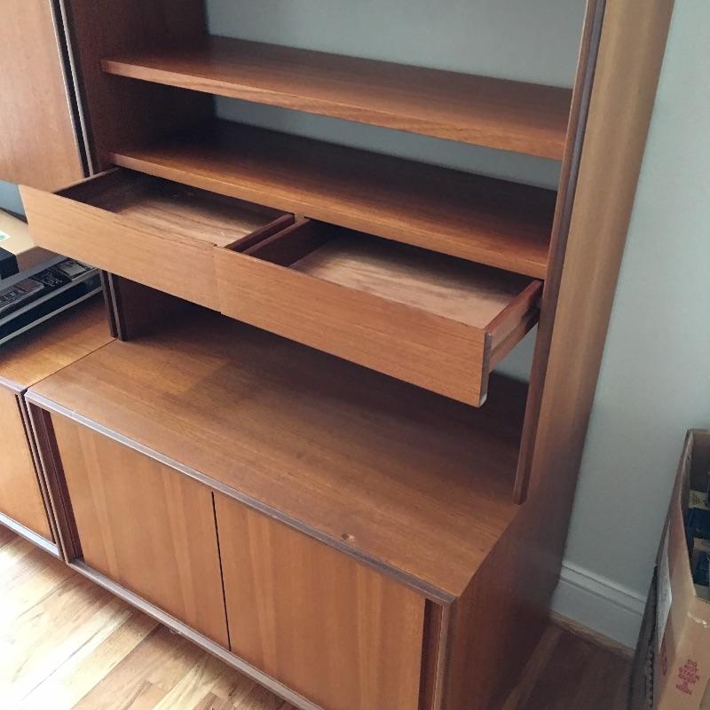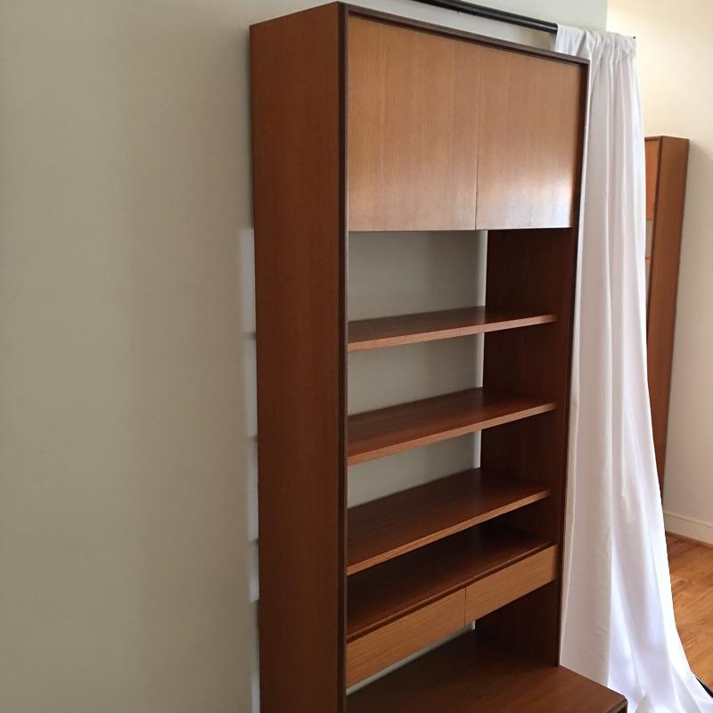 G-Plan open bookcase in teak. Stunning G-Plan MCM open bookcase with closed storage on top and bottom with drawers above and two shelves that are removable. This bookcase is in great shape but has one place where it has been dented, see pictures. Don’t miss out on this stunning MCM bookcase. Bookcase measures 18” x 30” x 78”. This bookcase has a matching bookcase and desk bookcase in lots 36 and 124.