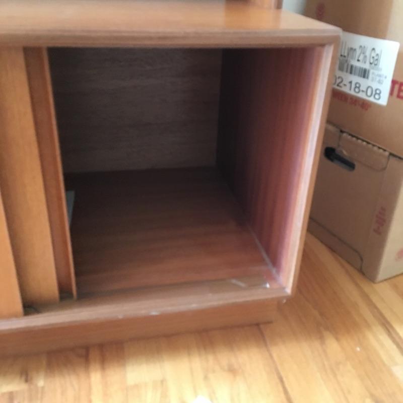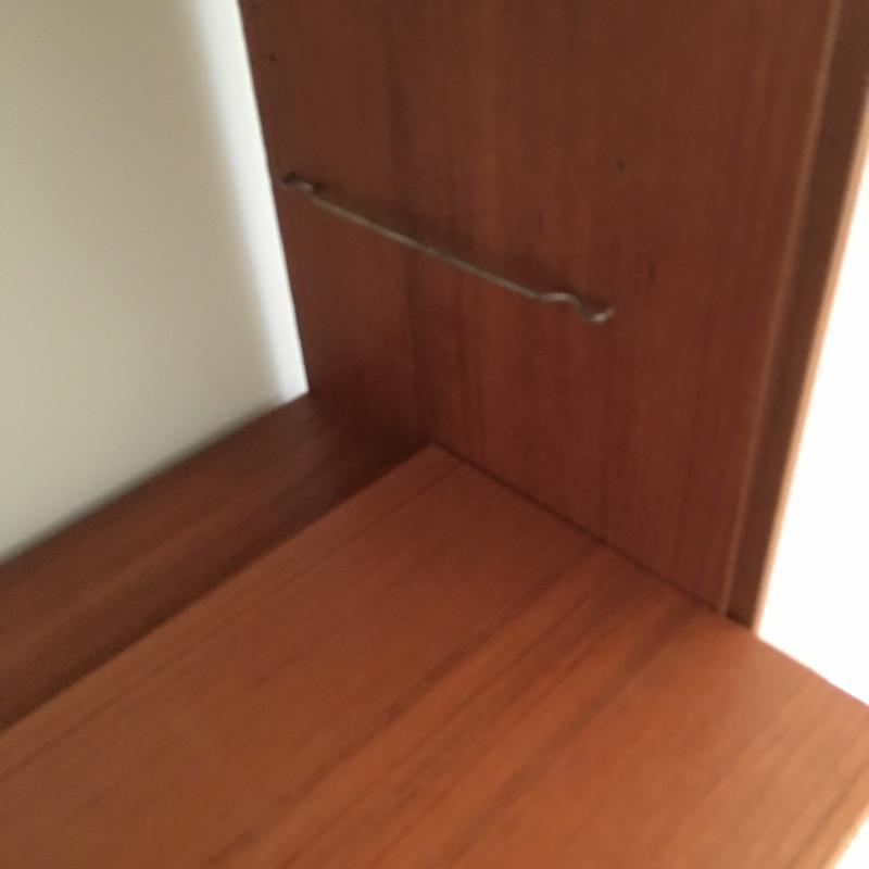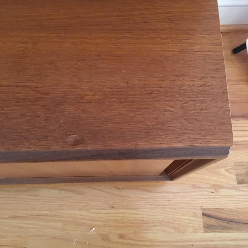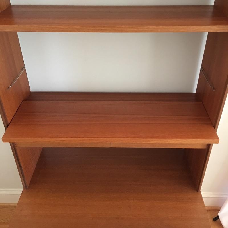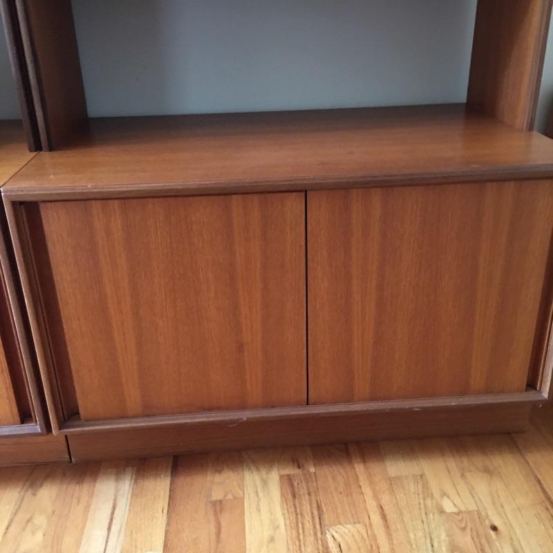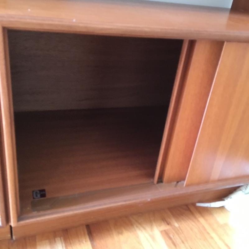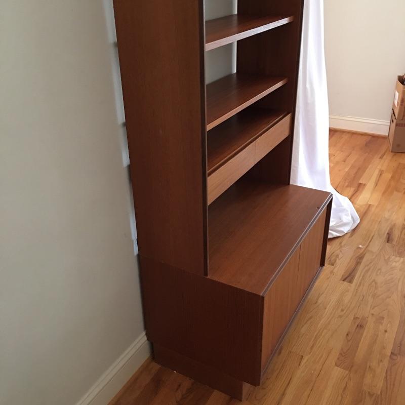 G-Plan open bookcase in teak. Stunning G-Plan MCM open bookcase with closed storage on top and bottom with drawers above and two shelves that are removable. This bookcase is in great shape but has one place where it has been dented, see pictures. Don’t miss out on this stunning MCM bookcase. Bookcase measures 18” x 30” x 78”. This bookcase has a matching bookcase and desk bookcase in lots 36 and 124.