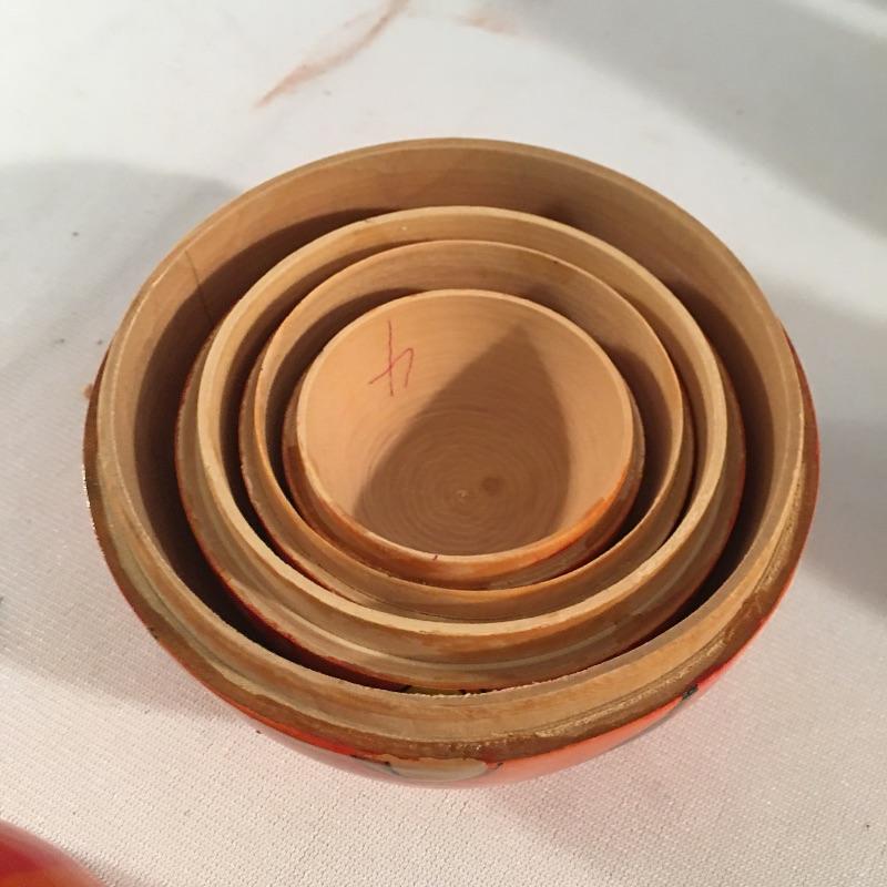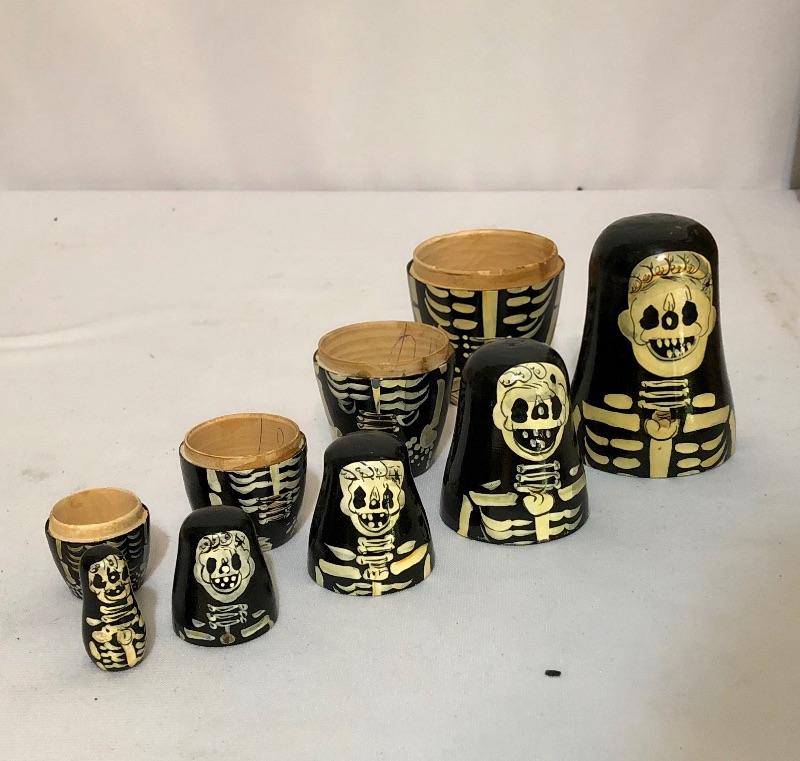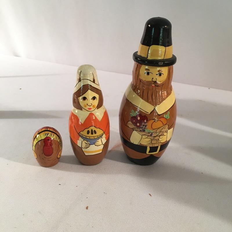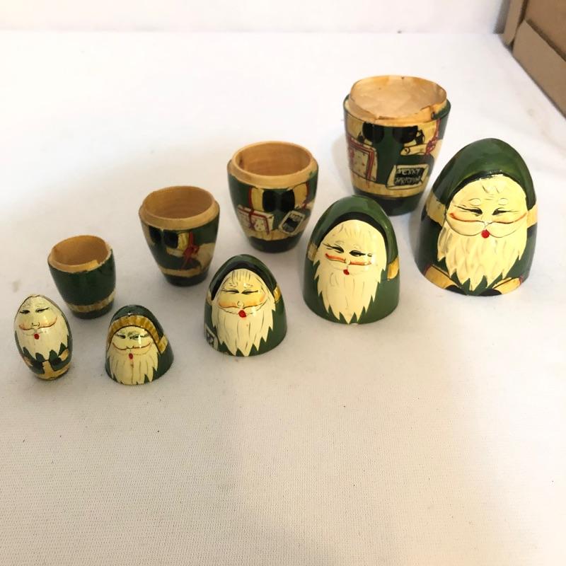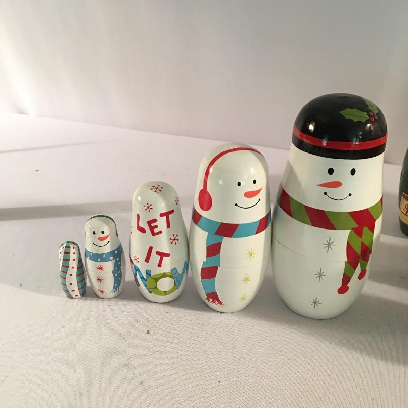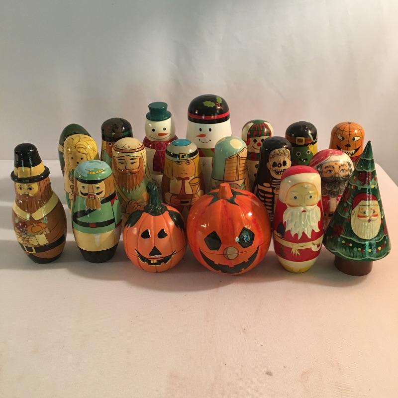 Holiday nesting dolls. Lot includes nineteen nesting dolls with holiday theme in a variety of colors. Get in the holiday spirit with these whimsical dolls that will put a smile on your face. Tallest doll measures 7” tall. Dolls have between 4-5 interior dolls within the largest doll.
