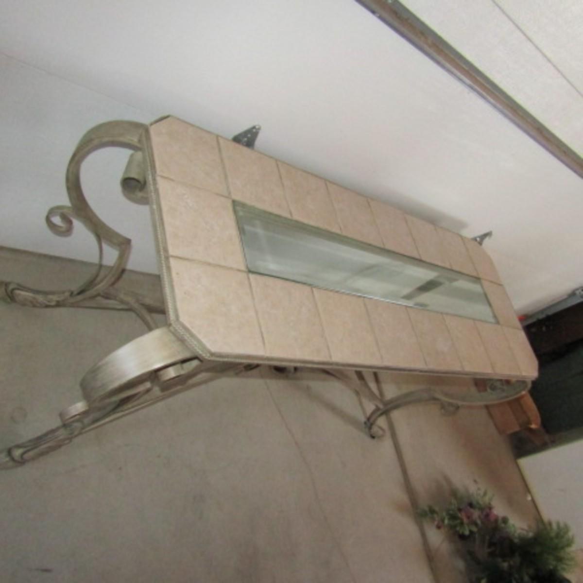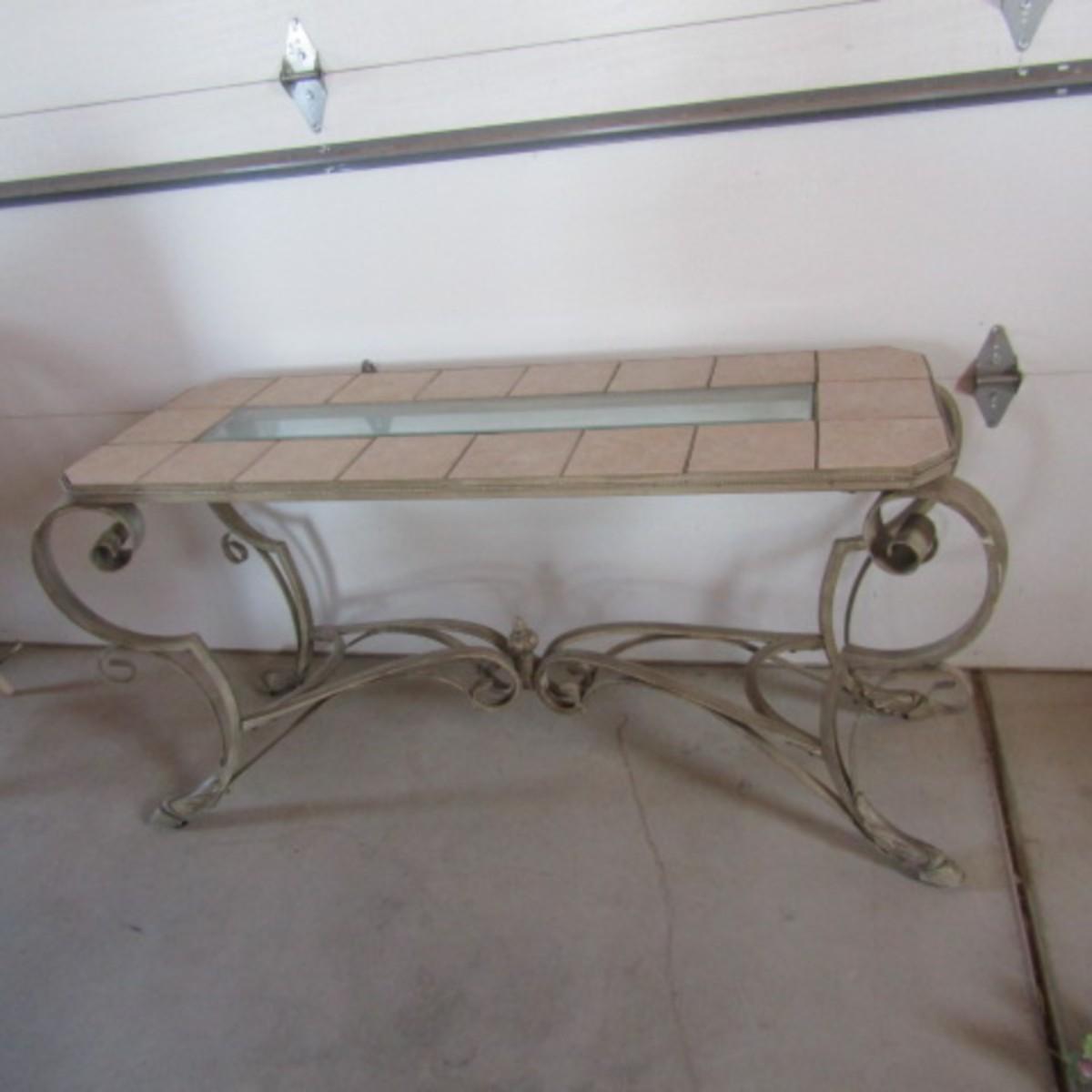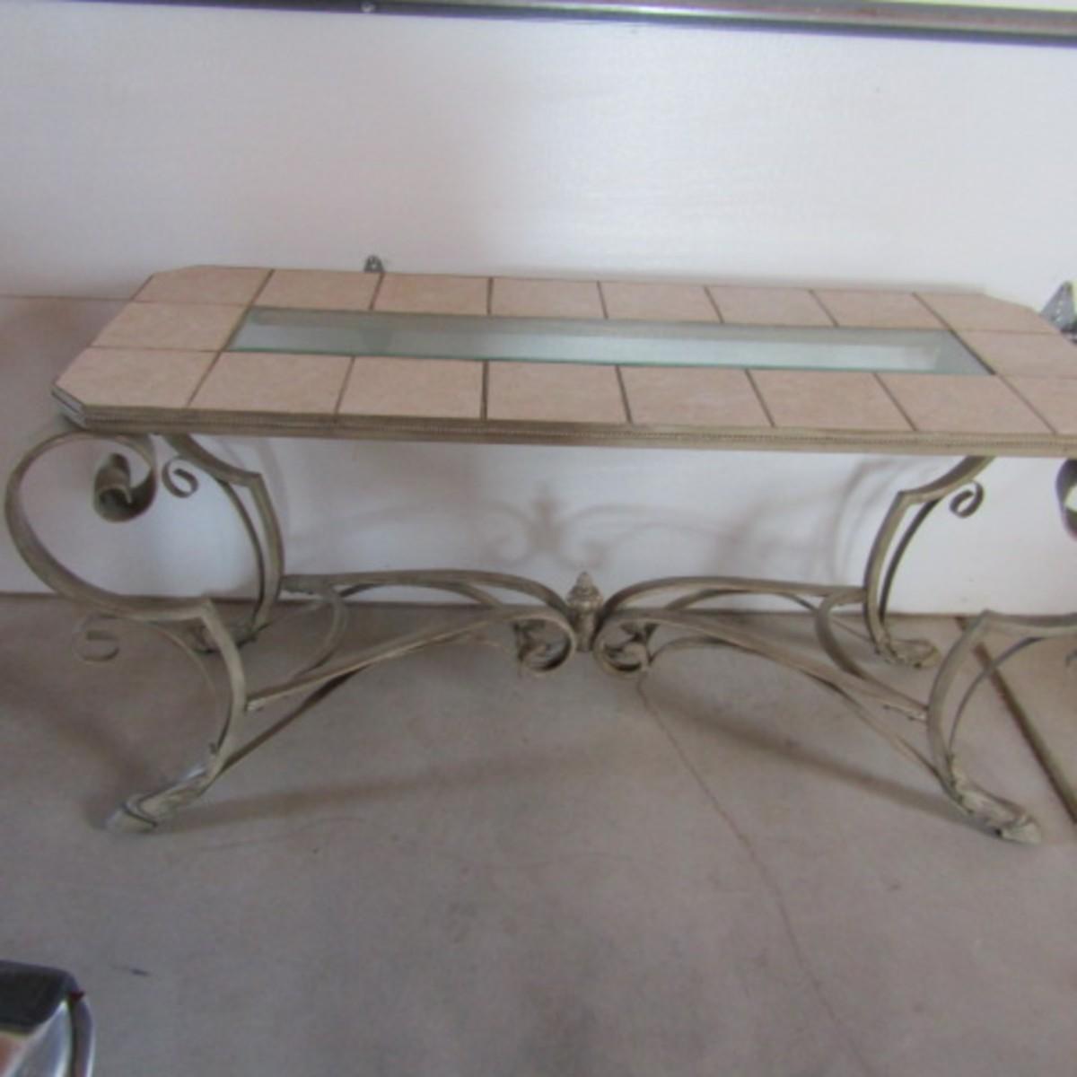 LOT 31 IRON FRAMED SOFA TABLE WITH TILE AND GLASS TOP (W)