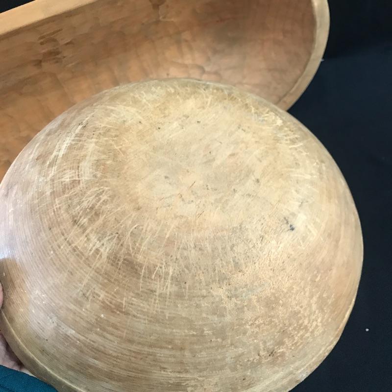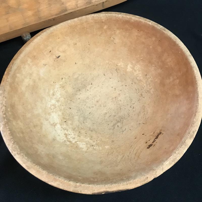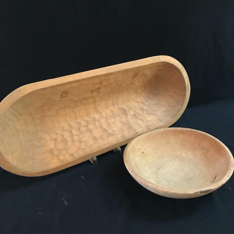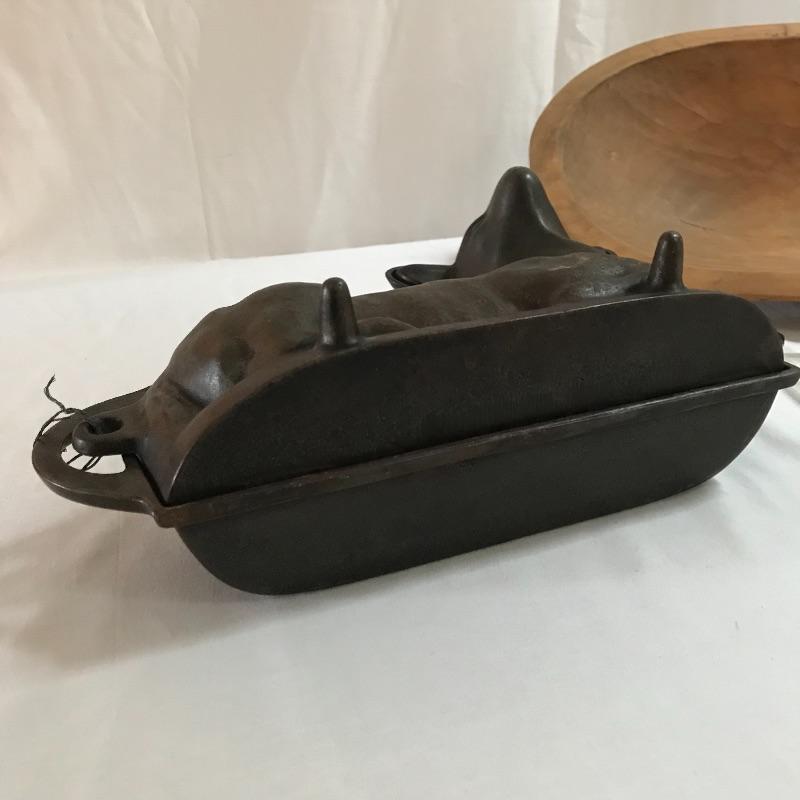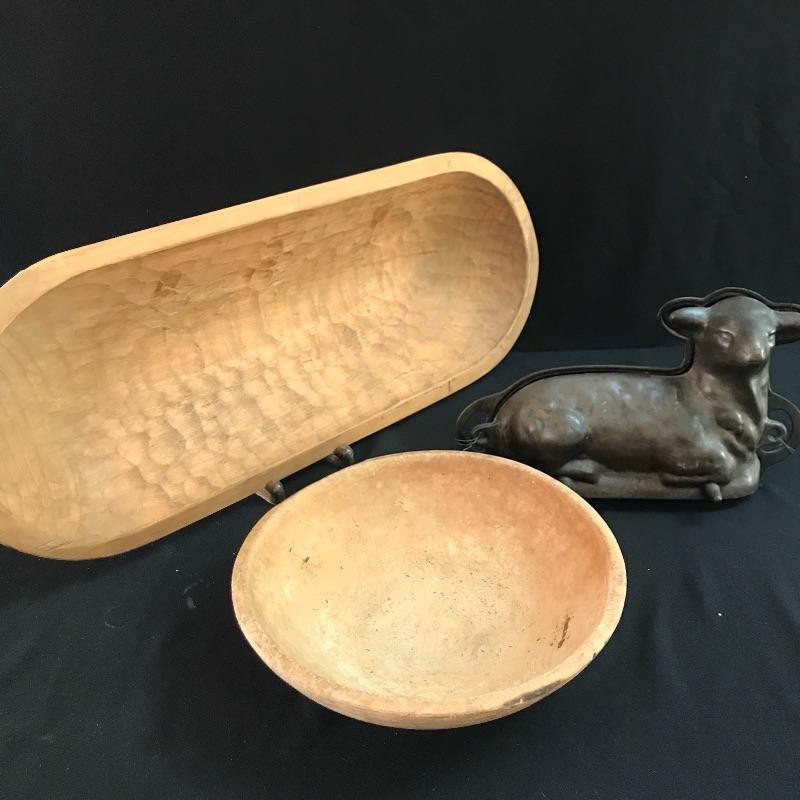 Statement pieces for antique lovers! Griswold Lamb cake mold in amazing condition. Lamb is accompanied by what appear to be two hand-carved wooden dough bowls. Long oval bowl measures approximately 29” x 11” and it’s 3.5” tall. Shipping available. Please call UPS for a quote prior to bidding with bowl measurements and be advised lamb is heavy, possibly cast iron.