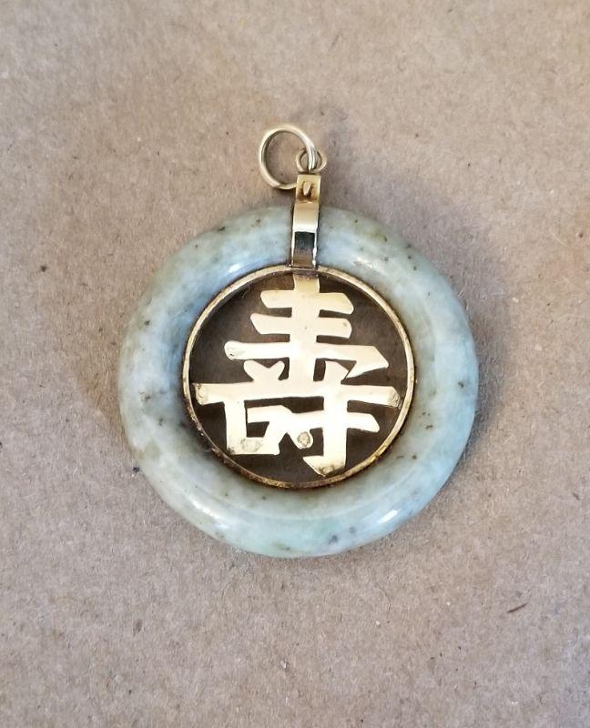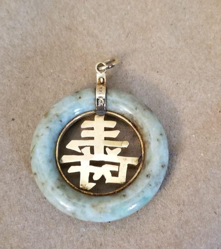 This piece needs a clean, but Southern Coin verified that the bale (marked) and the interior Chinese symbol are both 14kt gold. Measures 1.25" across. Outer ring is pale green jade.