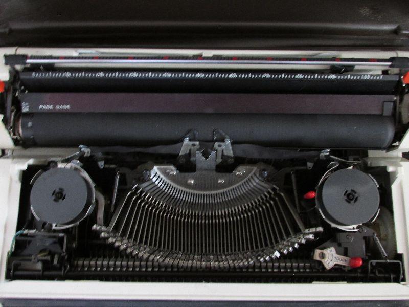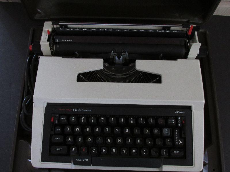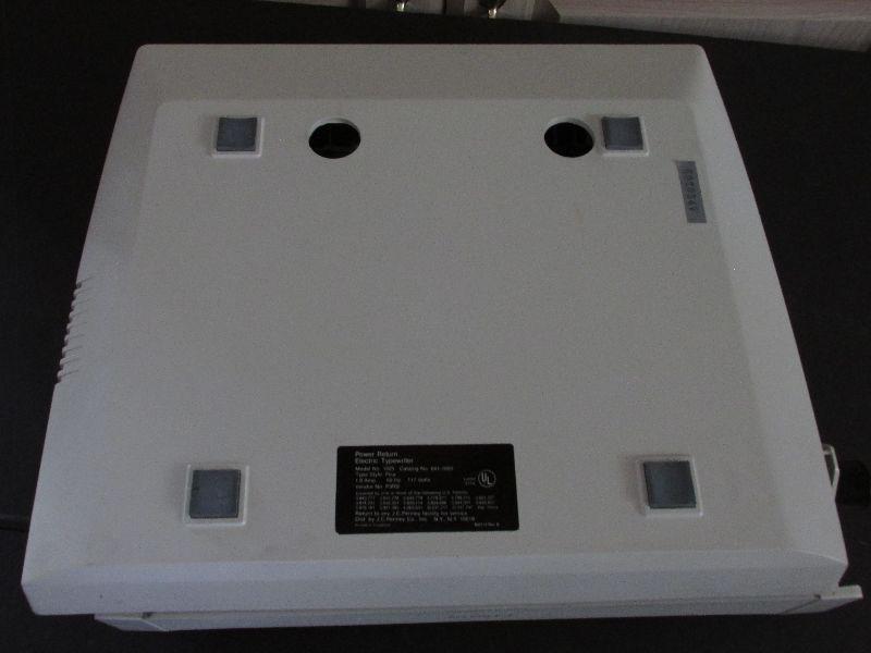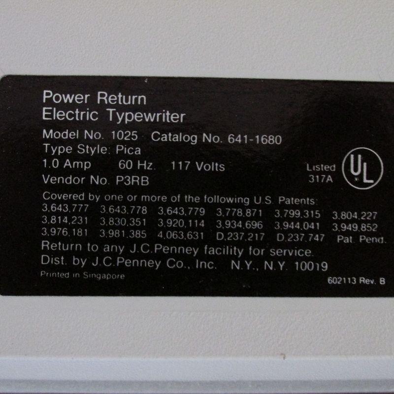 JC Penney Electric Typewriter Model Number 1025-Pica with carrying shell. Power Return. Unfortunately letter c,C doesn’t work may be able to fix. Needs new ribbon as well. Some wear to and damage to outside shell carrying container.