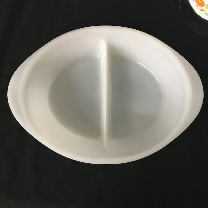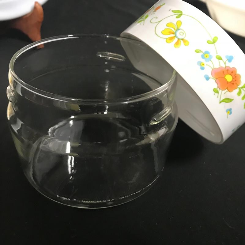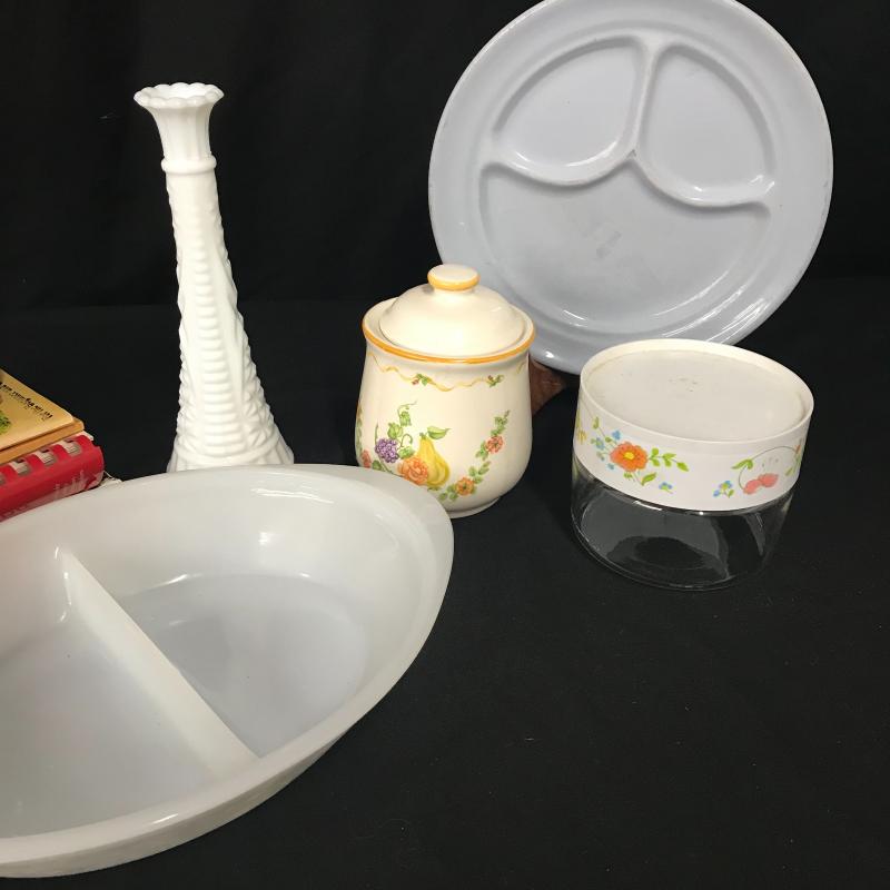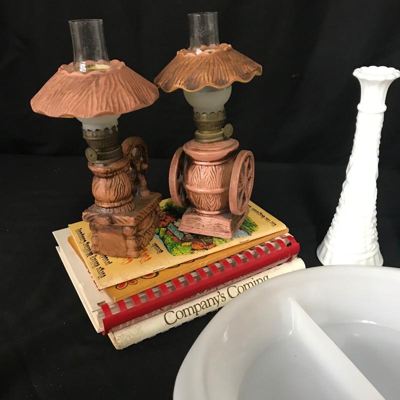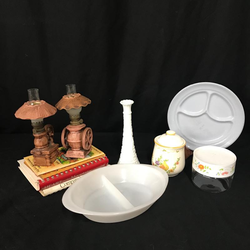Milk glass vase and split vegetable dish made by Glasbake, small Pyrex canister and small floral ceramic jar by M. Kamenstein. Four cookbooks and two ceramic oil lamps that stand 9.5” tall. Lot is available for local pick up in Maggie Valley, NC only.