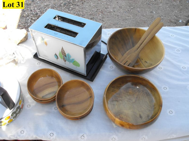 2 Oregon Myrtle Wood Wooden Serving Bowls, 6 Myrtle Wood Salad Bowls and 2 Piece Wooden Salad Utensils