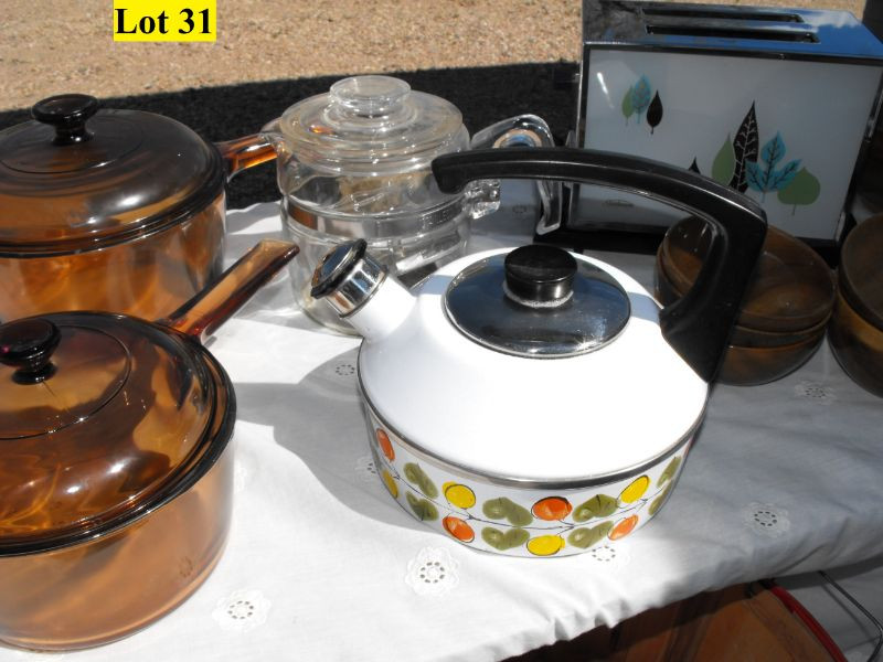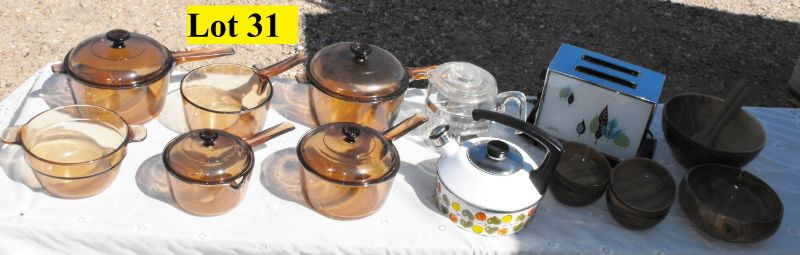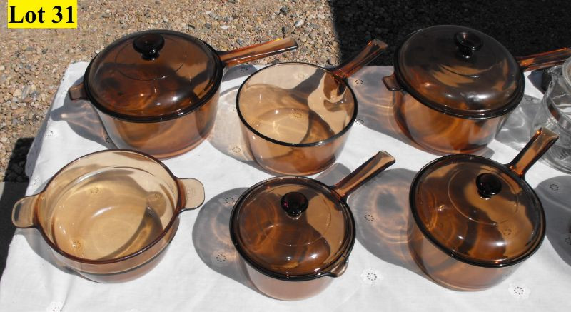 12 Piece Brown Glass Vision Corning Cookware (small skillet w/lid not pictured)