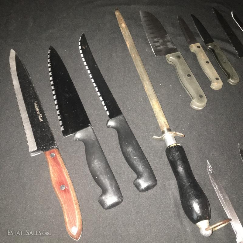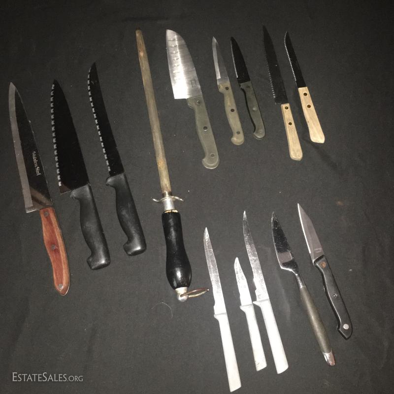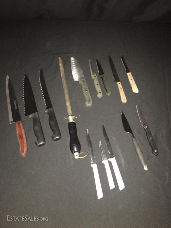 13 miscellaneous knives and a sharpener. Brands include Cooks Club and Good Cook. This lot is available for local pick up in Asheville, NC, only.