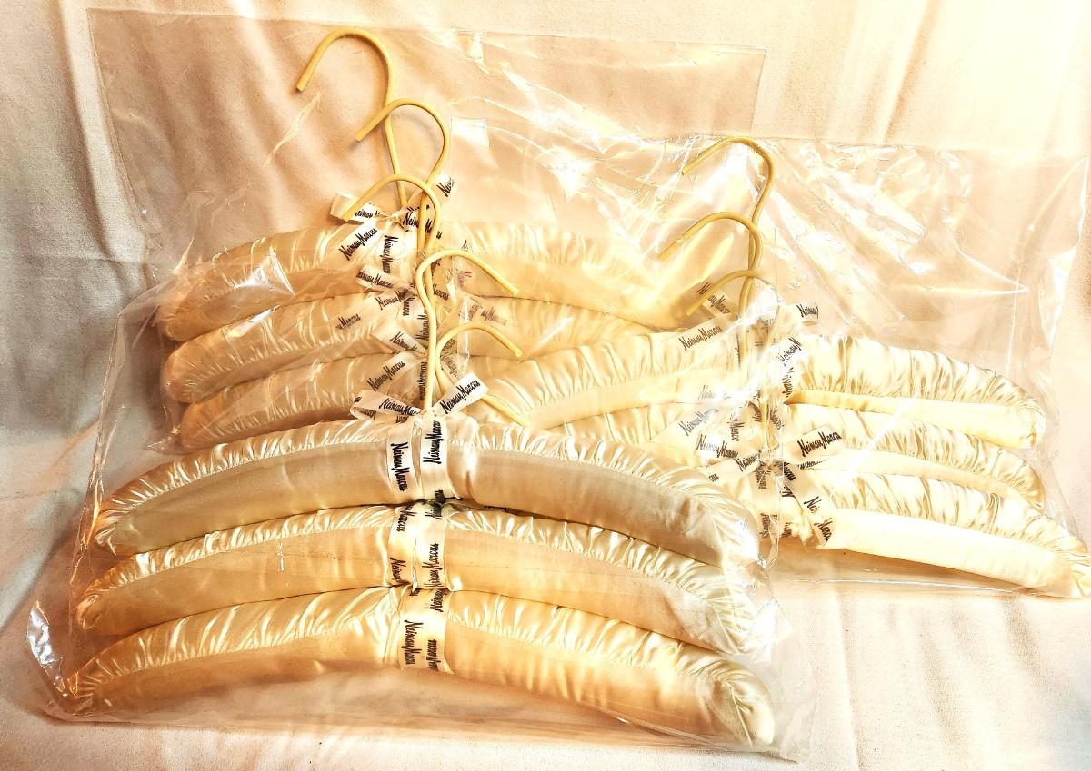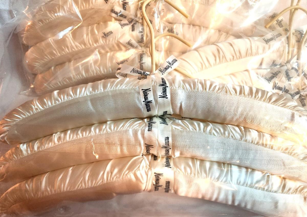 New in bags - never used - the height of vintage luxury! 3 sealed bags of Neiman Marcus branded satin padded clothing hangers in pale pink. - 9 hangers in all. These are no longer produced. Each 16" across.