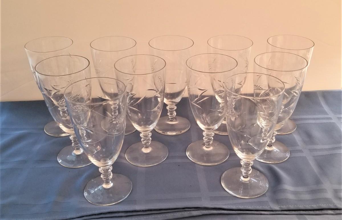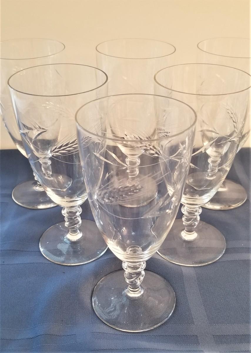 These vintage acid-etched vintage water goblets are just beautiful - wheat design. We have other pieces in this set that will be in later lots in this auction. You get what you see here - 11 in all. Good condition. Each is 6.75" tall.