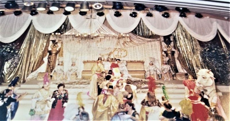 Large color photo taken at an unnamed old-line Carnival ball - King is on the throne with his Queen - date on the back says 2/28/95, so probably taken in the Auditorium, plus two Mardi Gras Krewe favors - Dorians 2004 and 2005, done by India Stewart. Photo measures 14" x 11".