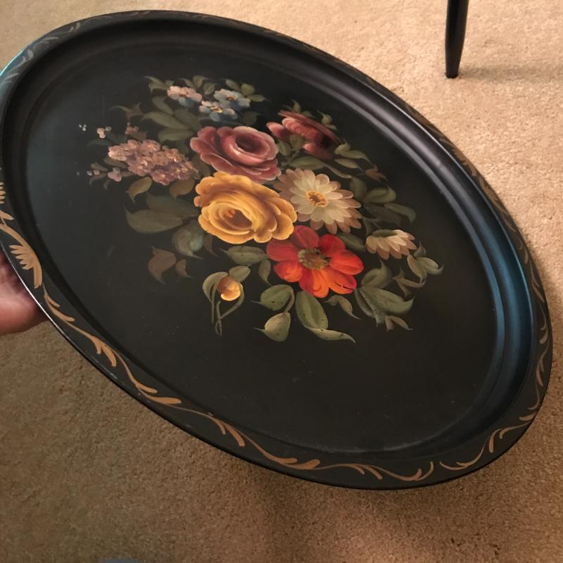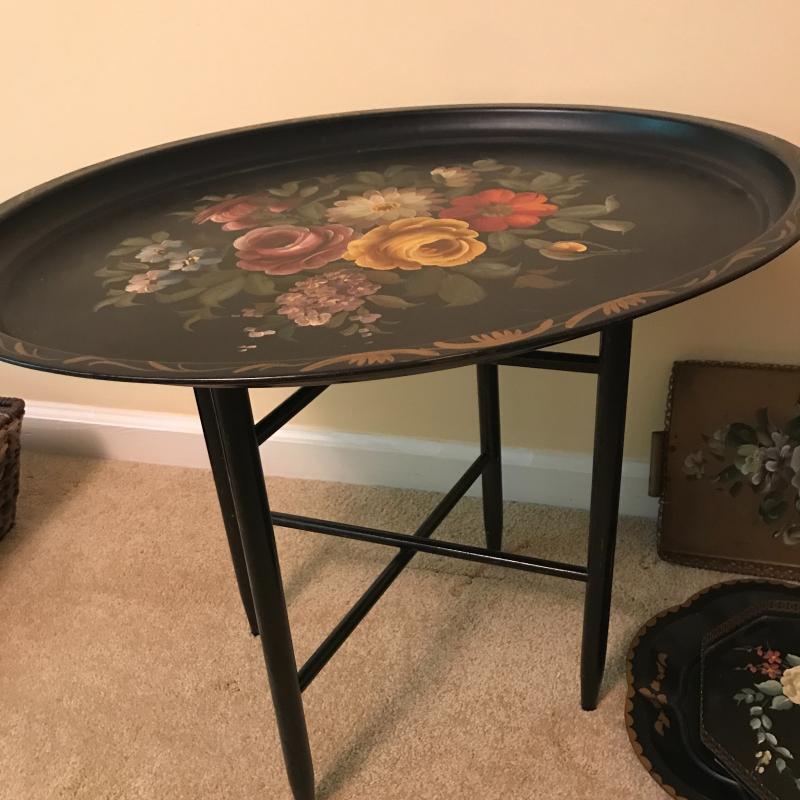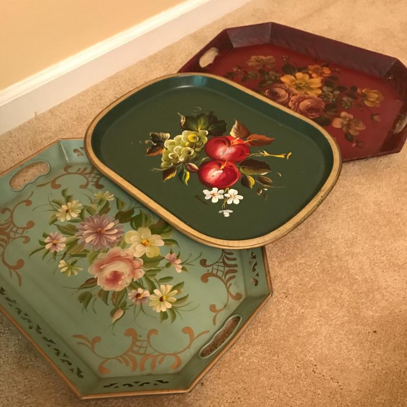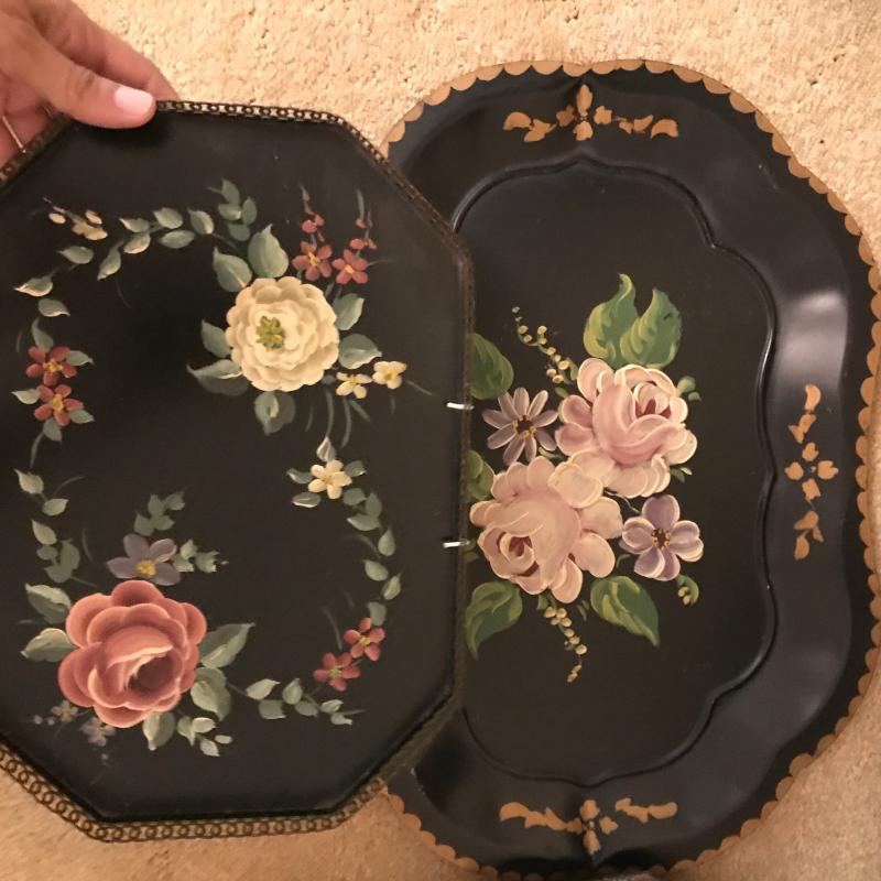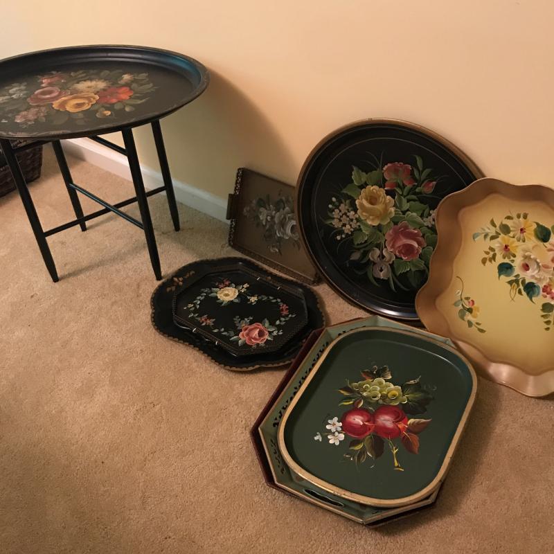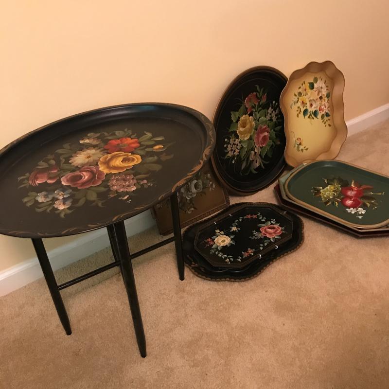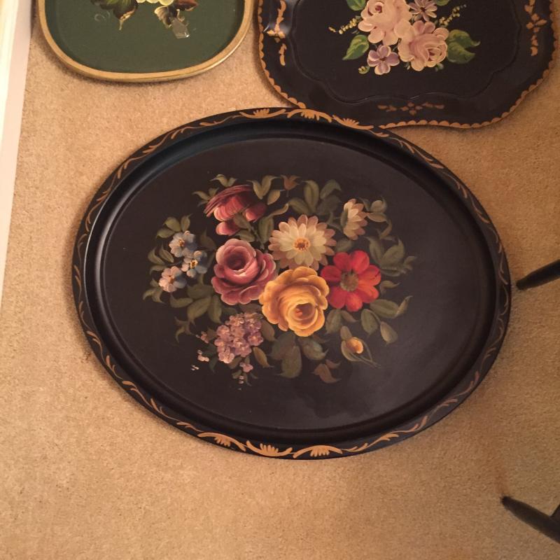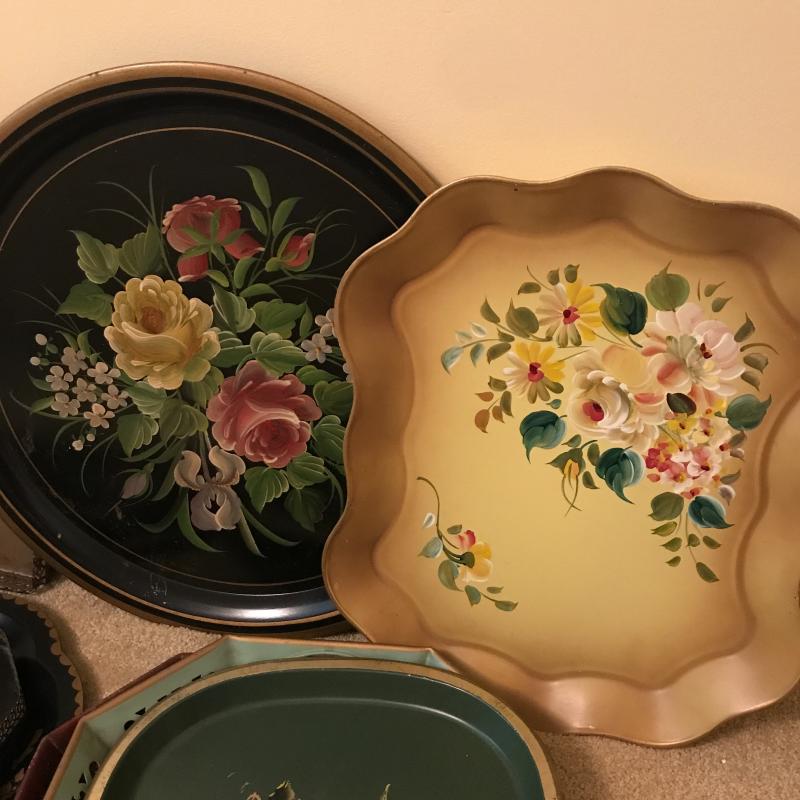 8 Metal Trays plus coffee table metal tray on stand. All trays have painted floral designs in variety of colors. Great for your home decor or as gifts. Largest Oval tray Measures 24.25” x19.5”