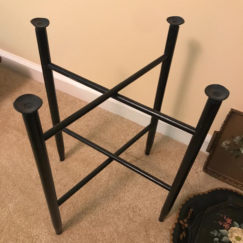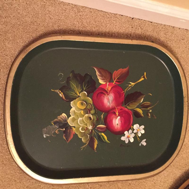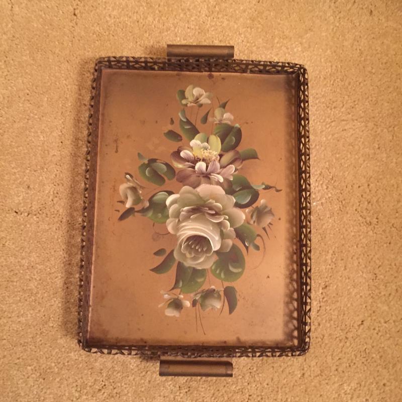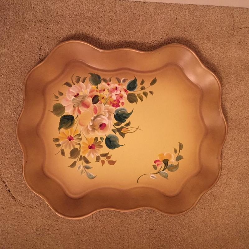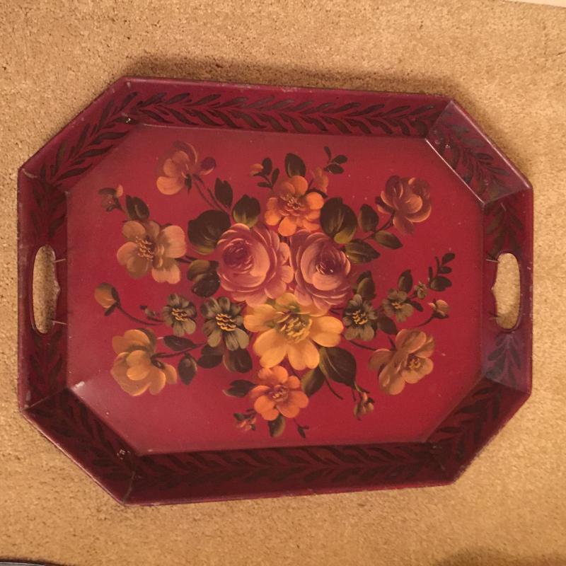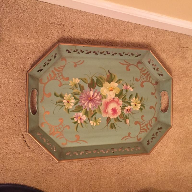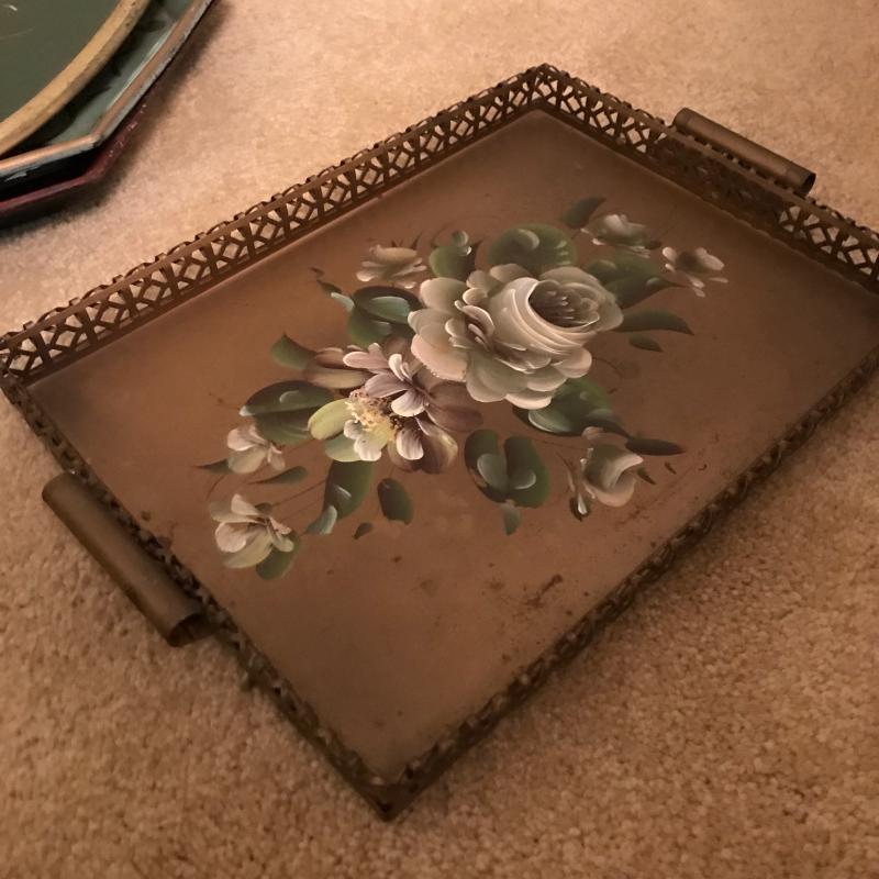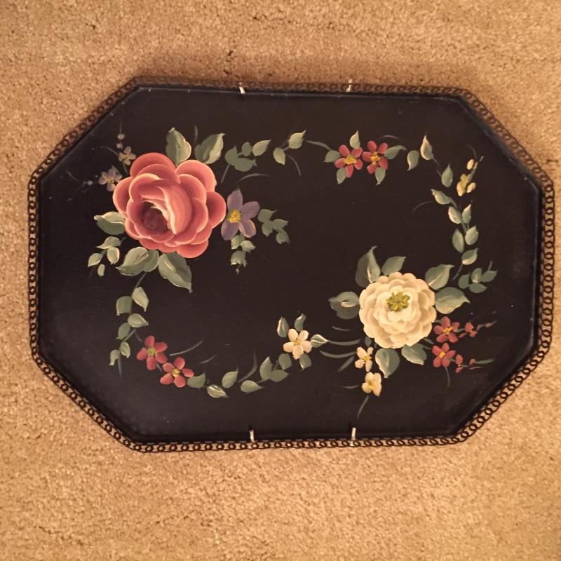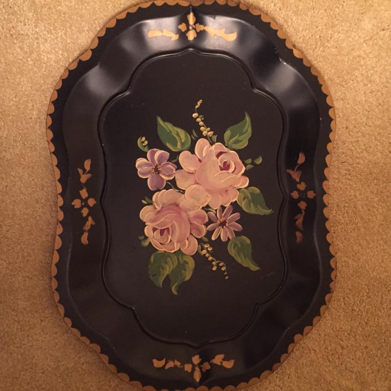 8 Metal Trays plus coffee table metal tray on stand. All trays have painted floral designs in variety of colors. Great for your home decor or as gifts. Largest Oval tray Measures 24.25” x19.5”
