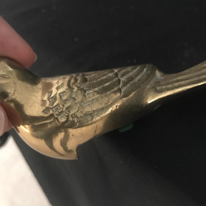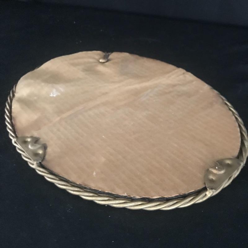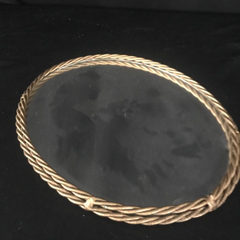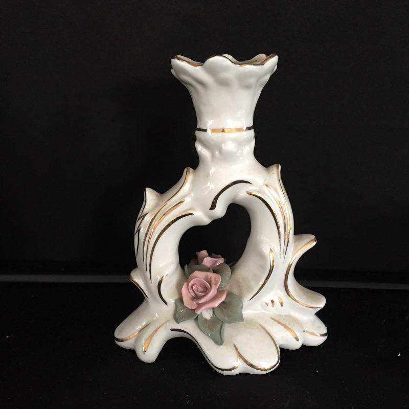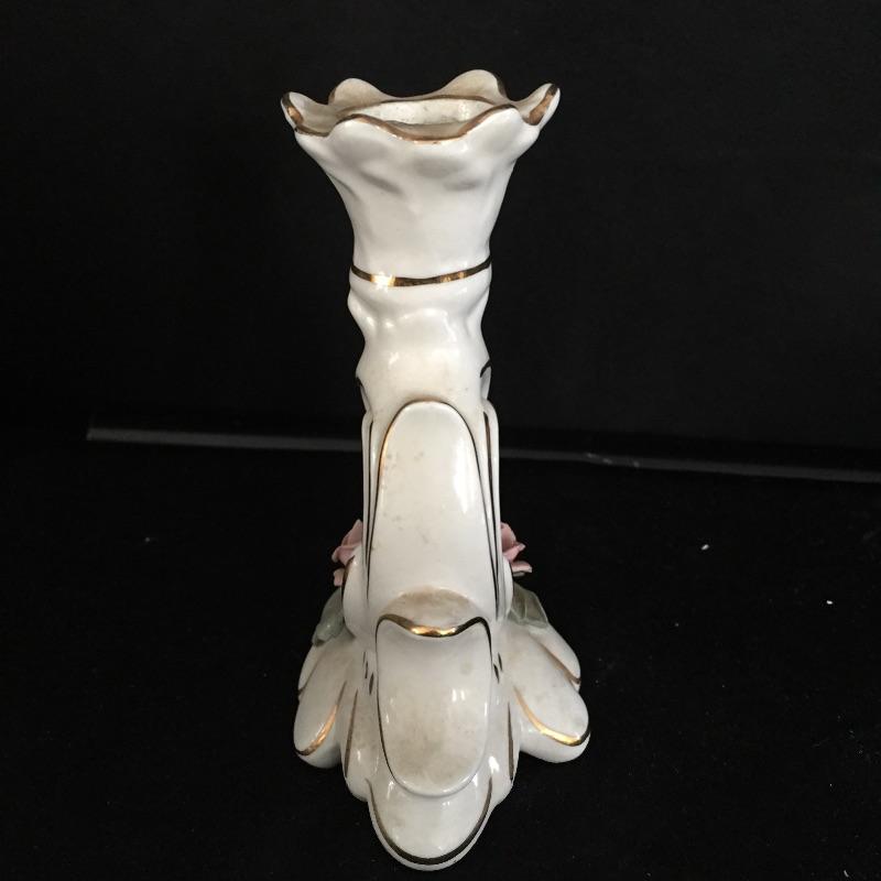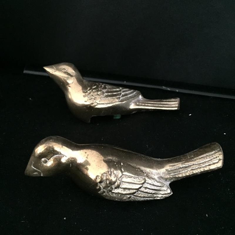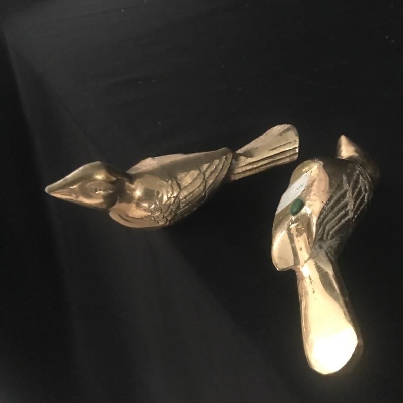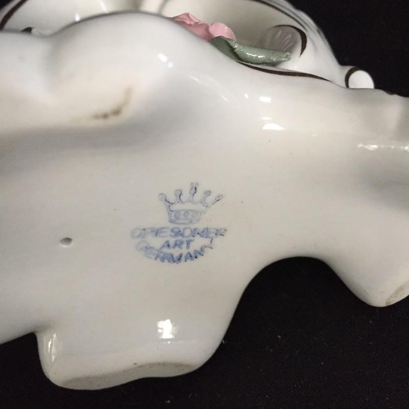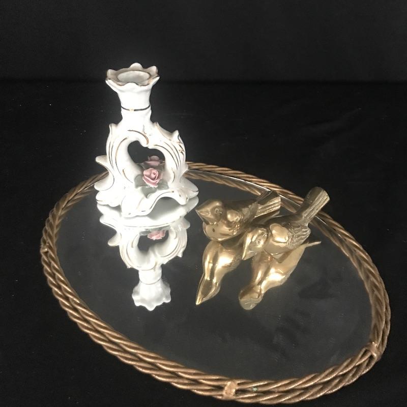 Lovely porcelain candlestick, pair of brass birds (Korea) and an oval mirrored tray. See photo for manufacturer mark from Germany on porcelain. Brass birds are meant to lay on edge of shelf or table with the hooked bottom.