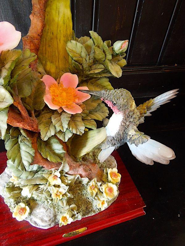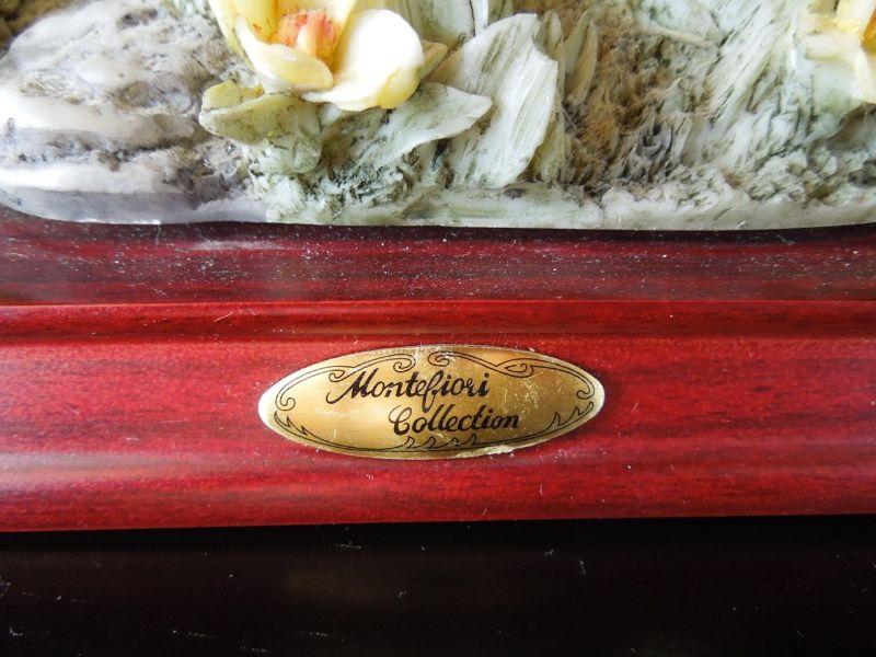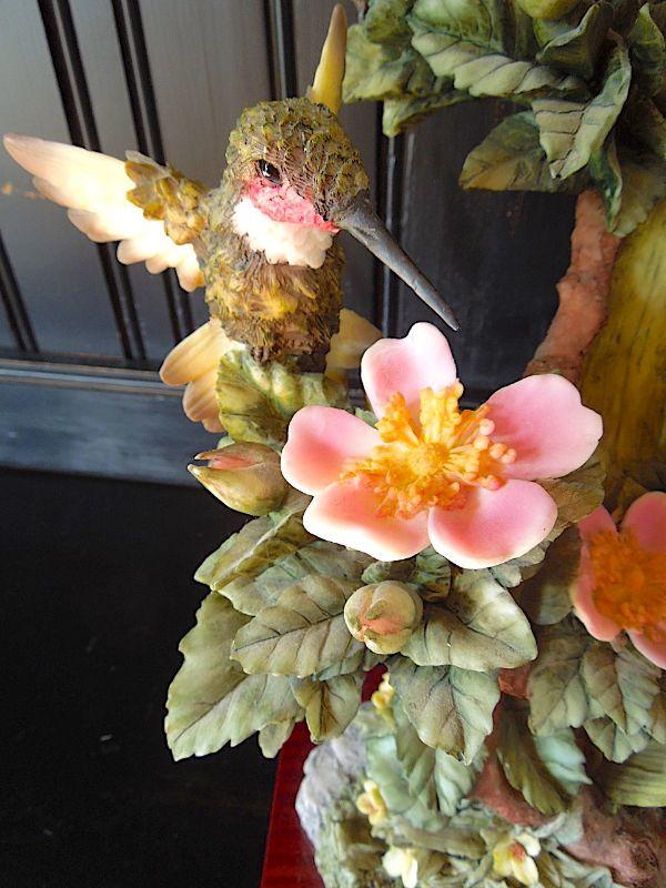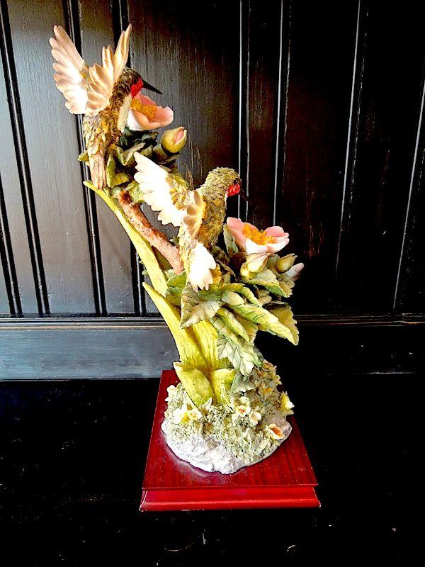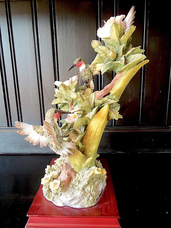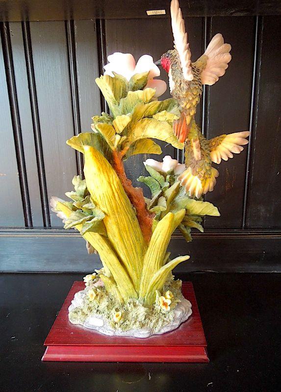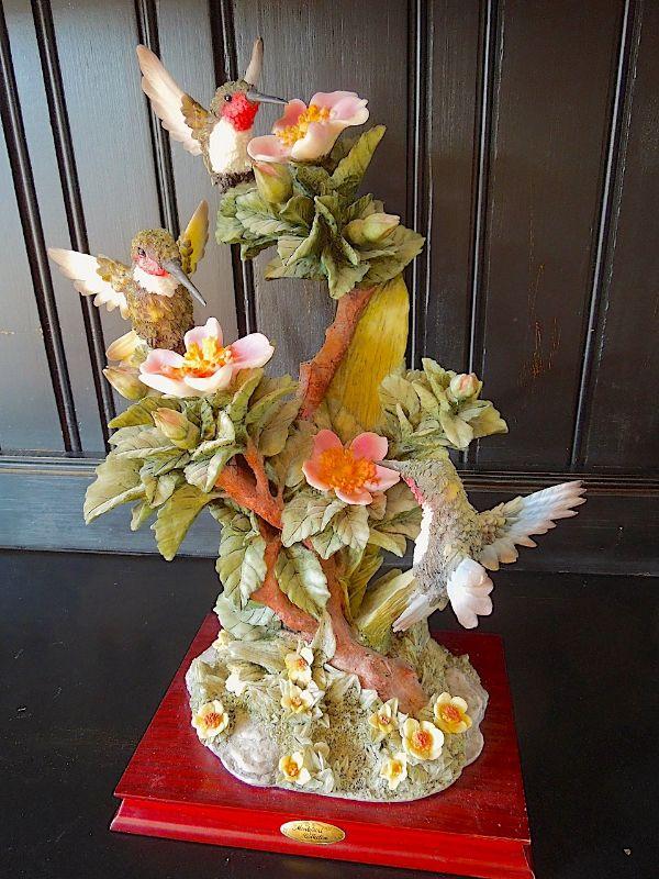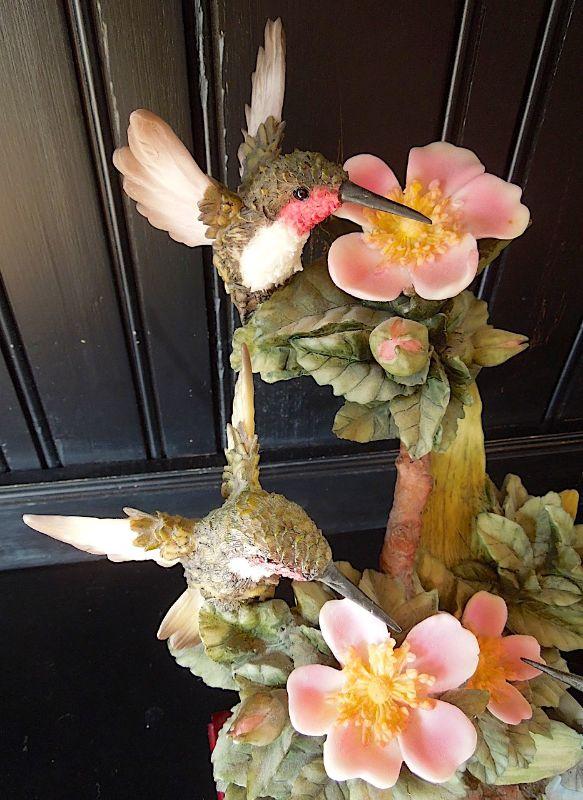 RARE breathtakingly real 17" high Montefiori Collection Italy carved metal and white glass resin statue of 3 hummingbirds drinking nectar from blossoms. Statue base measures 9" x7" and features a brass Montefiori name plate and felted padson bottom. No chips or cracks. Needs cleaning.