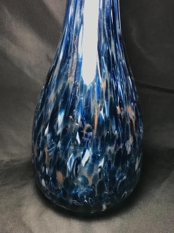 Hand blown blue, white, clear, and metalic gold mottled glass bottle vase. Original sticker on lip. Nice large size. 7" D x 20" H