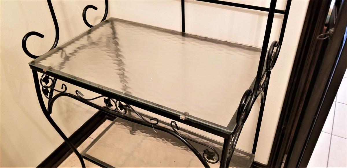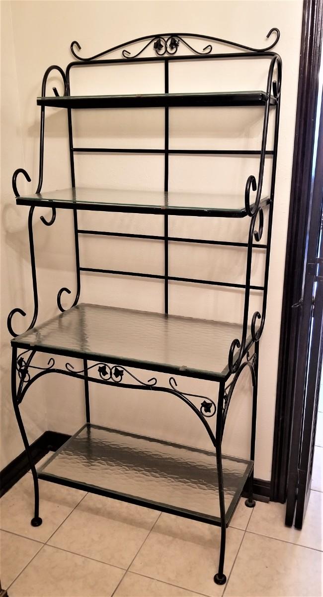 Quality cast iron/tempered glass Baker's rack - 4 shelves (glass lifts off), measures 31.25" across, 68.5" tall. Dealers - great for display in a booth.
