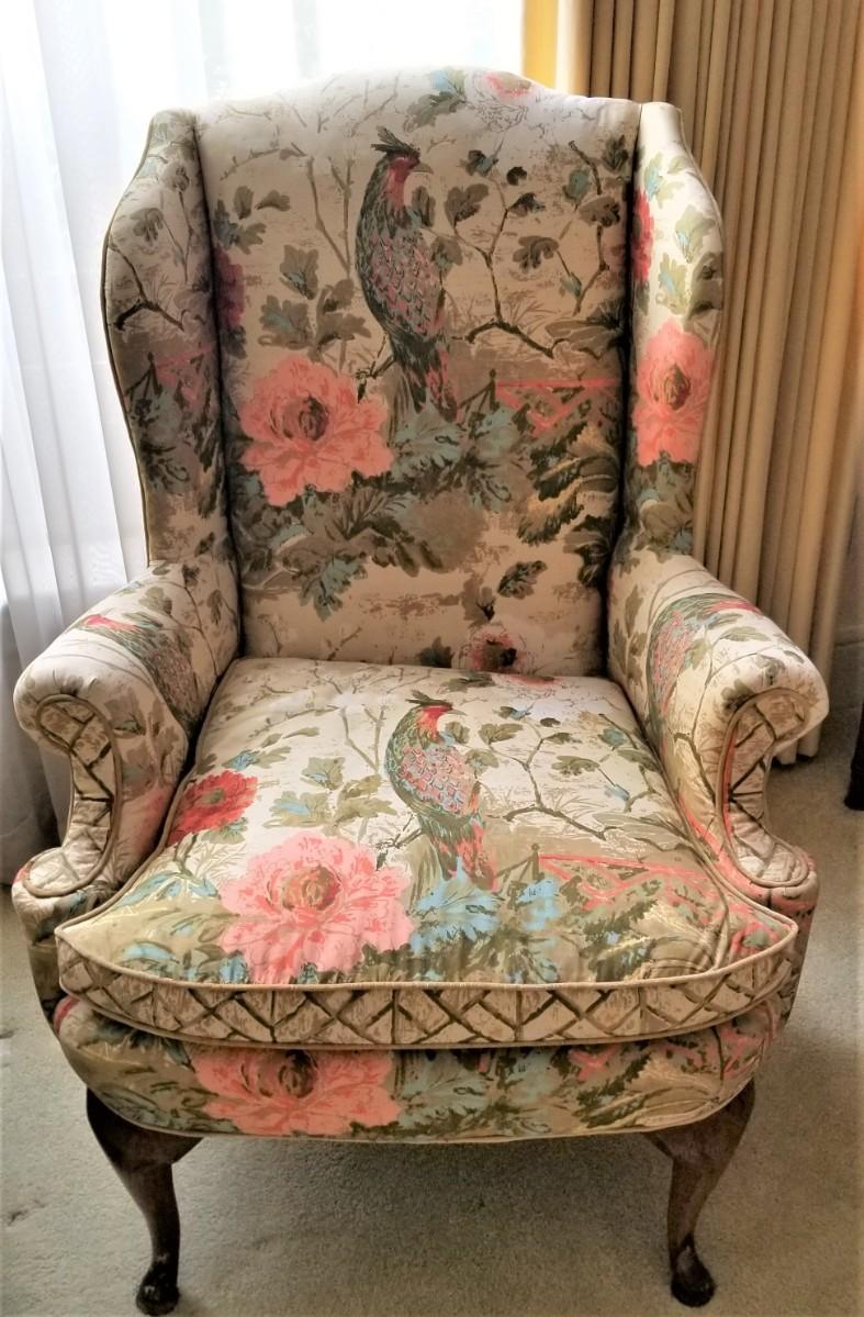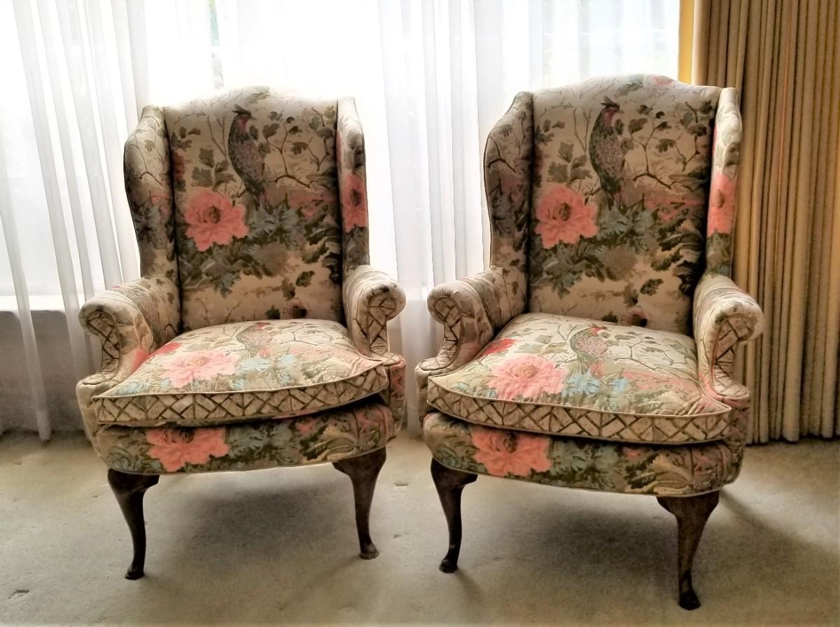 Nice pair of vintage wing-back armchairs - Bird of Paradies motif (midcentury) - by Highland House of Hickory. Comfy and Sturdy - only gently used. 31" across, 24" deep, 44" tall.