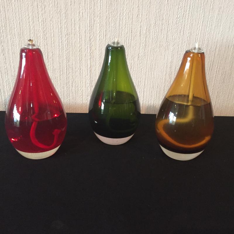 Trio of glass oil fueled candles. Light up your life with this trio of colorful candles.