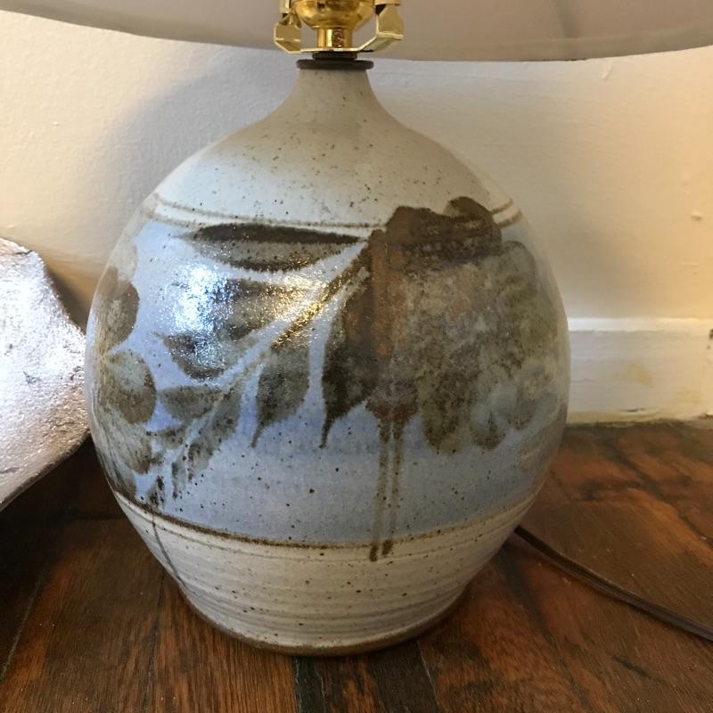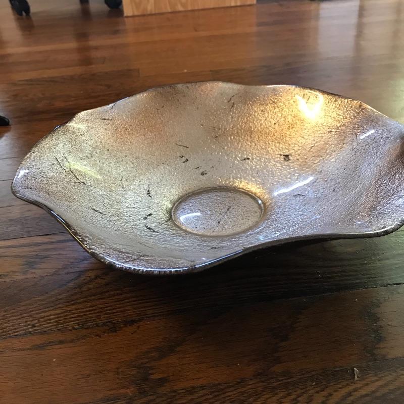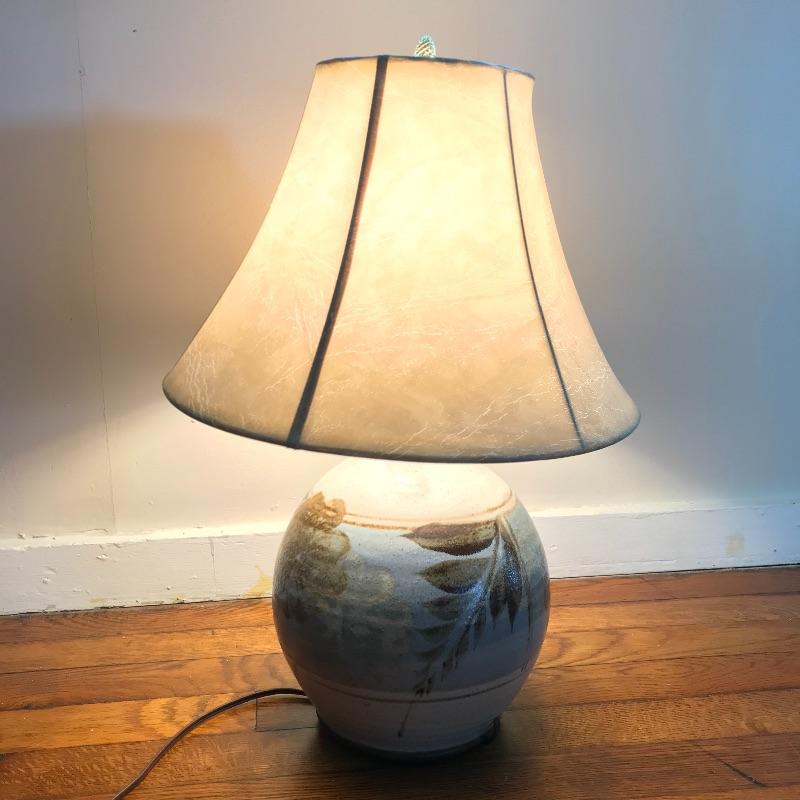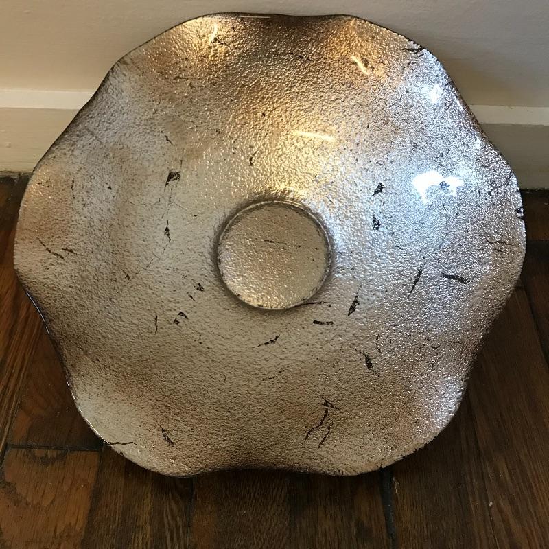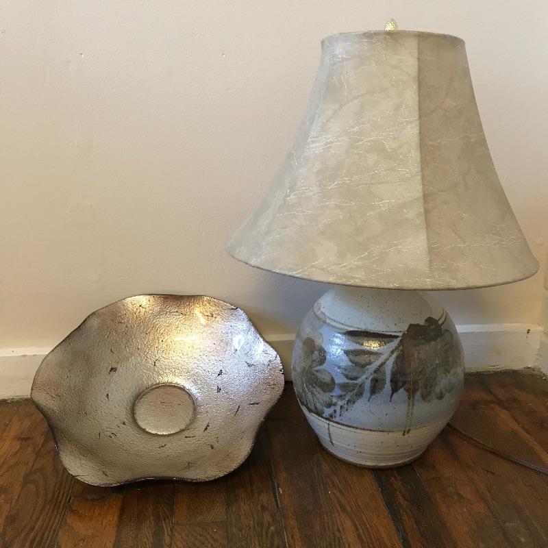 Here’s a great decorative ensemble for you to enjoy! A quality pottery lamp with faux leather shade and a shiny shallow textured glass bowl. The pottery lamp is photographed catching some light reflections near the top of the piece and we are unaware of any blemishes. The plate also is a silver color with black and copper accents and copper colored on the bottom side. No markings are known. See photos. Lamp stands approximately 21” tall and the bowl is about 13”d x 3” high. Shipping available.
