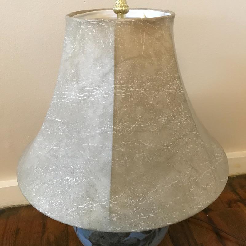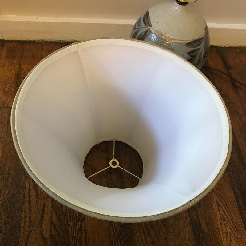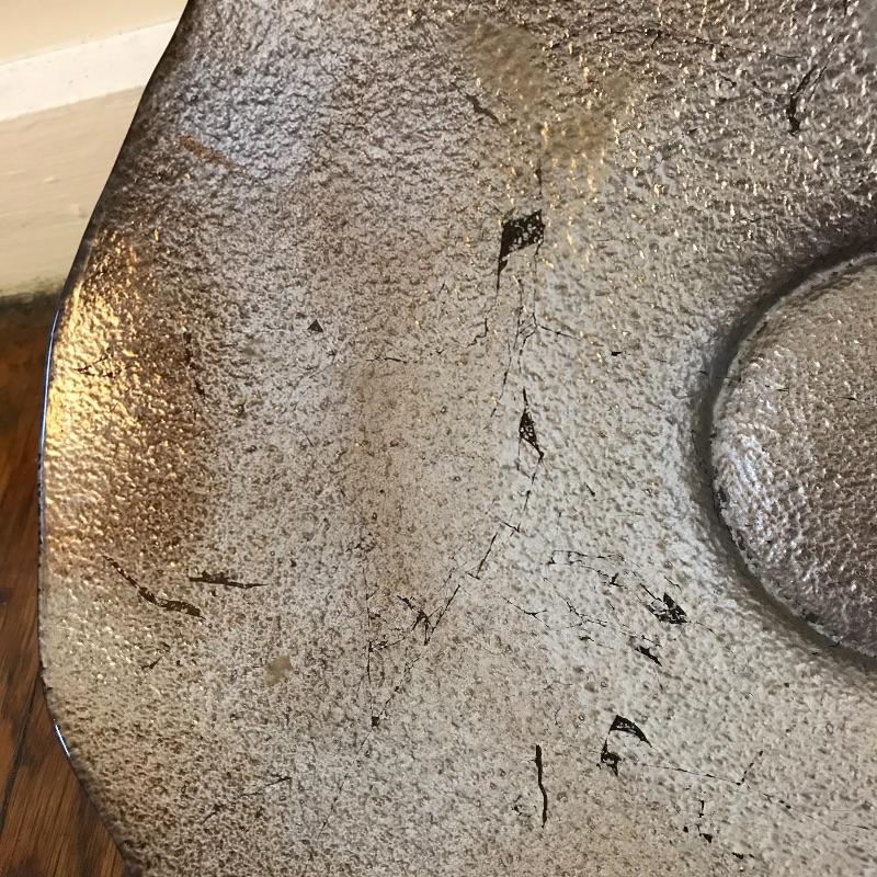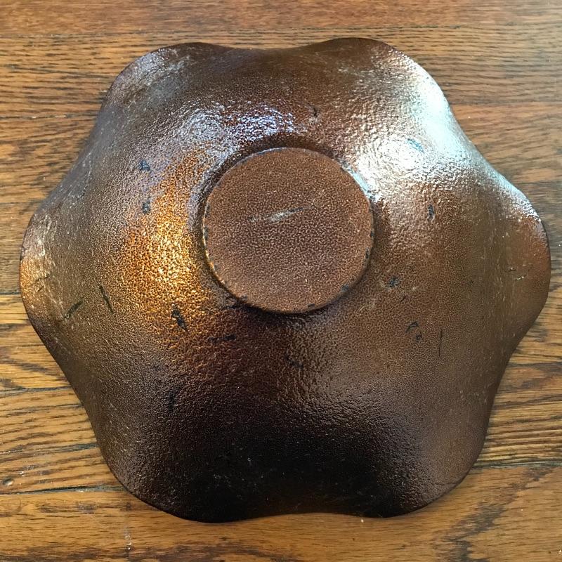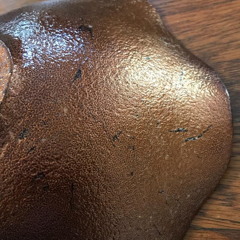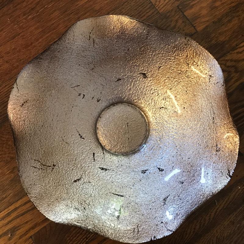 Here’s a great decorative ensemble for you to enjoy! A quality pottery lamp with faux leather shade and a shiny shallow textured glass bowl. The pottery lamp is photographed catching some light reflections near the top of the piece and we are unaware of any blemishes. The plate also is a silver color with black and copper accents and copper colored on the bottom side. No markings are known. See photos. Lamp stands approximately 21” tall and the bowl is about 13”d x 3” high. Shipping available.