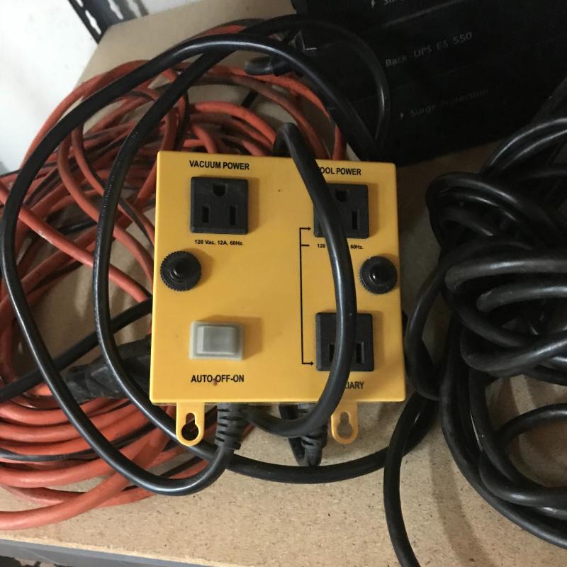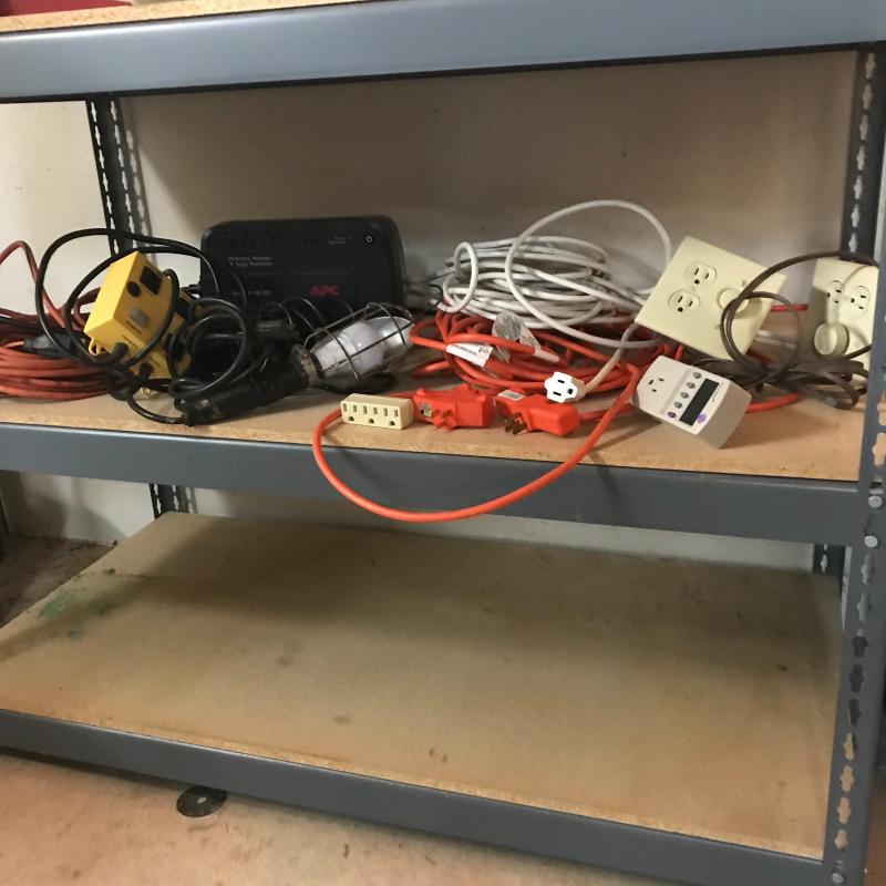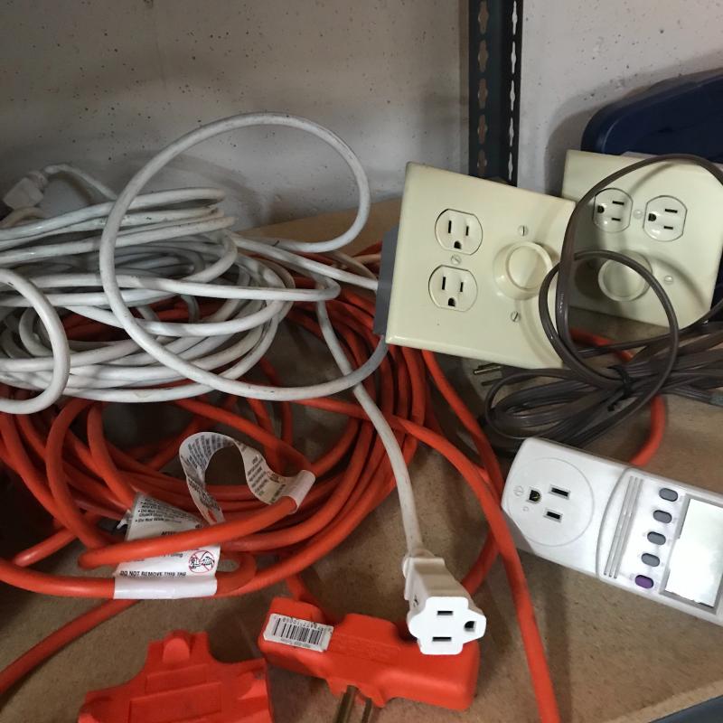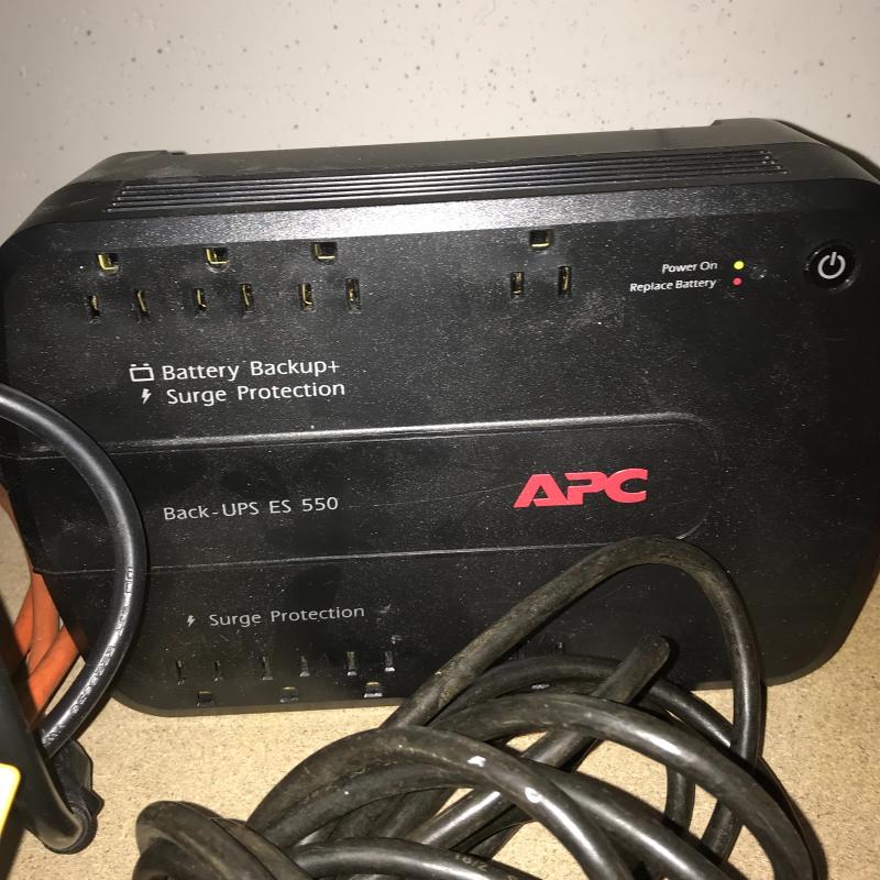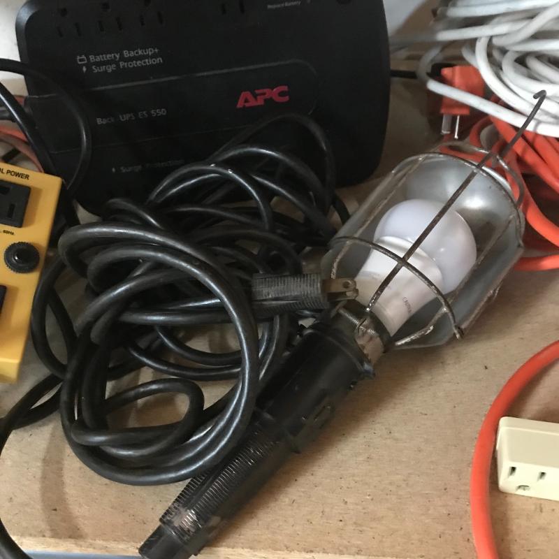 APC Surge Protector battery, several extension cords, drop light, and kilowatt meter cord. Lot available for local pick up in Asheville, NC only.