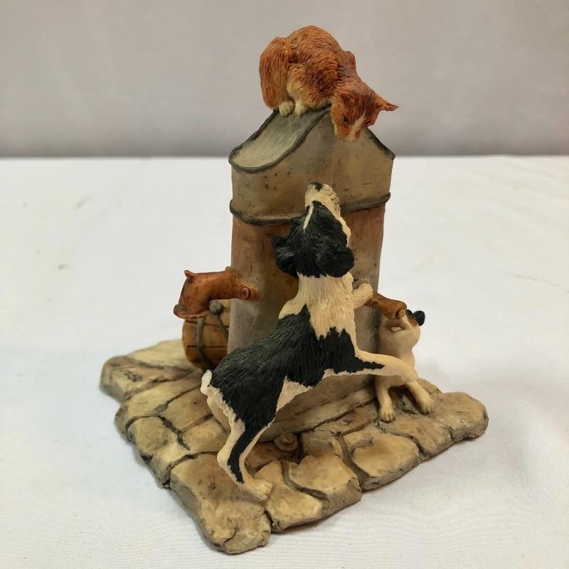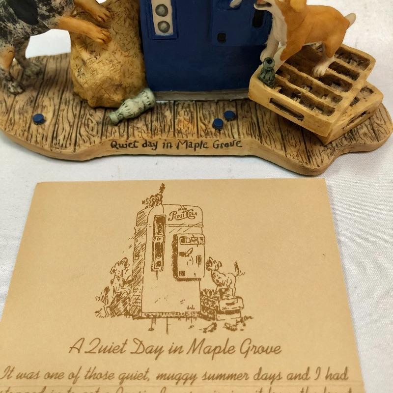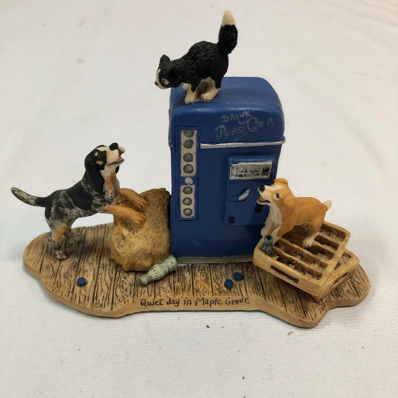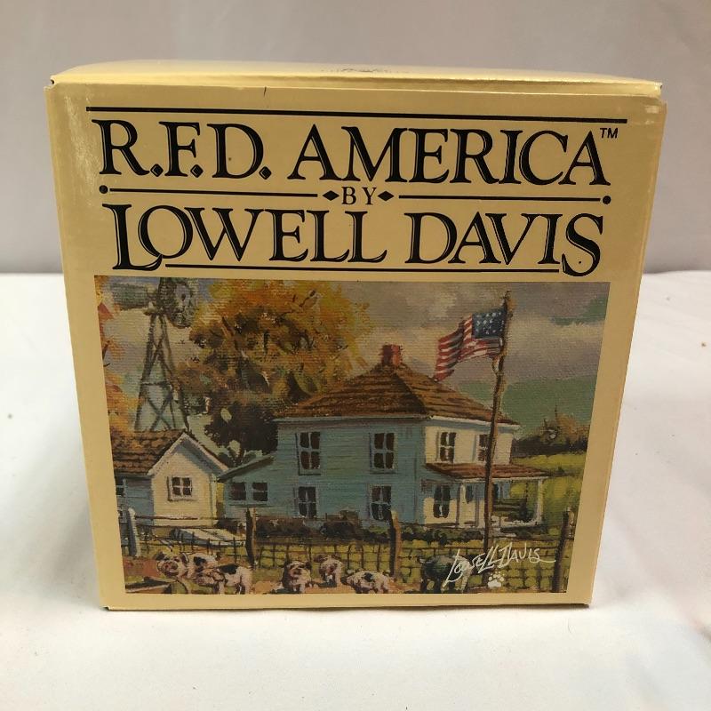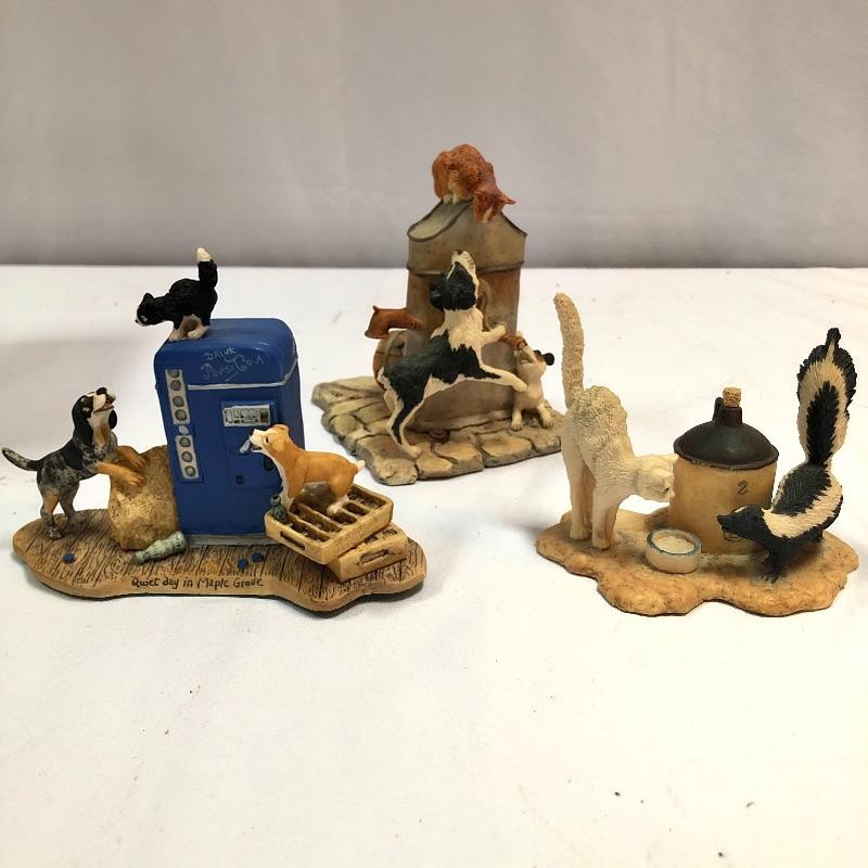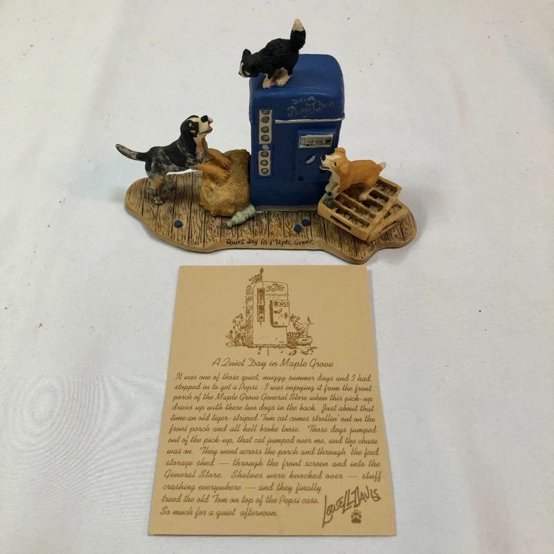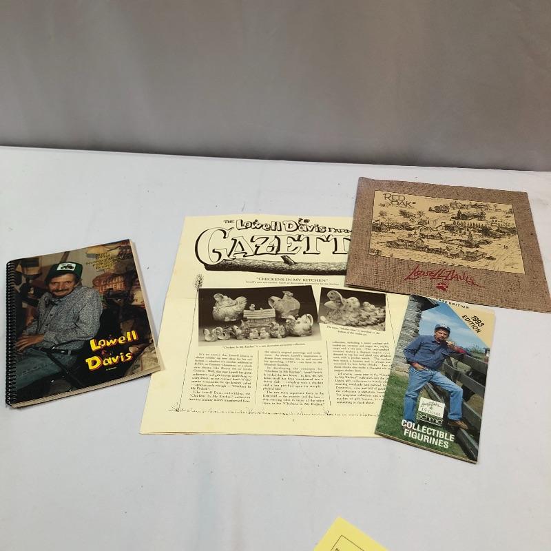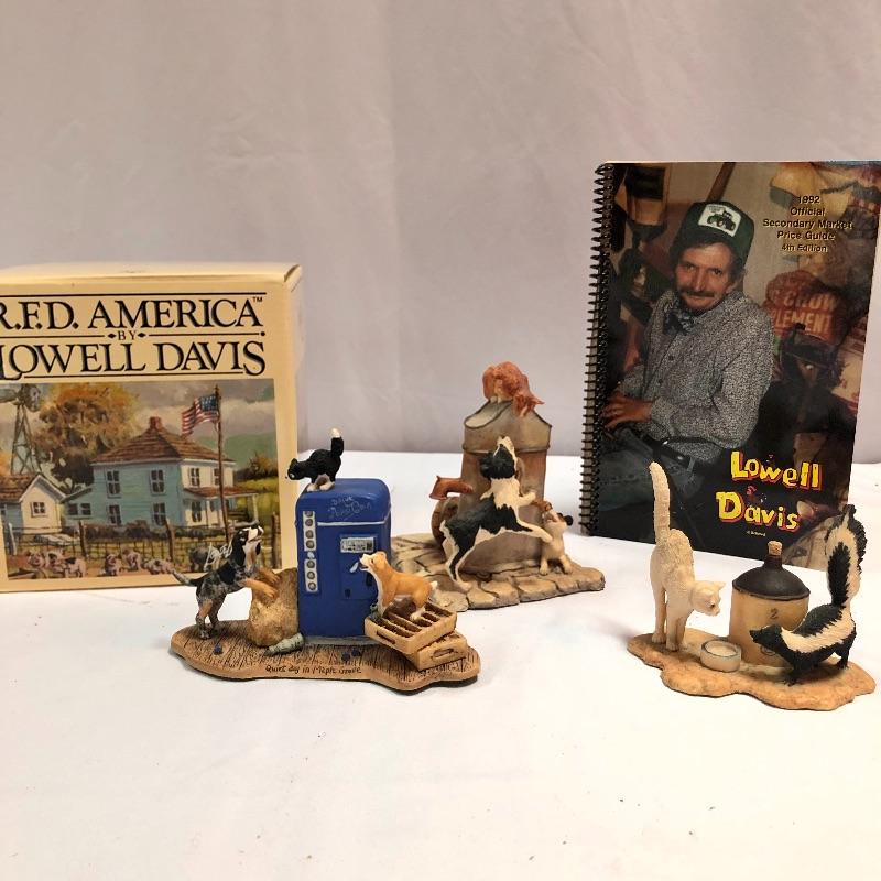 Three collectible figurines by Lowell Davis handcrafted and hand painted in Scotland. The first figurine is A quiet day in Maple Grove and comes with box and small COA. There are two more additional figurines, a price guide book and various other literature. Quiet day in Maple Grove measures approximately 5 inches wide 3 inches tall. All three figurines have labels stating they were handcrafted and painted in Scotland. Two come with boxes.