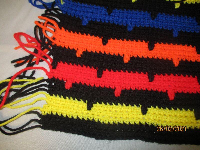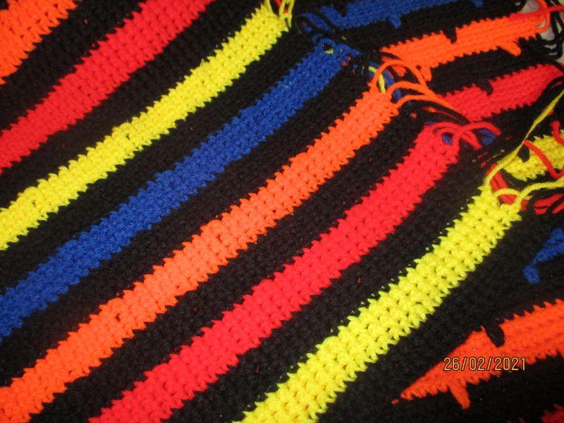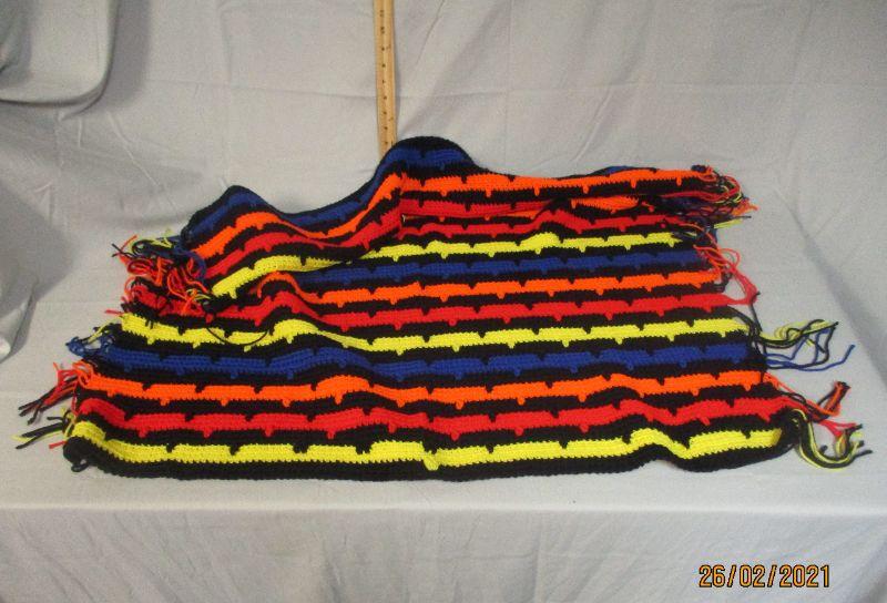 This is a small afghan (baby blanket size) that is in excellent condition. It has horizontal stripes on both sides, but one side has an added black "notch" embellishment that they other side doesn't. It is 38" x 34".