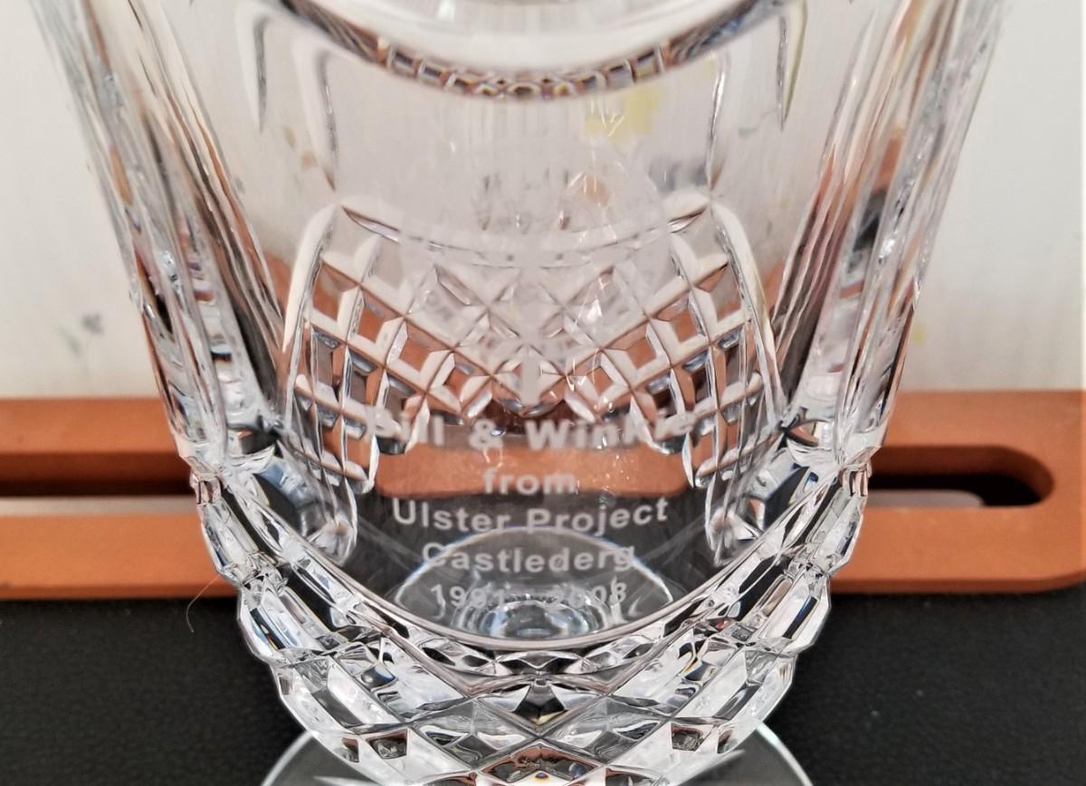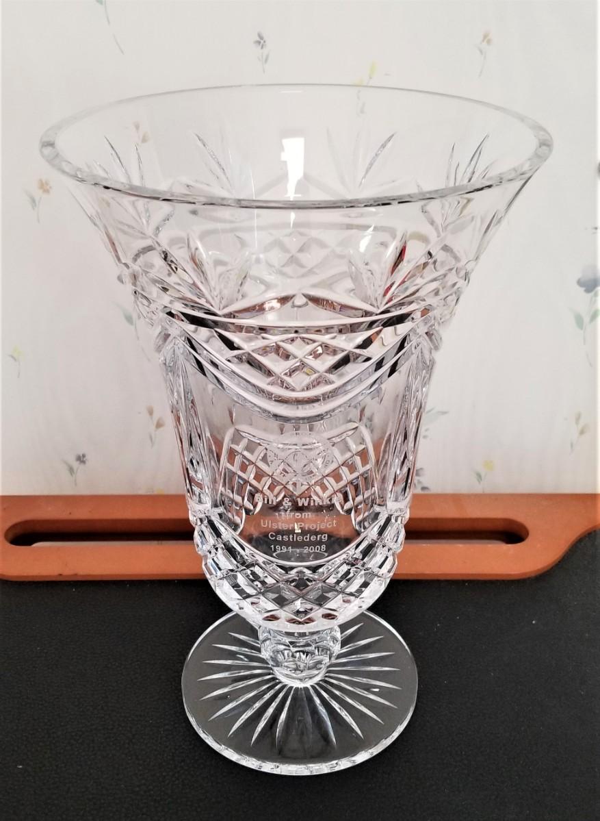 This couple was active in the Ulster Project - an effort to promote peace and understanding between young people in Northern Ireland (largely Protestant) and the Republic of Ireland (largely Catholic). This lovely tall crystal vase was a tribute to their efforts and is dated on one side 1991-2008. Made of Tyrone Crystal, excellent condition. 30" tall.