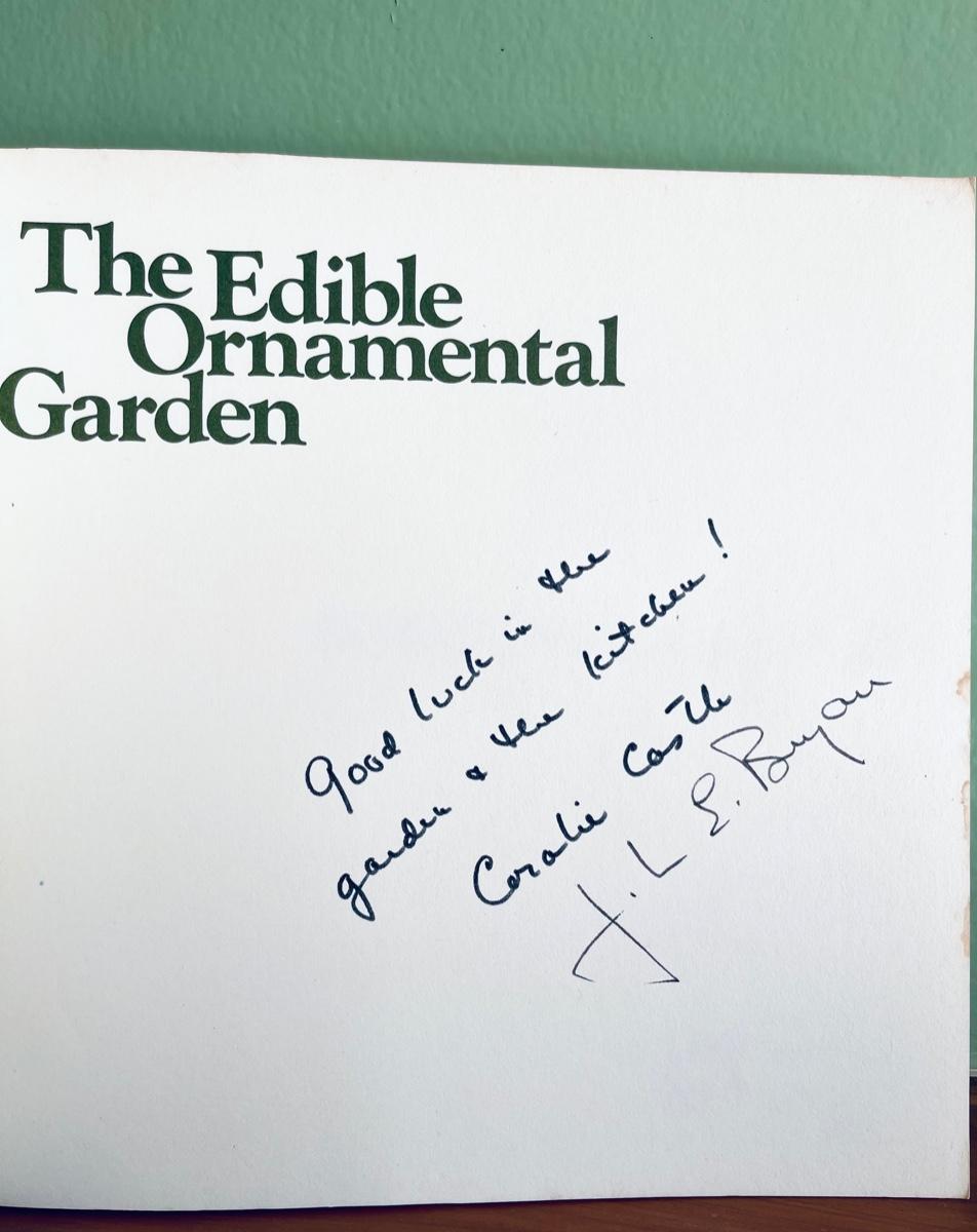 LOT 31 - The Edible Ornamental Garden by John Bryan and Coralie Castle. This book is signed by both authors with a personal inscription from Coralie. Copyright 1974. Inside page are clean and crisp. Some marks to page edges and slight yellowing to covers. Spine has creases.