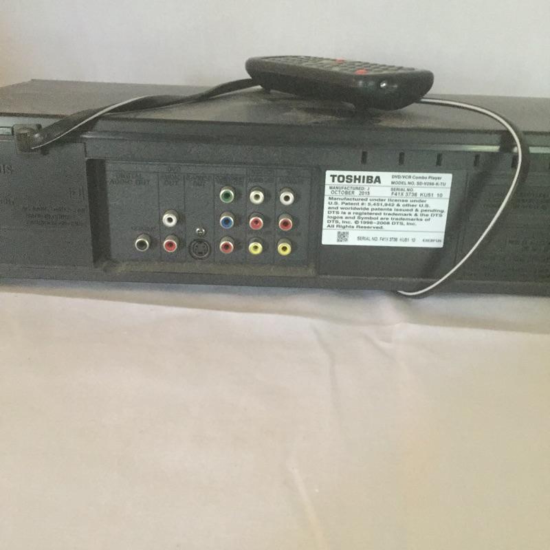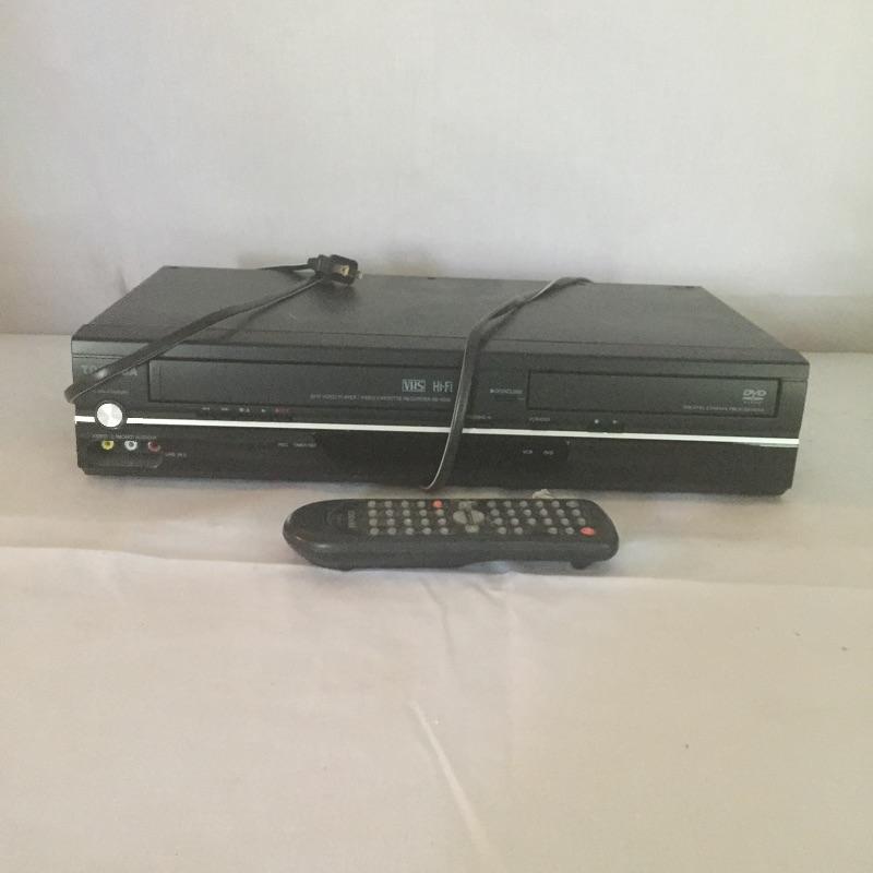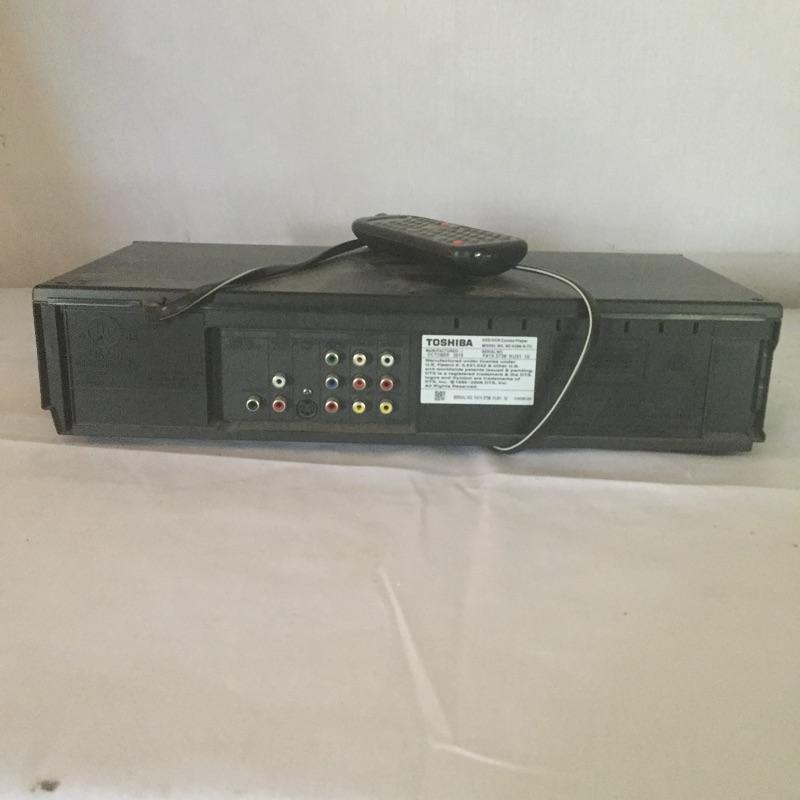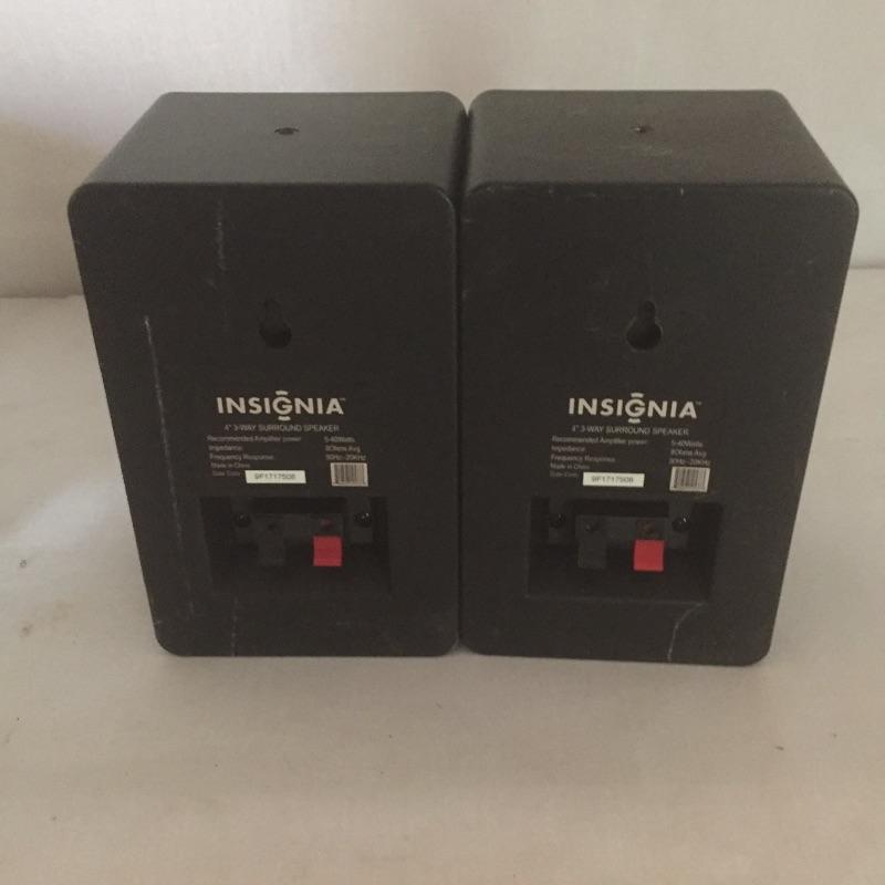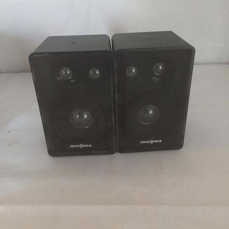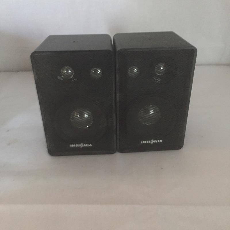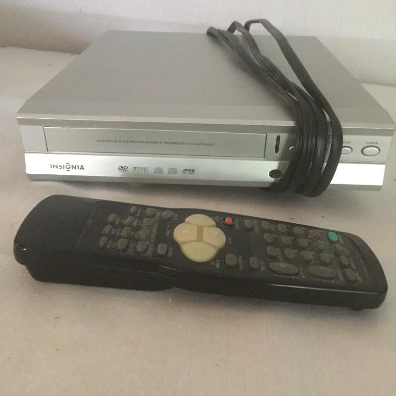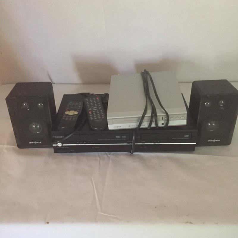Insignia DVD player with remote and Toshiba DVD and VHS player with remote and a pair of Insignia speakers.