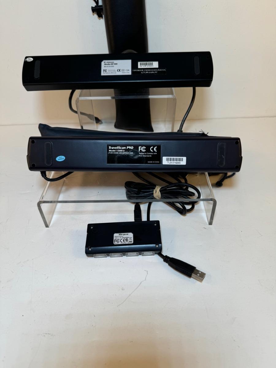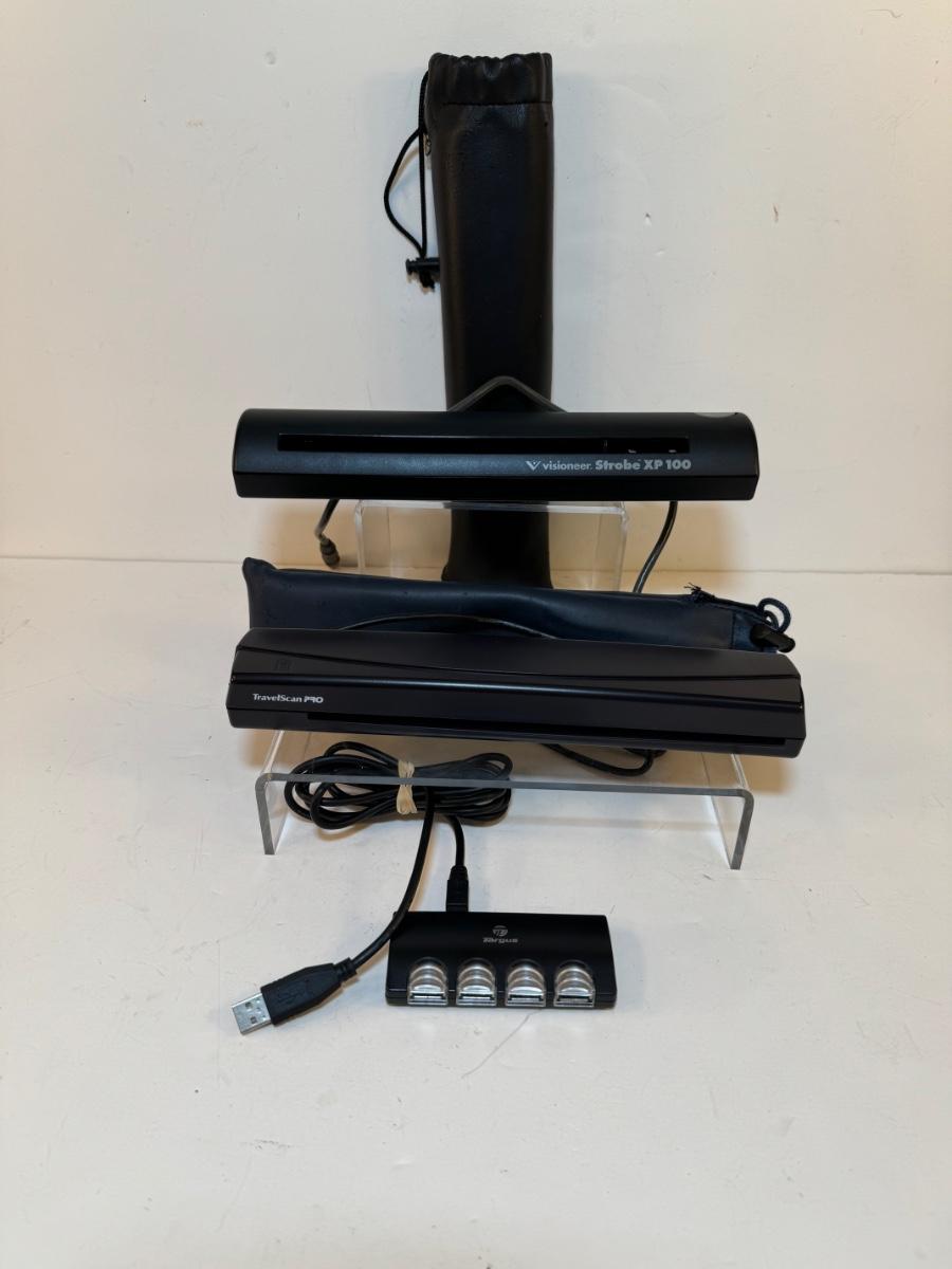 Includes visioneer Strobe XP100 scanner, TravelScan Pro scanner Model 2300U and Targus USB bank PA055 U.