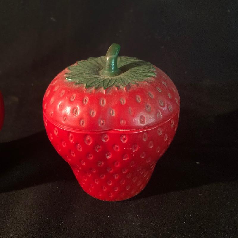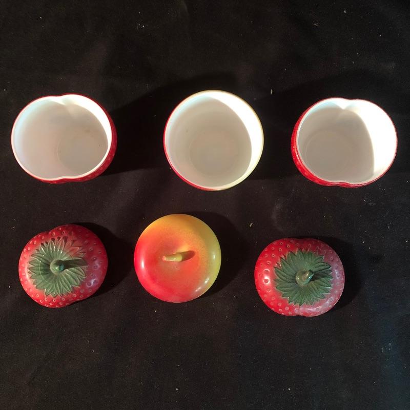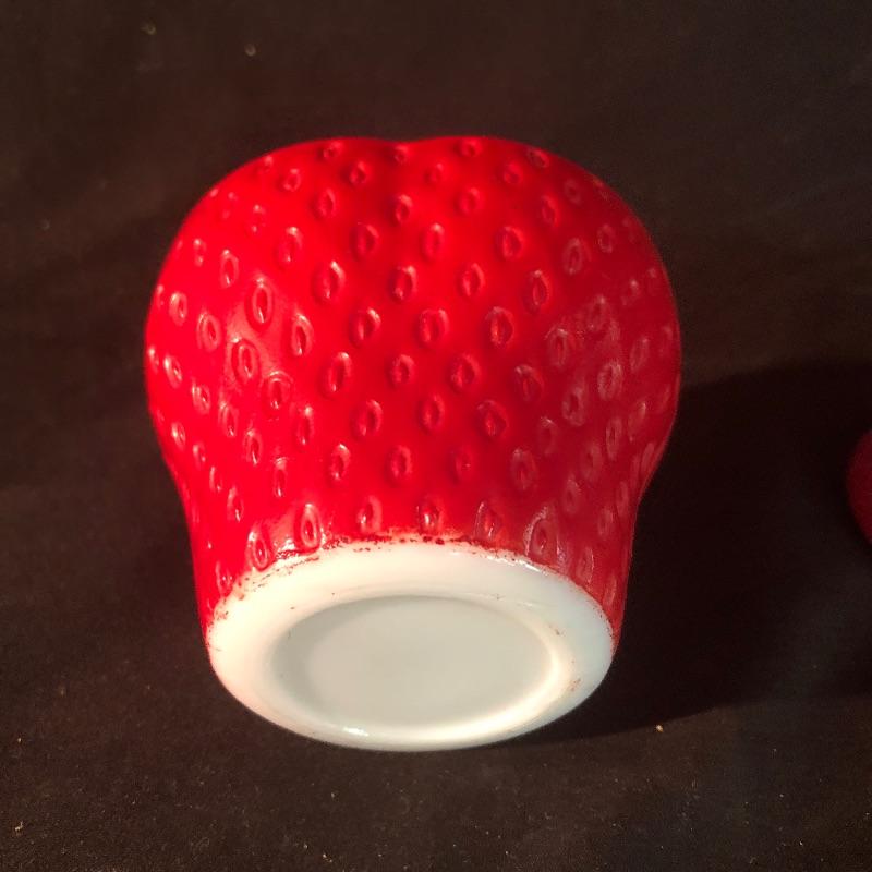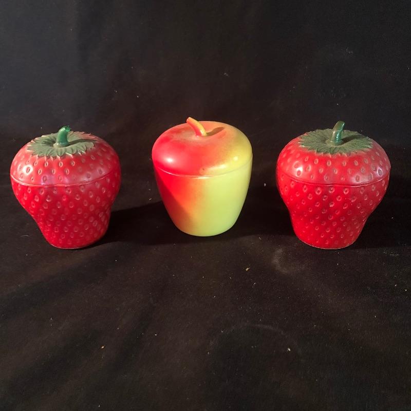 This lot comes with three milk glass fruit dishes; two strawberries and an apple. These three dishes are beautiful and unique, and would add a little spice to your dish ware collection! They can be used for decoration or for holding your various trinkets. Each stand aprox 3.5” tall. Shipping available.