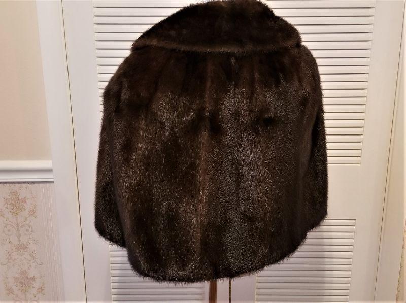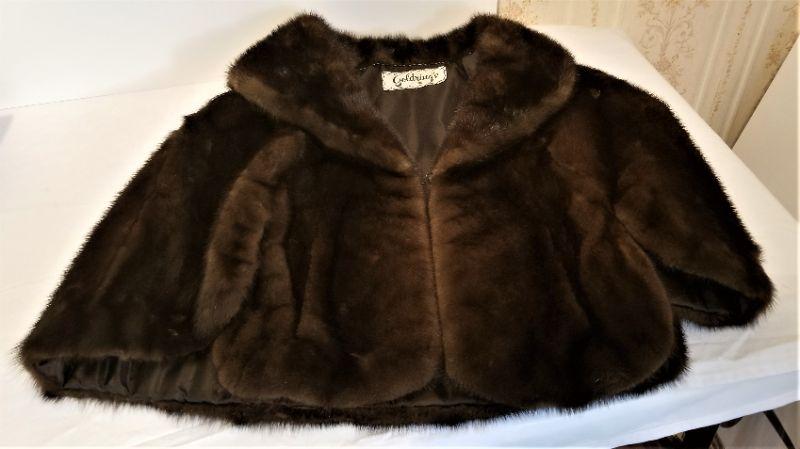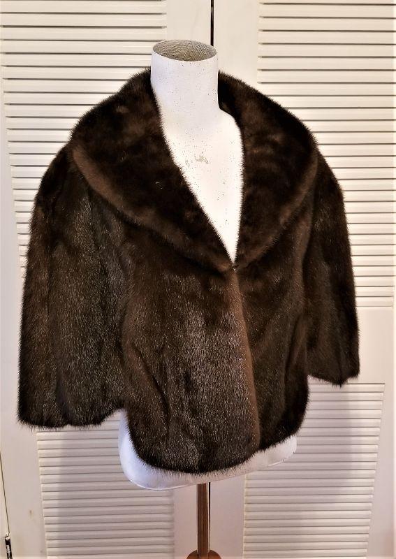 This vintage mink is a neat cross between a coat and a stole - fits over the shoulders and has slits for your arms to go through - nice soft, lush pelts - Goldring label. Hook closure in front. Dark Brown. This would best fit someone sized 8-14.