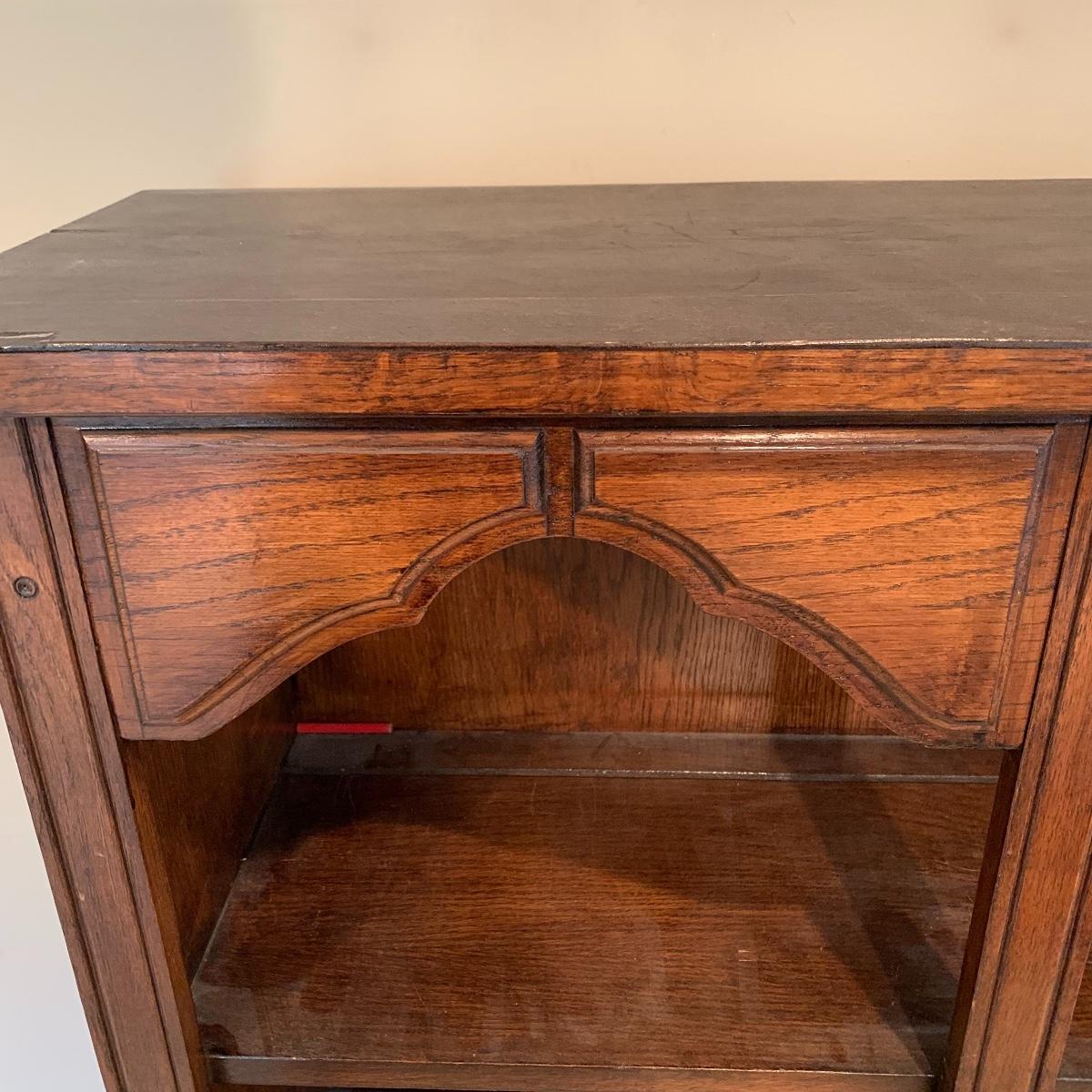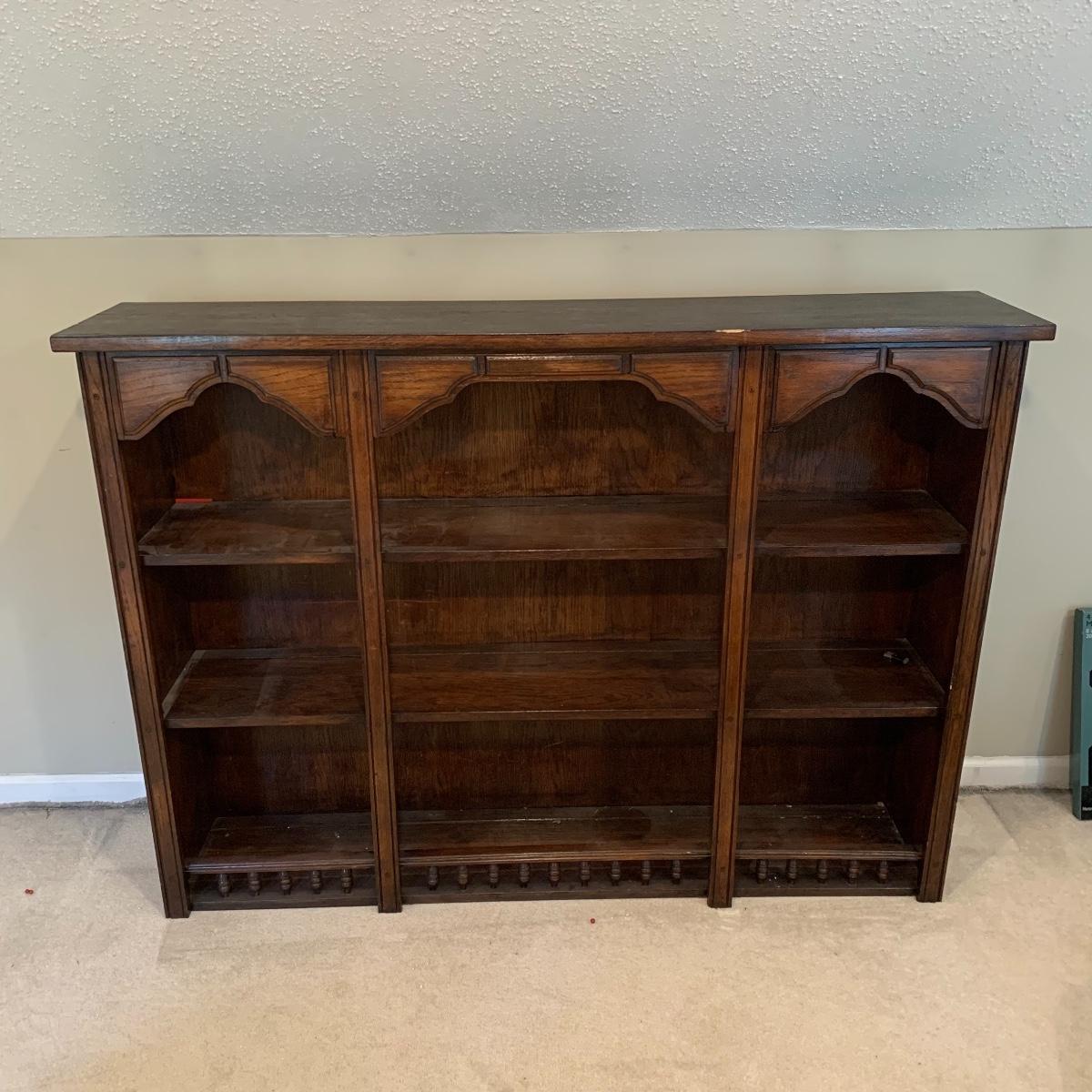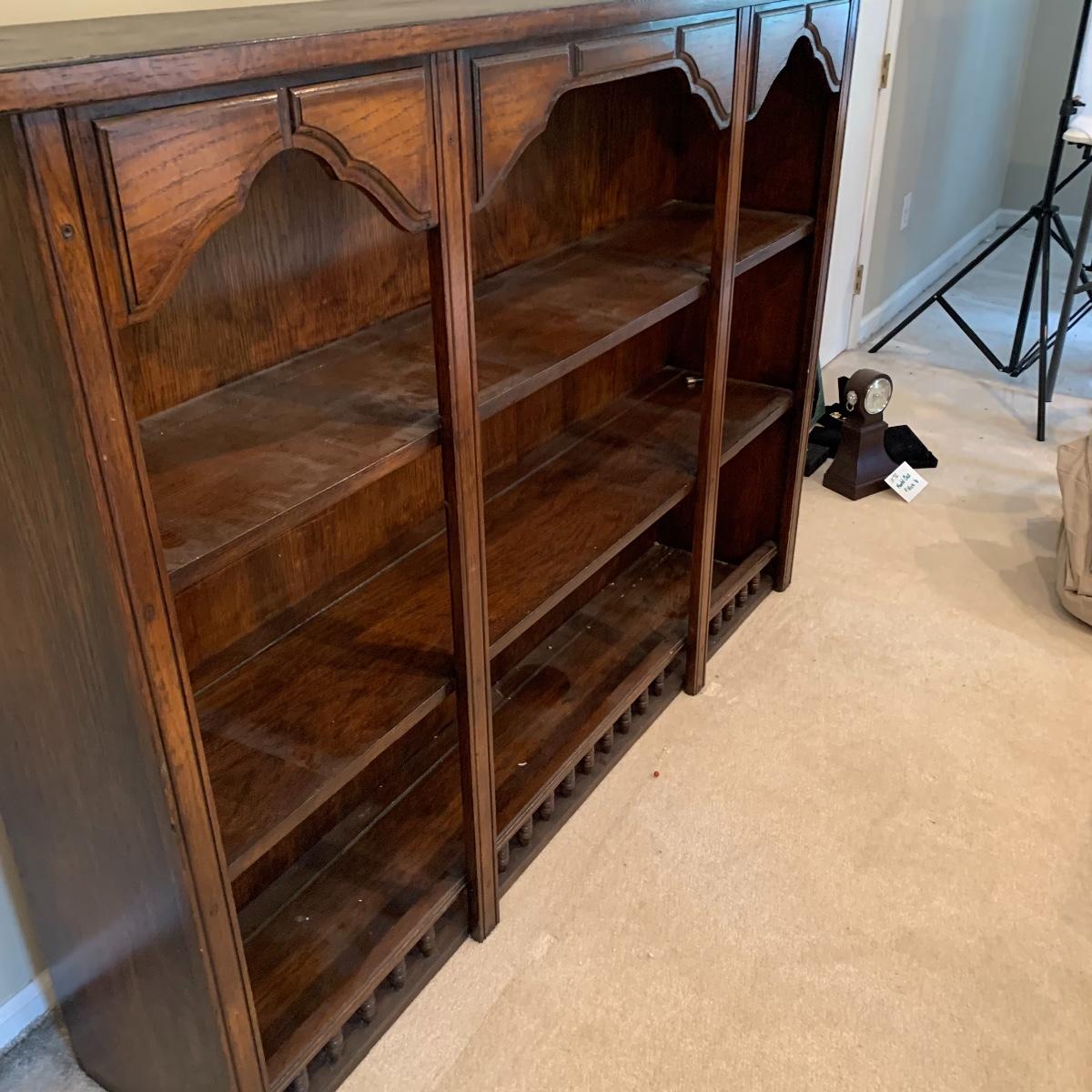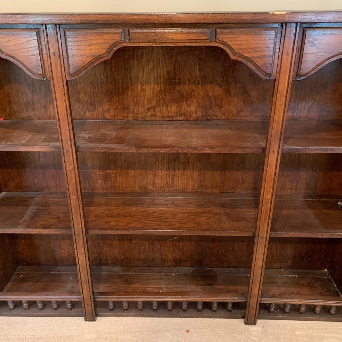 Don’t miss this vintage book case. It’s got enough room for lots of heavy books or items. It’s stained dark with cool trim details( see pics). There is some damage, a scratch on the front as well as two drilled holes the were probably for electric cords. It measures 68” wide X 45” tall X 13” deep. Please bring help to move this item. It needs to come down a flight of stairs and is all one piece. Local pickup only.