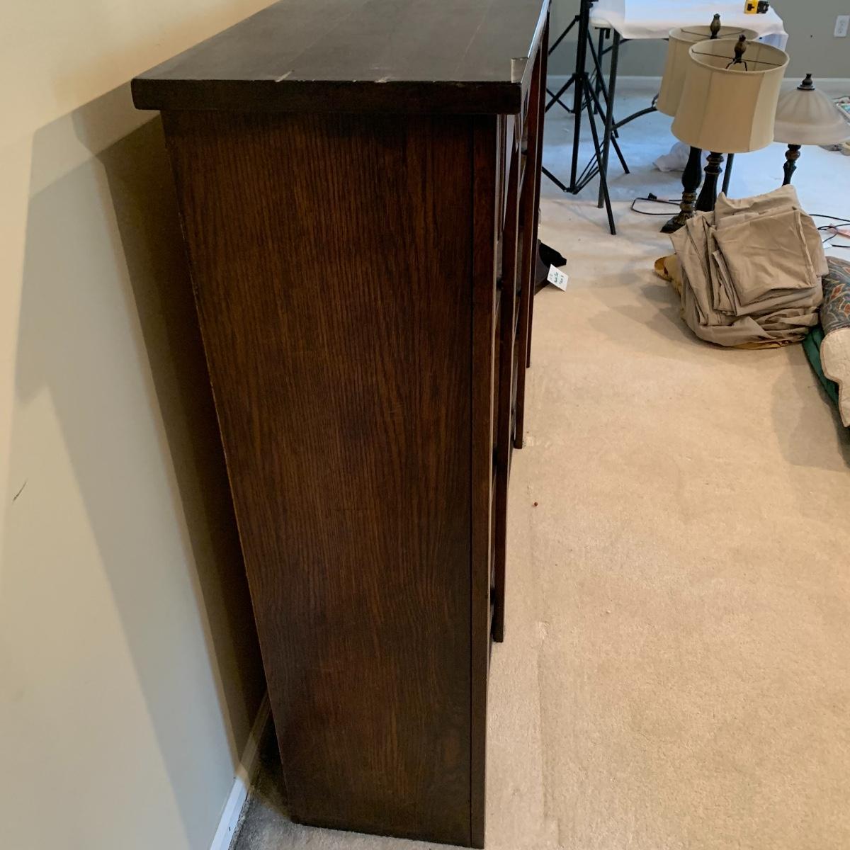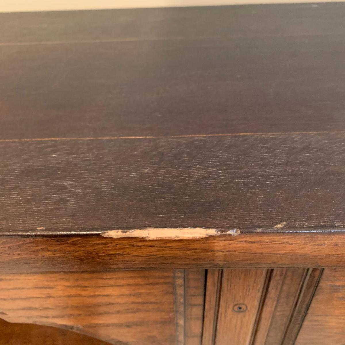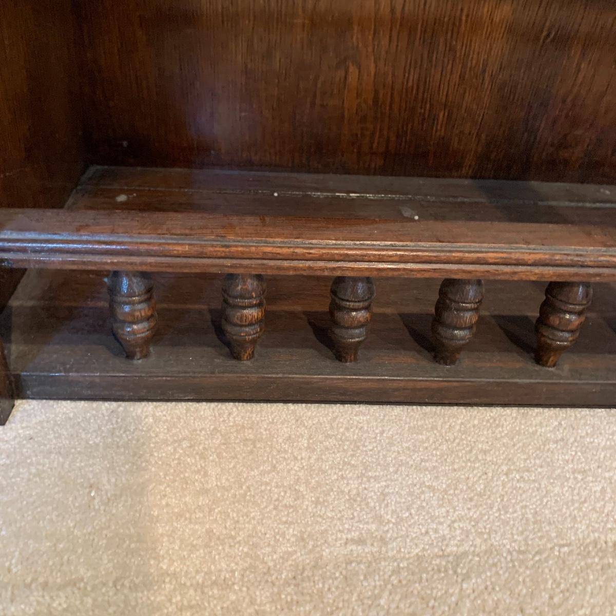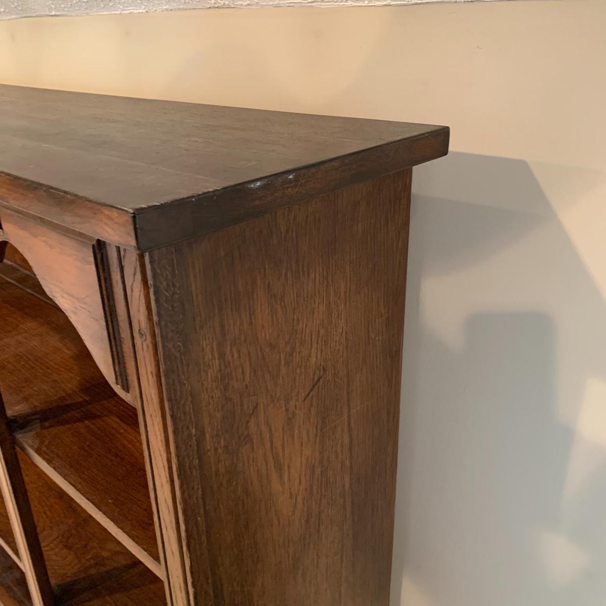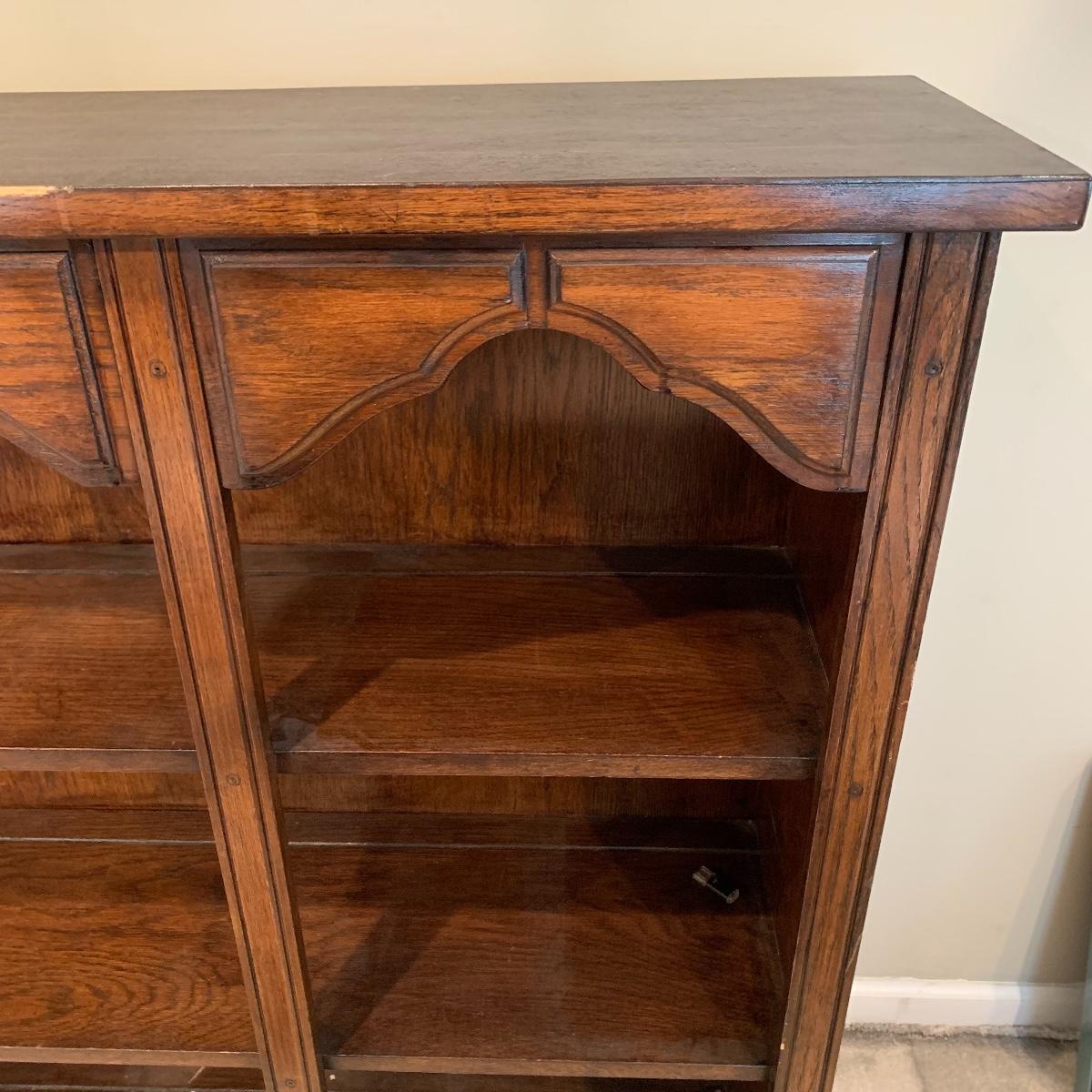 Don’t miss this vintage book case. It’s got enough room for lots of heavy books or items. It’s stained dark with cool trim details( see pics). There is some damage, a scratch on the front as well as two drilled holes the were probably for electric cords. It measures 68” wide X 45” tall X 13” deep. Please bring help to move this item. It needs to come down a flight of stairs and is all one piece. Local pickup only.
